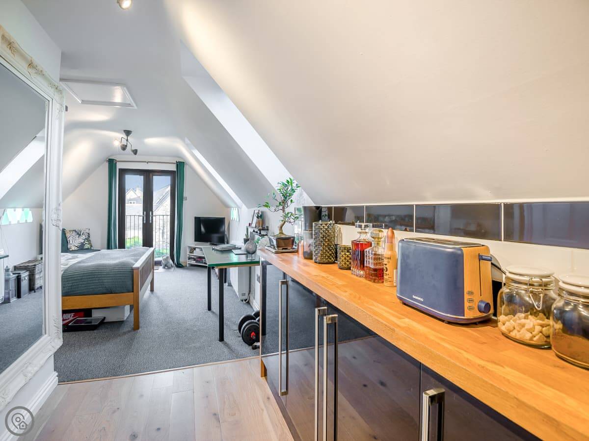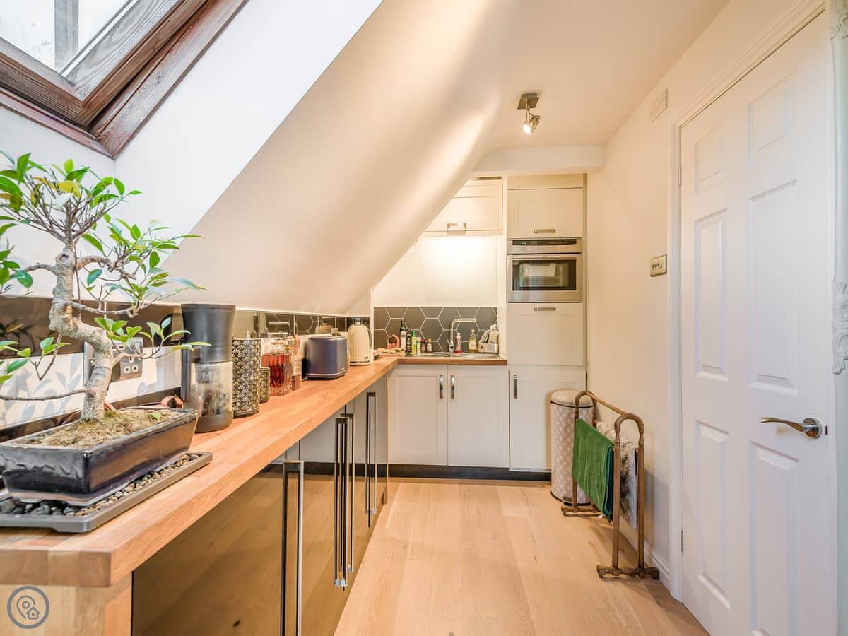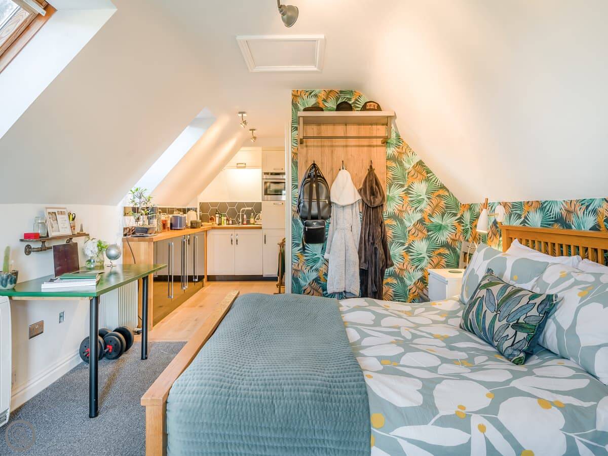 The kitchen has what you need if you want to cook. There’s a shower room. The bed is a double. We include all the bedding and towels.
