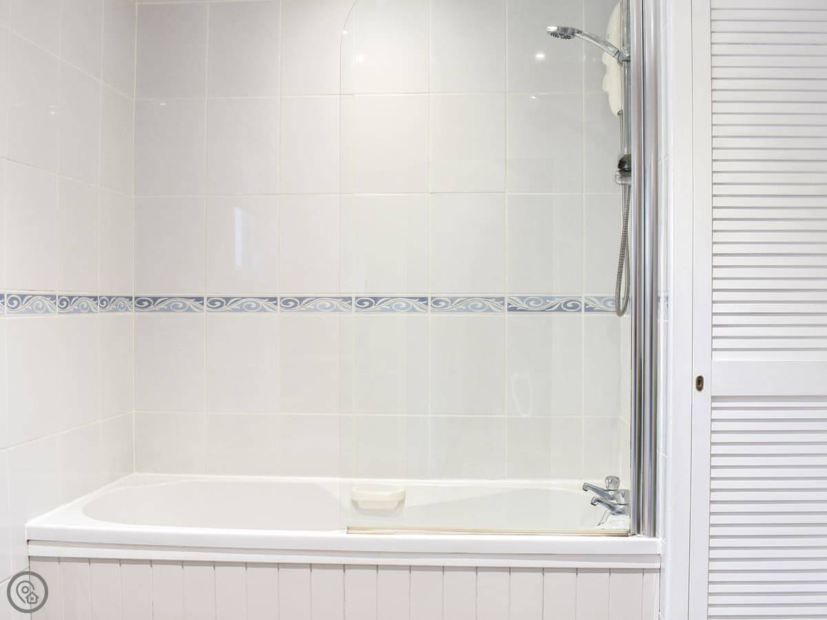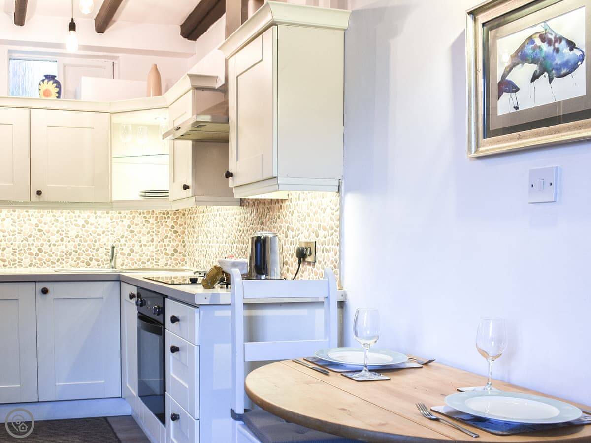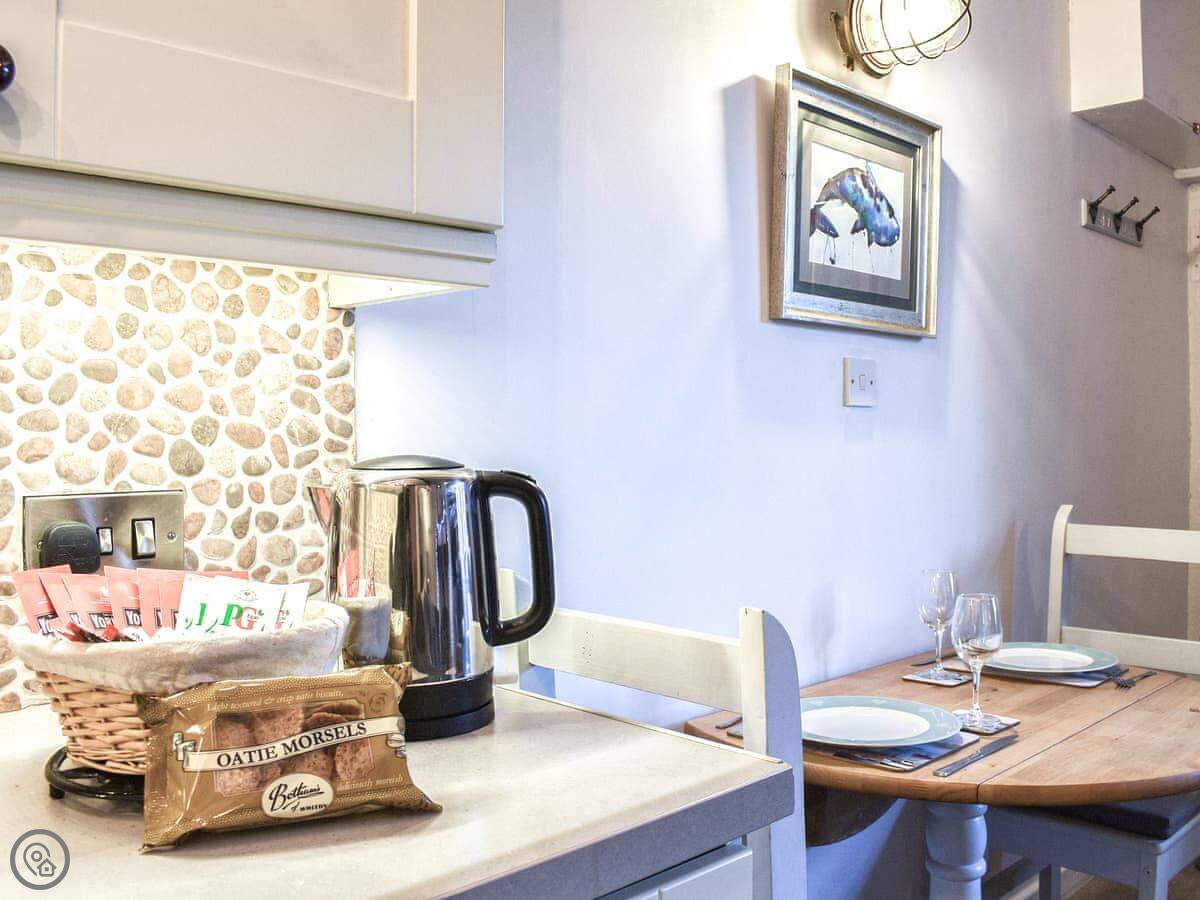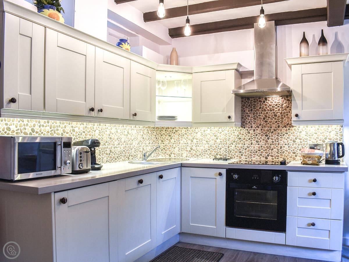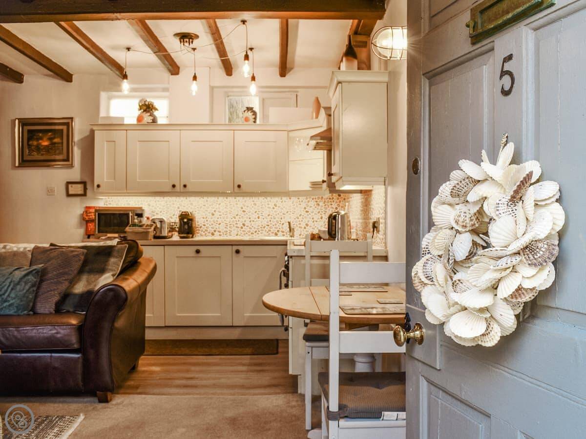The living area is open plan. It's got a decent kitchen, a sofa, and a TV. The WiFi is okay. You can see the whalebone arch on the West Cliff from the front bedroom window.