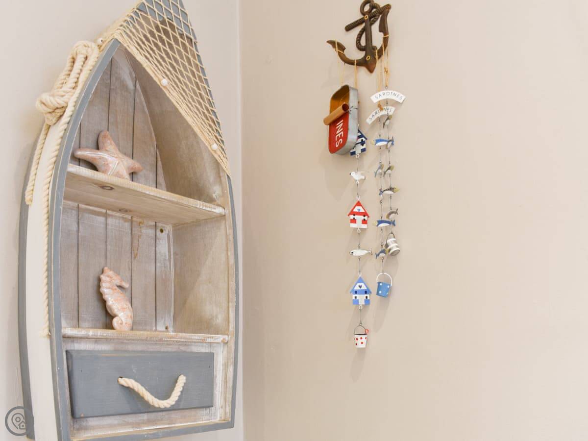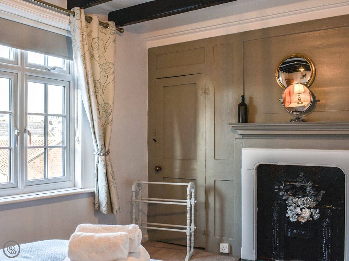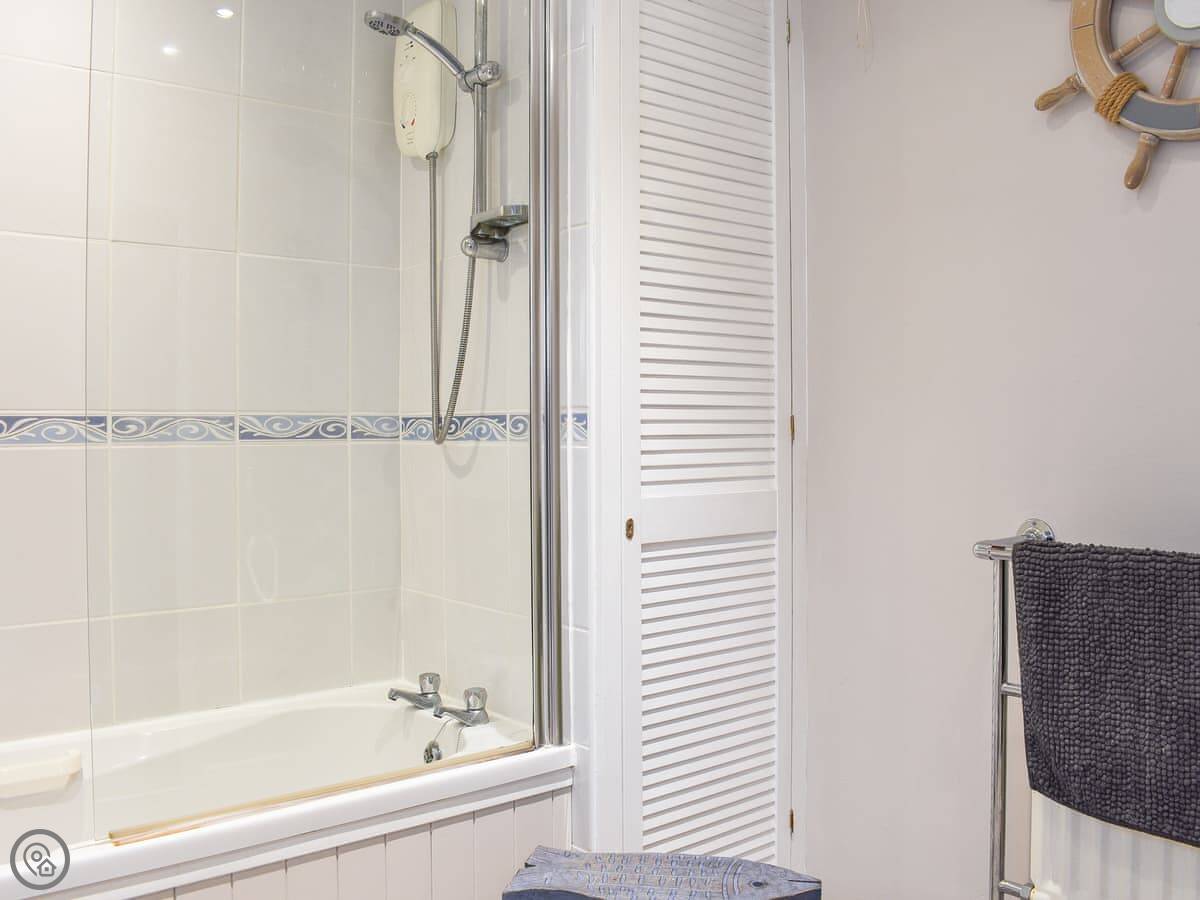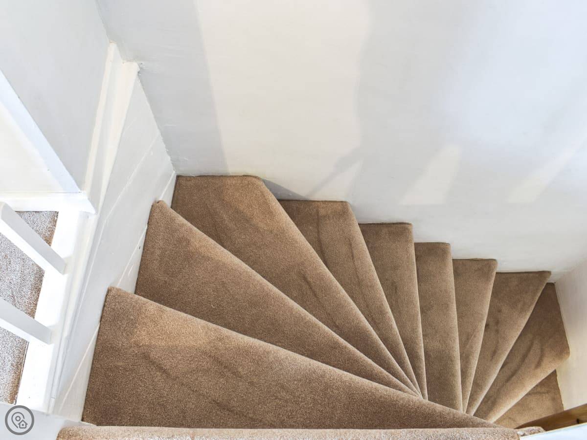 It sleeps five in two bedrooms. One double is on the first floor, and there's a second bedroom on the top floor with a double and a single bed under the eaves. There's one proper bathroom inside. The stairs are steep and a bit narrow, because it's an old cottage. They're fine, but watch your head.