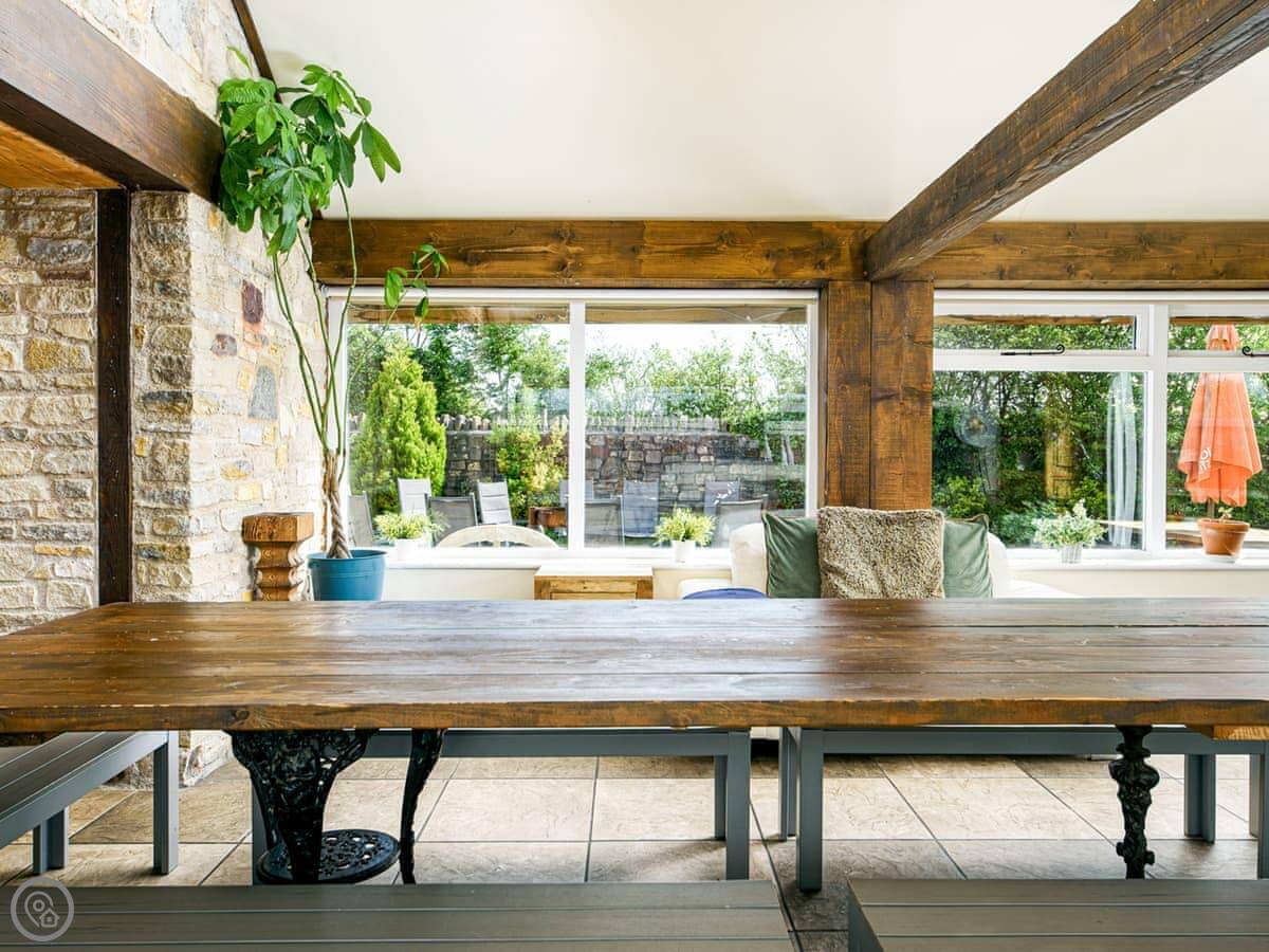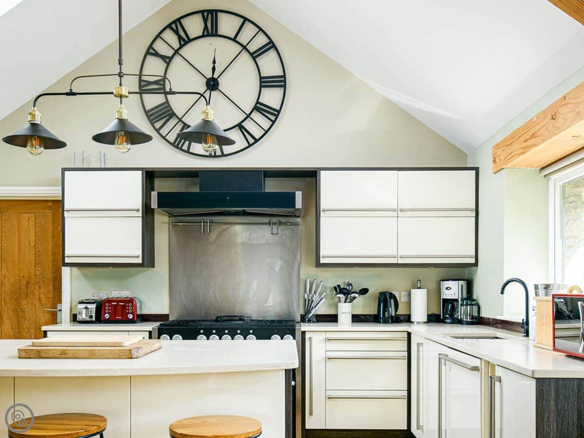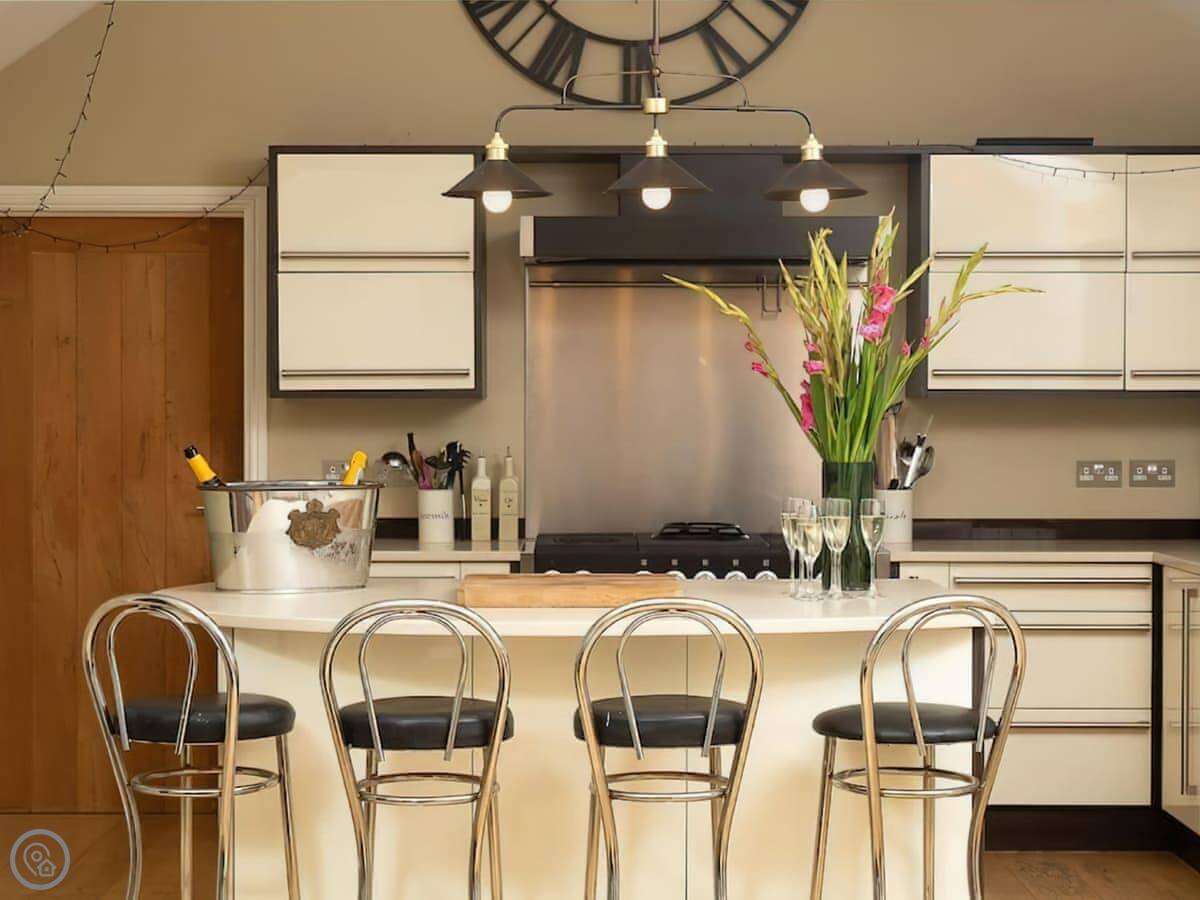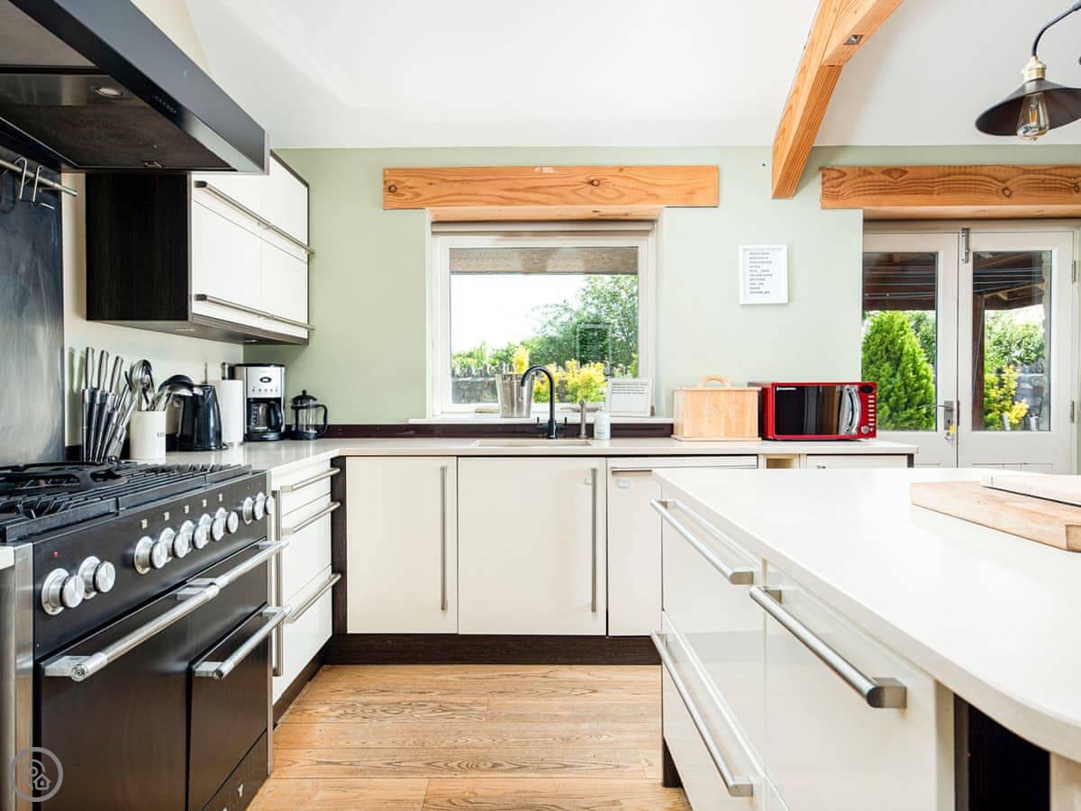 In terms of what's here, it's got a big dining table, a fully fitted kitchen with an island, a washing machine, dishwasher, and WiFi. Bedding and towels are included. You can bring up to two dogs.
