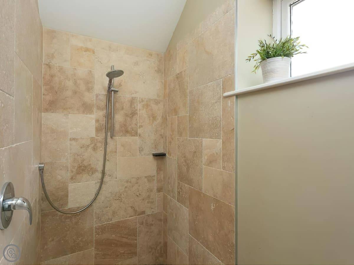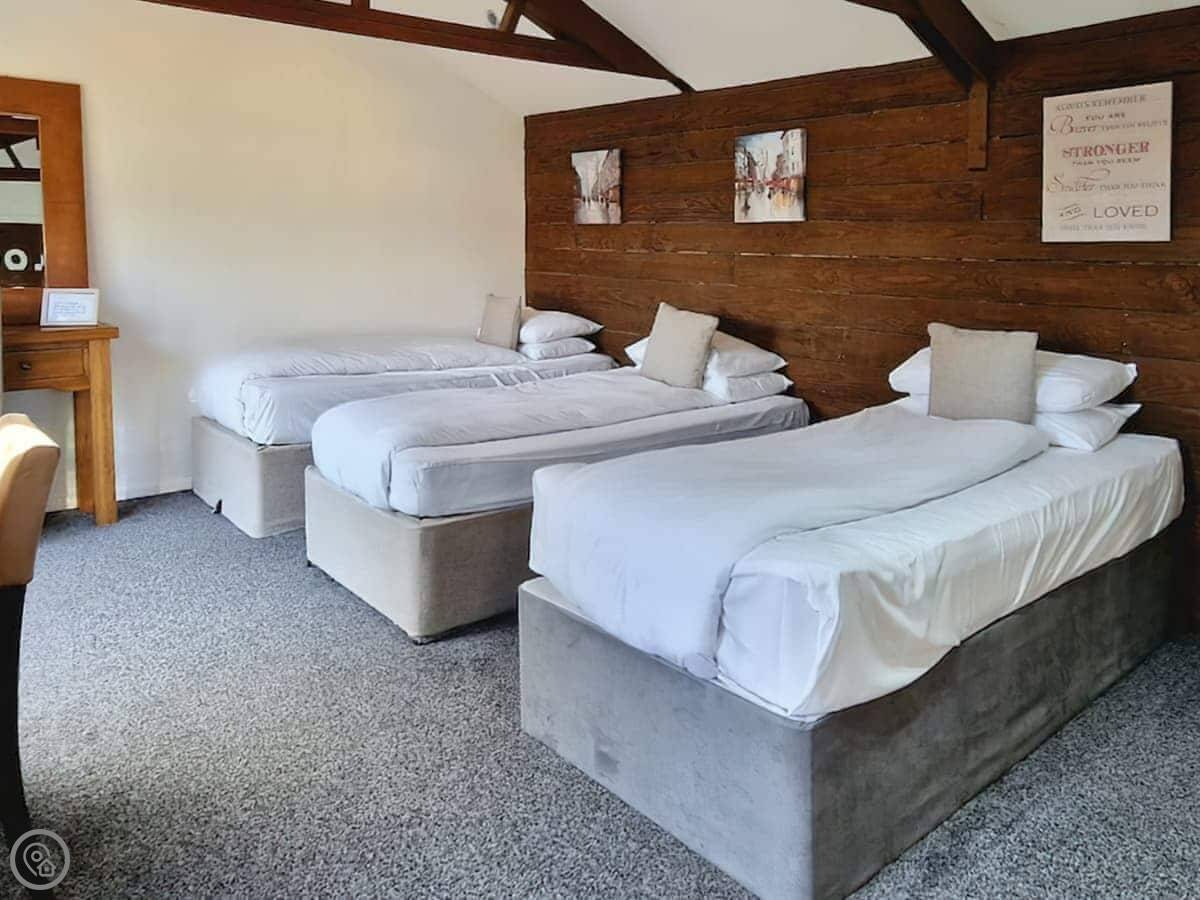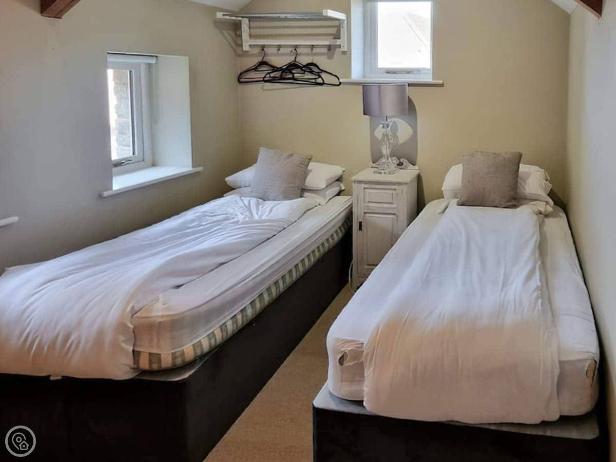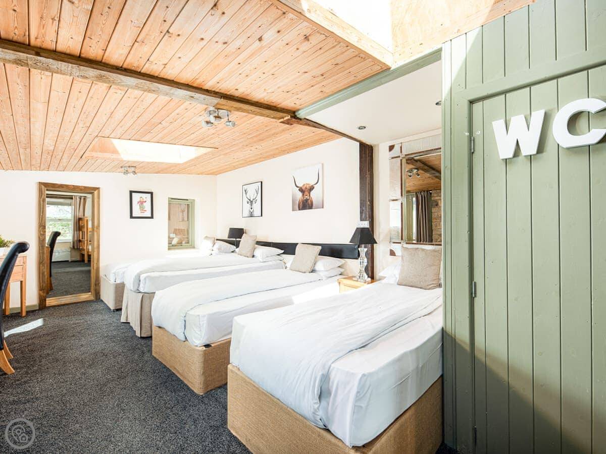 There are six bedrooms and three bathrooms upstairs. It's got a 4 Star rating, so it's well-equipped and comfortable for a group that size. The stairs are a bit steep in parts, because it's an old barn, but they're fine.