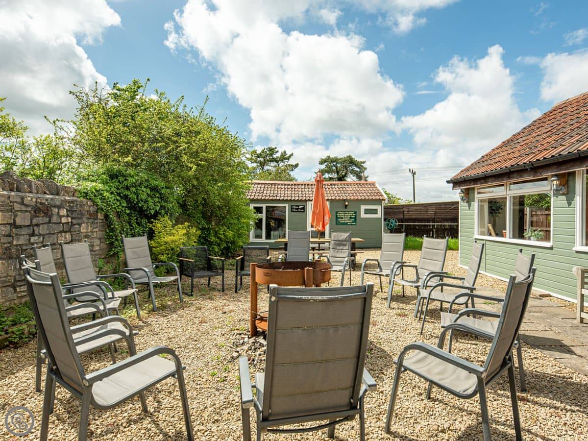 The garden has a patio with a BBQ, a firepit, and a hot tub. You can park about ten cars on the drive.