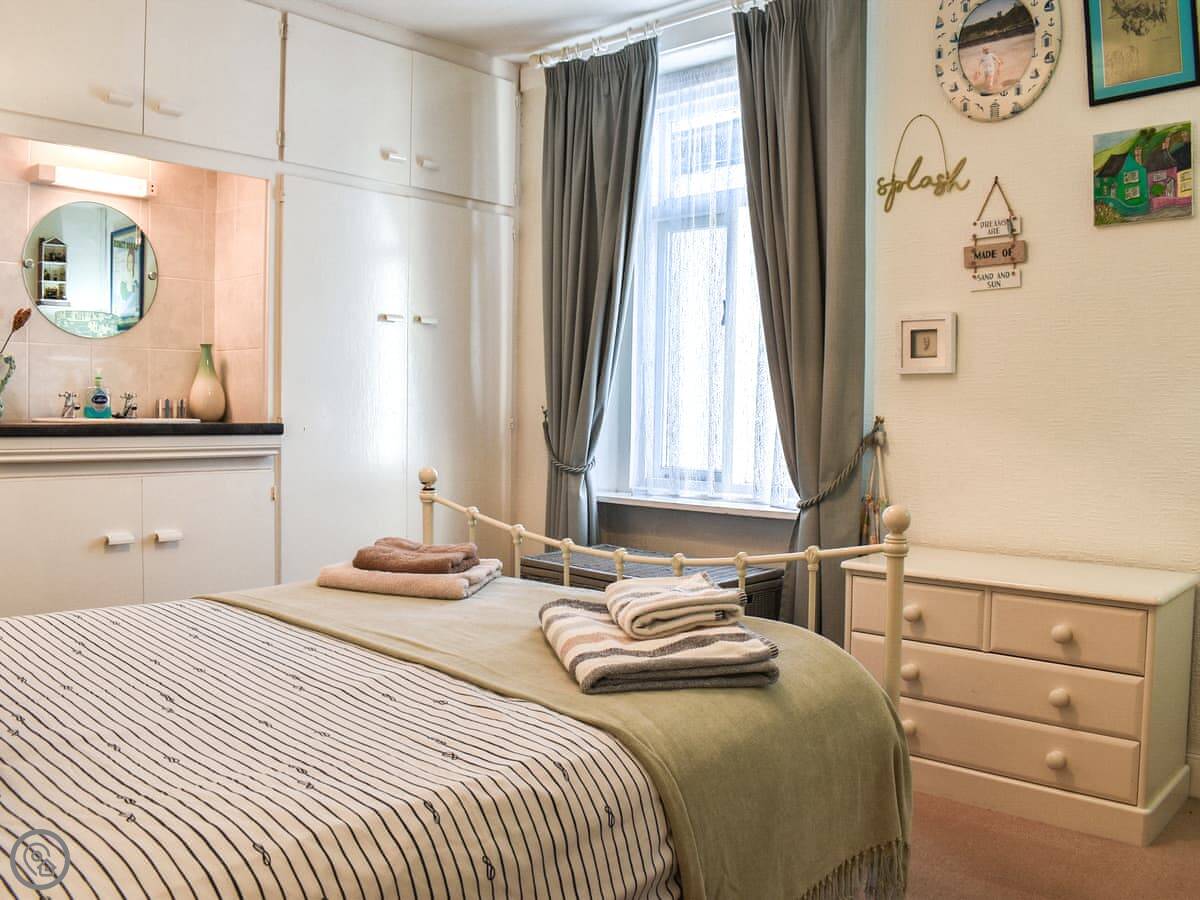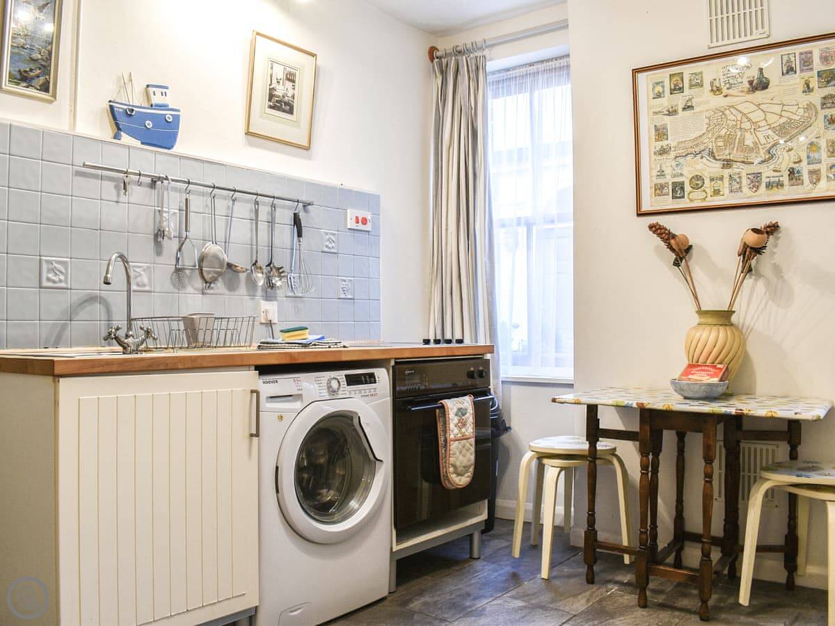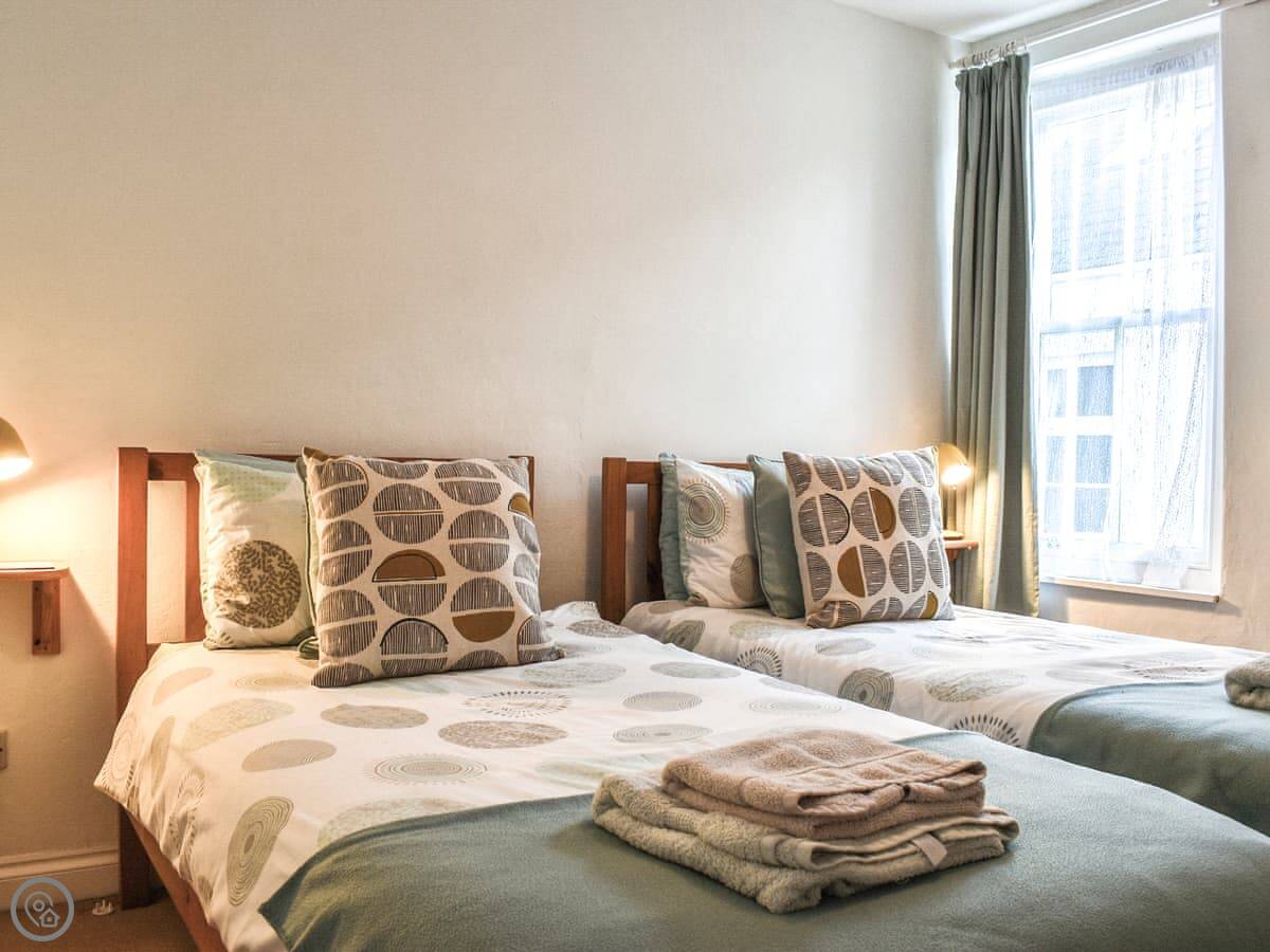 It sleeps four. Two bedrooms upstairs, one bathroom downstairs which you get to from the kitchen. The stairs are cottage stairs, so they're steep. There's a small back yard.