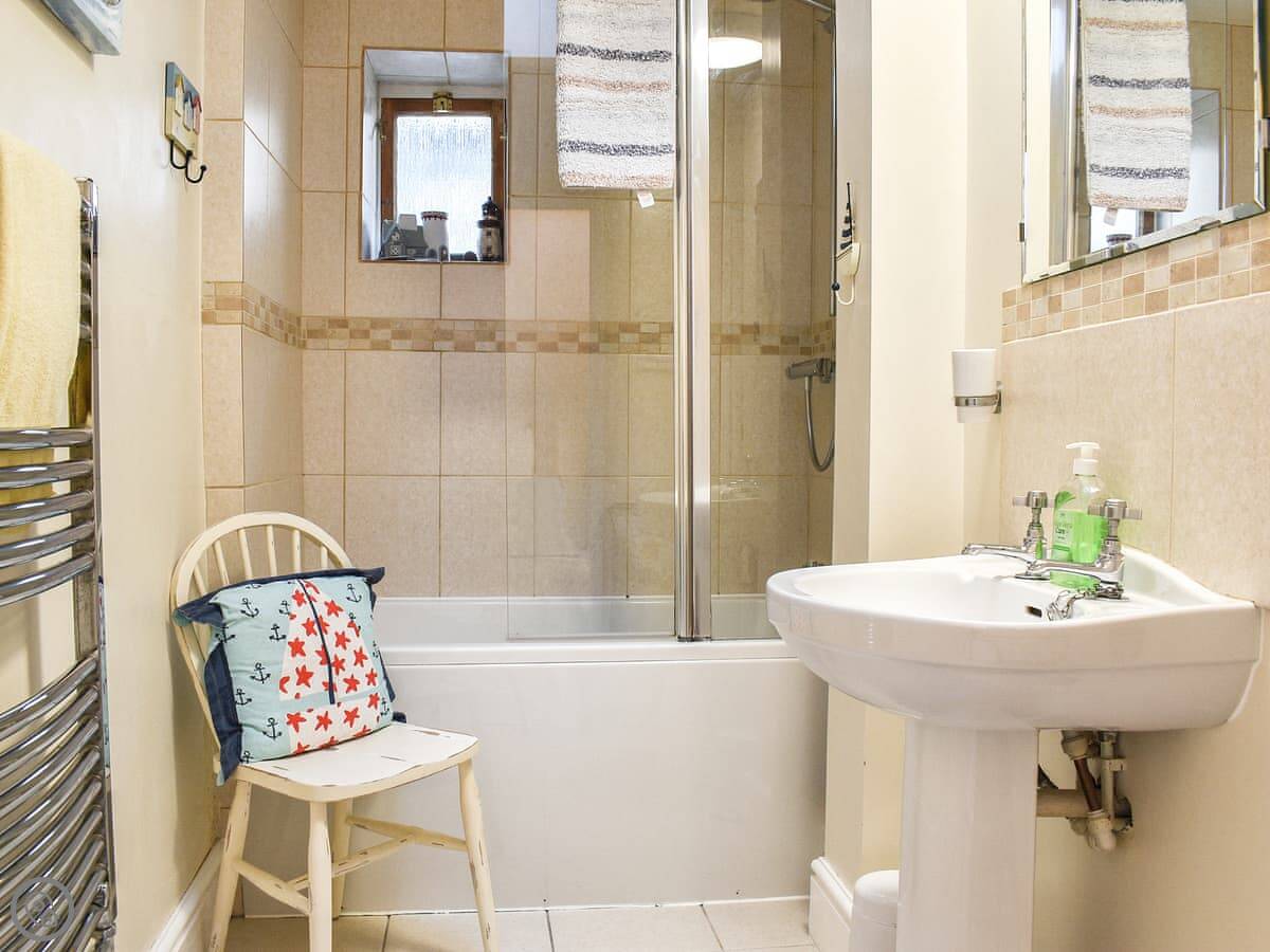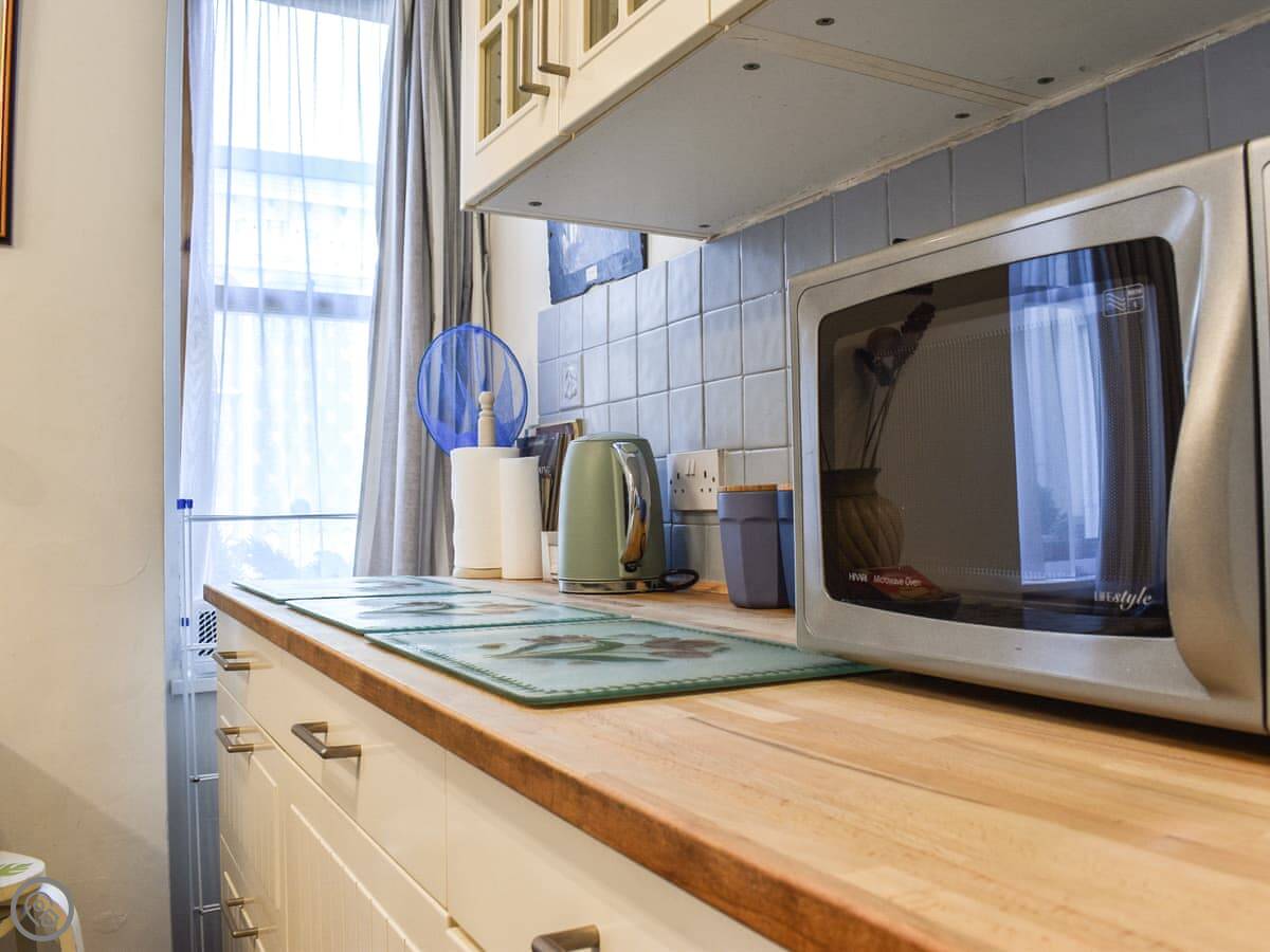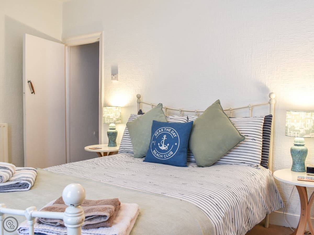It sleeps four. Two bedrooms upstairs, one bathroom downstairs which you get to from the kitchen. The stairs are cottage stairs, so they're steep. There's a small back yard.