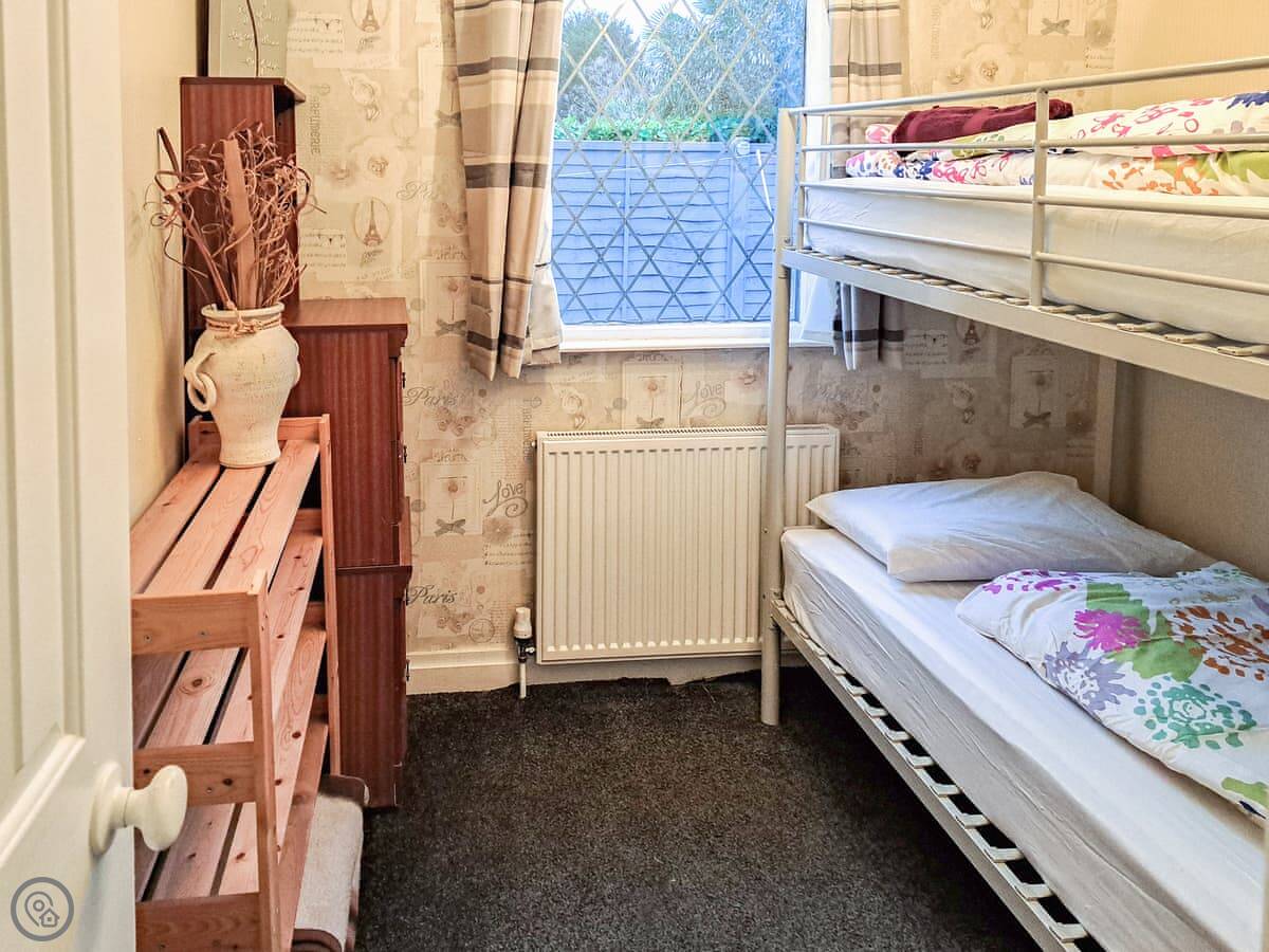 It sleeps six. Three bedrooms, one bathroom. It's got a 4 Star rating. Simple, clean, comfortable. The garden is enclosed, which is good if you've got kids or dogs. You're allowed up to two pets.