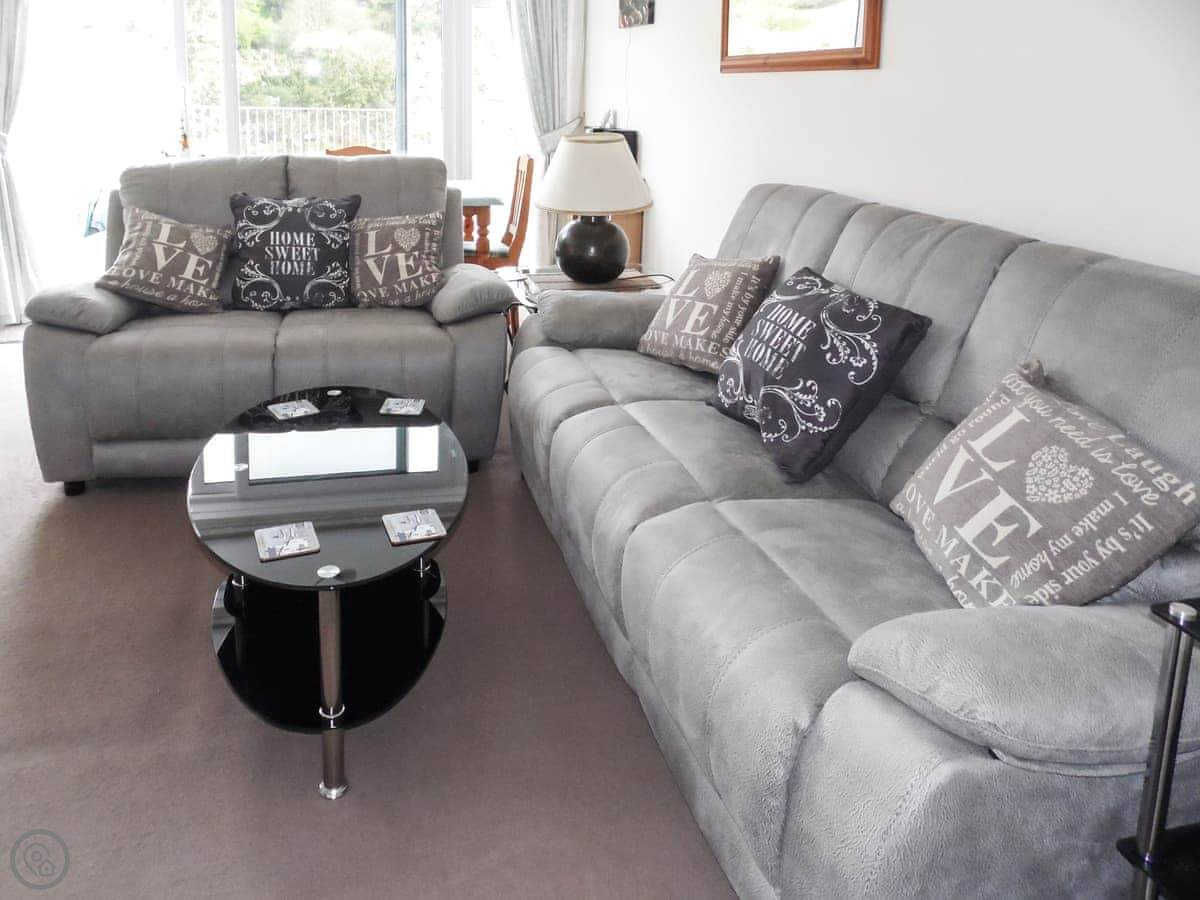 The living space is open-plan. There's a kitchen, a dining area, and two sofas. Everything's modern and it works. You've got a TV and WiFi. The big thing is the patio. It's large, secure, and looks straight out to sea.