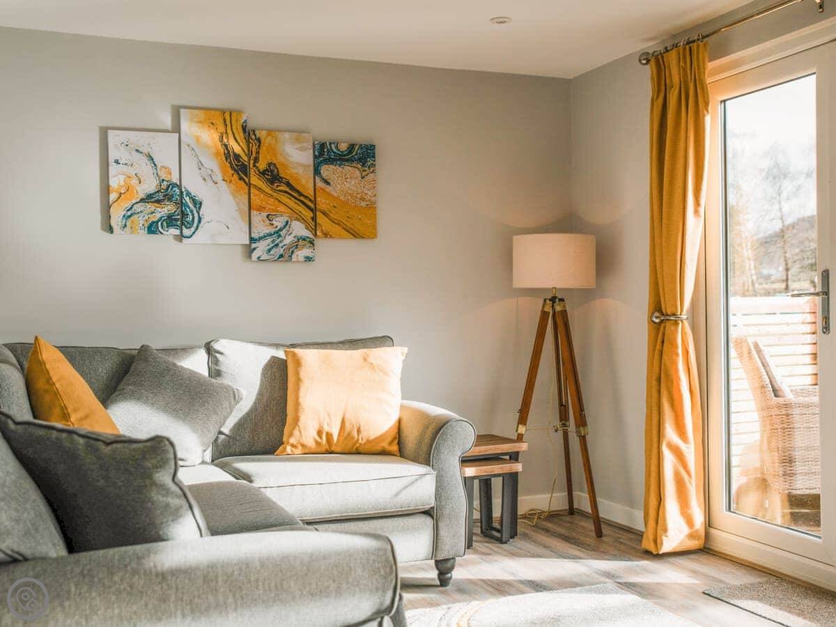The main room is open plan with patio doors out to a deck. The deck is enclosed and has a private hot tub. There are bathrobes provided. The deck has lights for the evening.