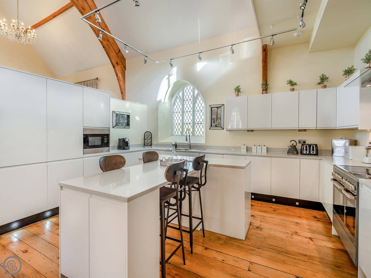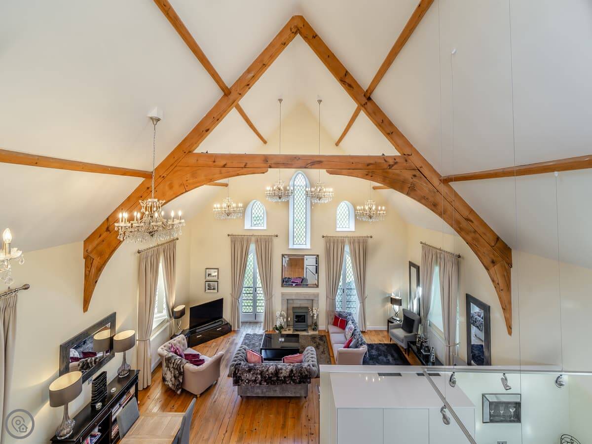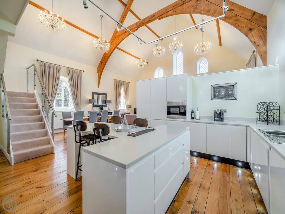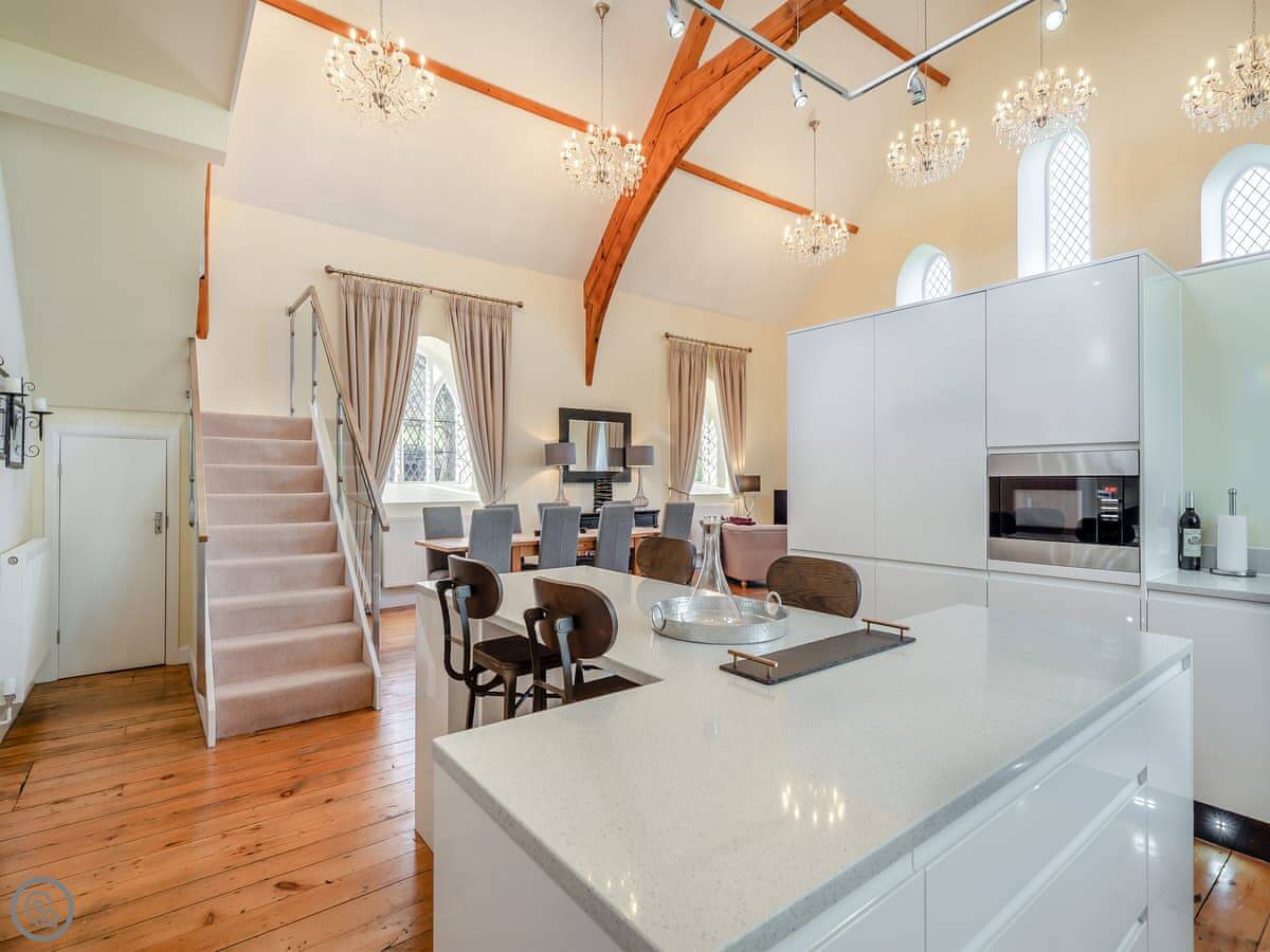 The main living space is all open plan under the old chapel roof. It feels very big and light. The stairs up to the mezzanine bedroom are glass-fronted, so if you’ve got younger kids or anyone wary of heights, just be aware of that.