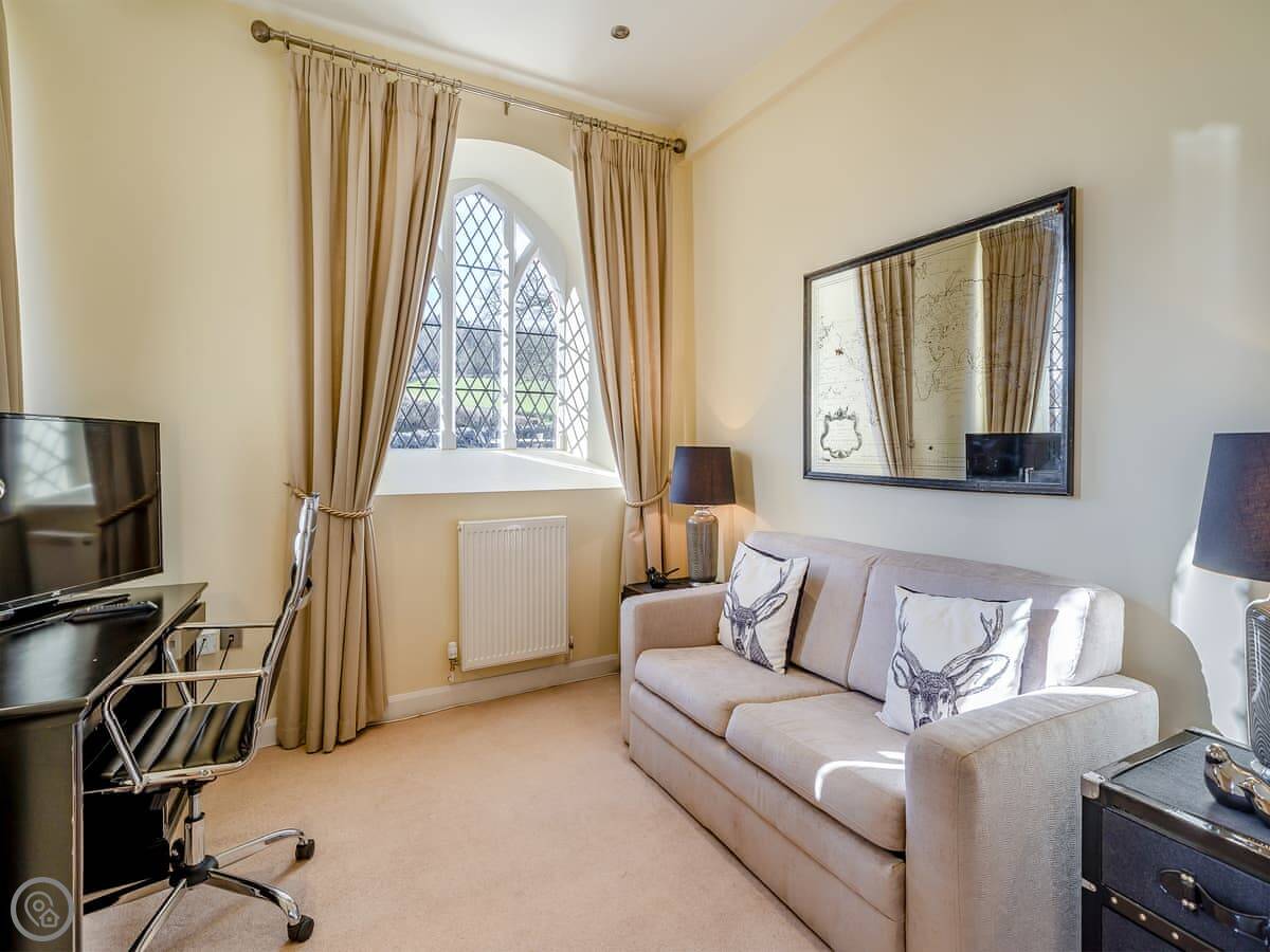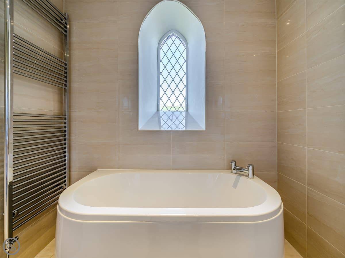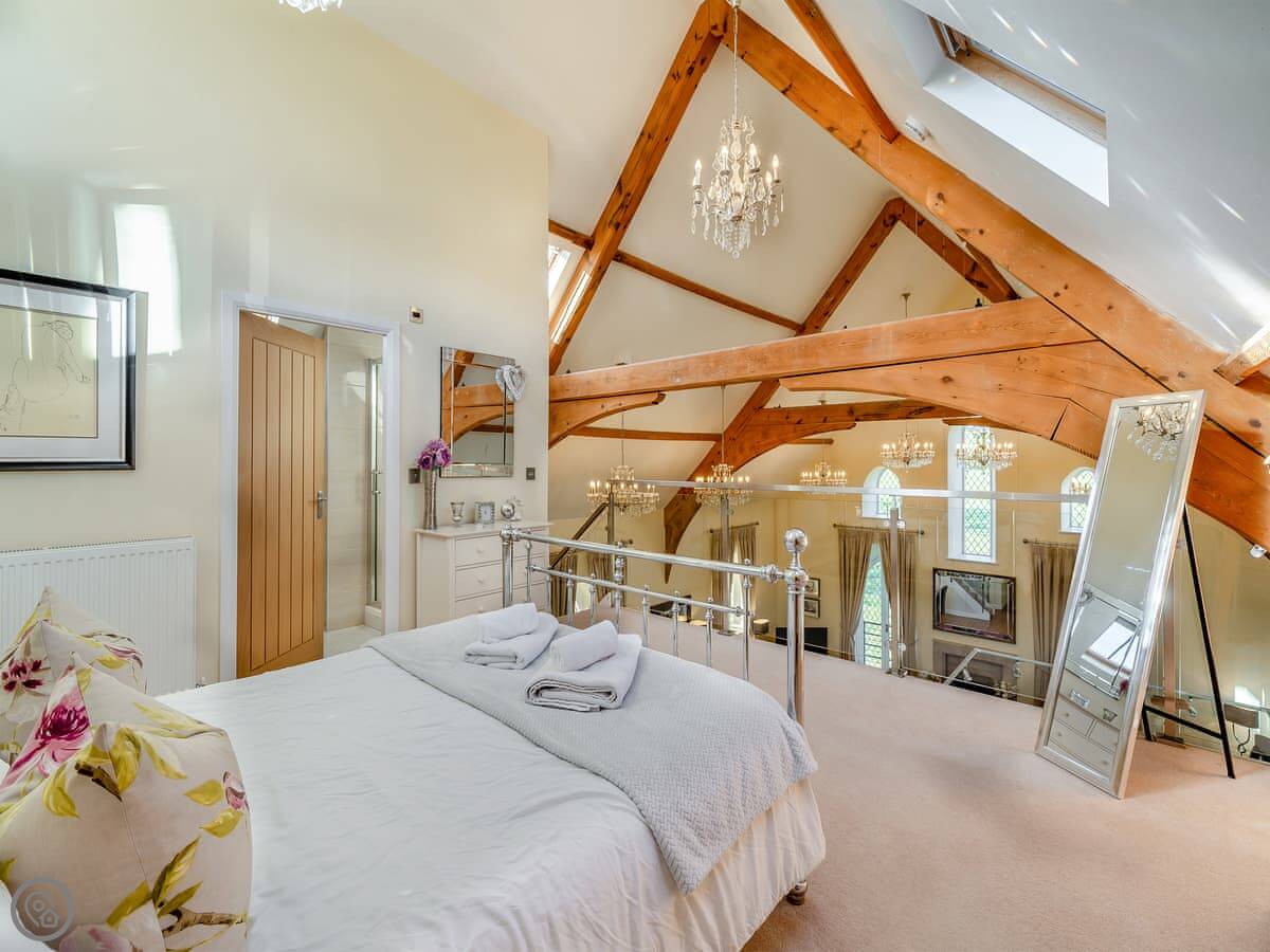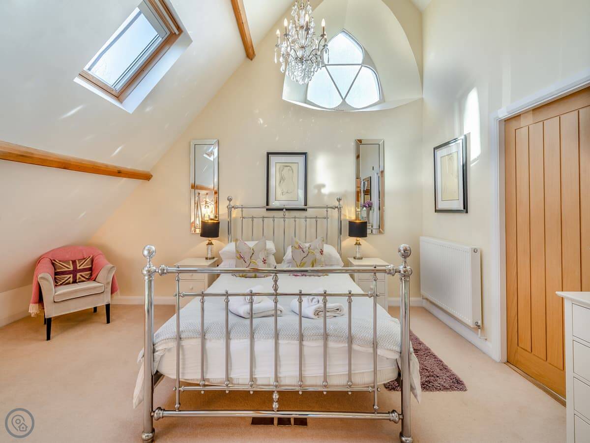The main living space is all open plan under the old chapel roof. It feels very big and light. The stairs up to the mezzanine bedroom are glass-fronted, so if you’ve got younger kids or anyone wary of heights, just be aware of that.