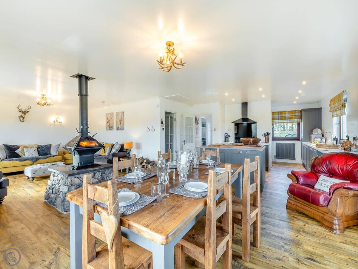 Inside, it's all open plan. The wood burner is in the middle of the living and dining space. It heats the place up quickly. The kitchen has everything, and there's a separate utility room with the washing machine.