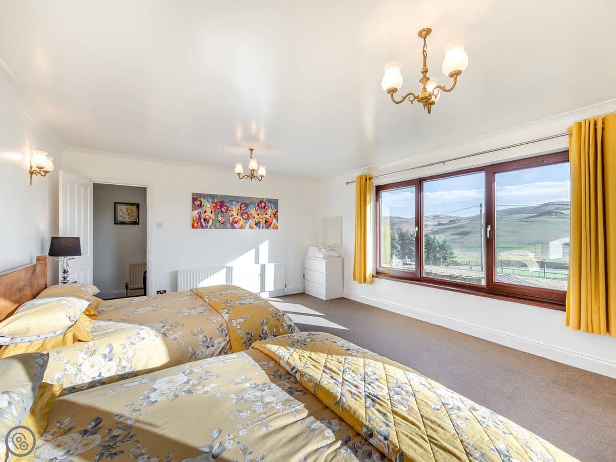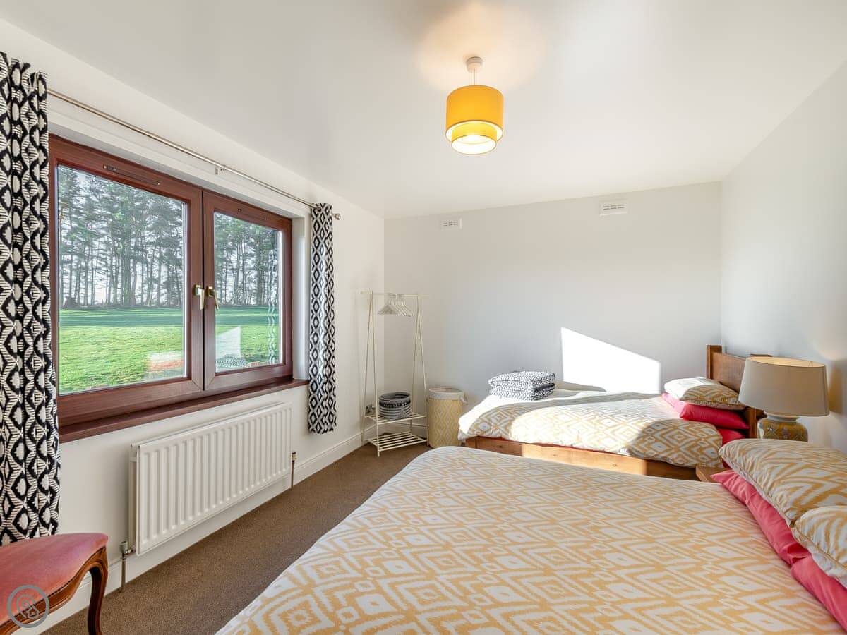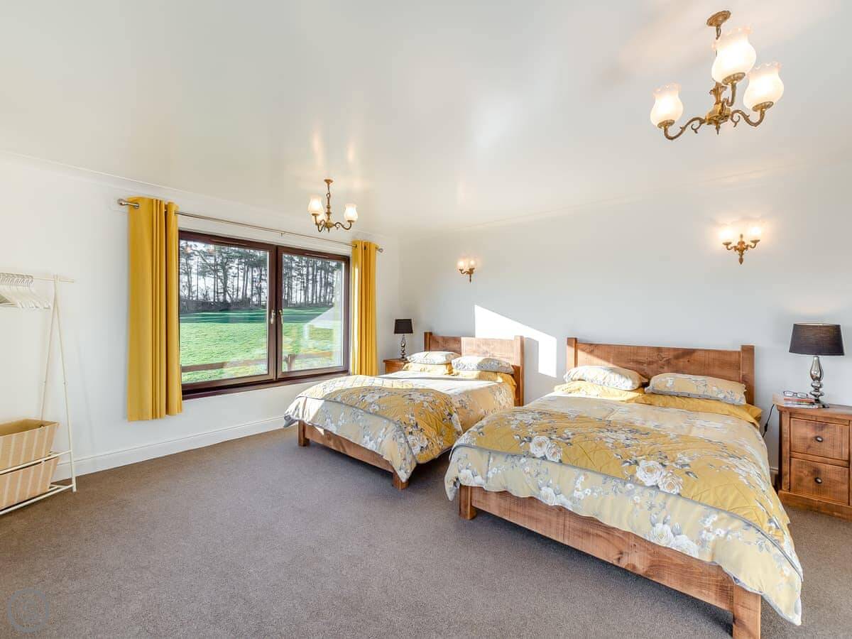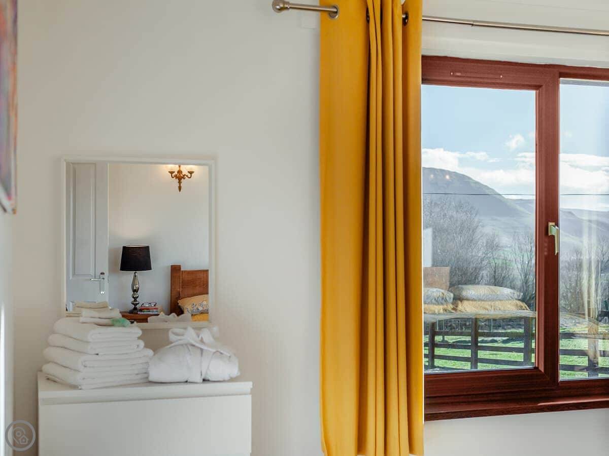 It sleeps six, in three bedrooms. Two have single beds and the main one has a king size. The head of that bed lines up with the window, so you get the view first thing. There are two shower rooms. Both have walk-in showers.