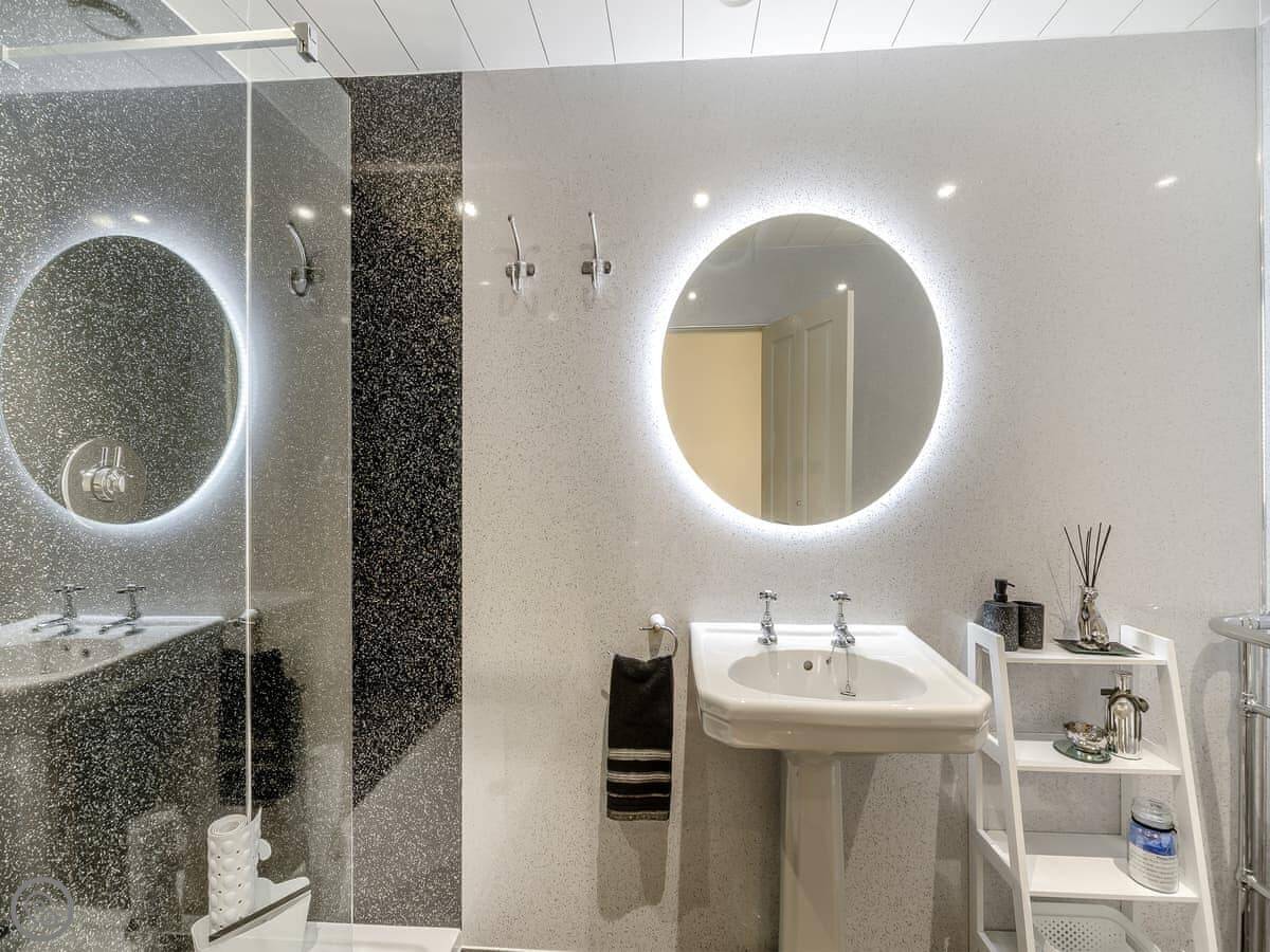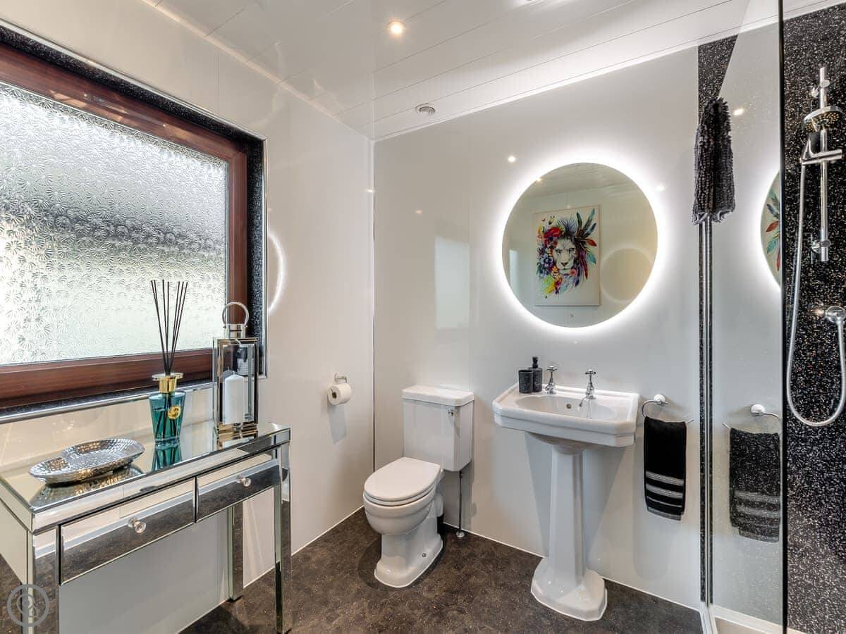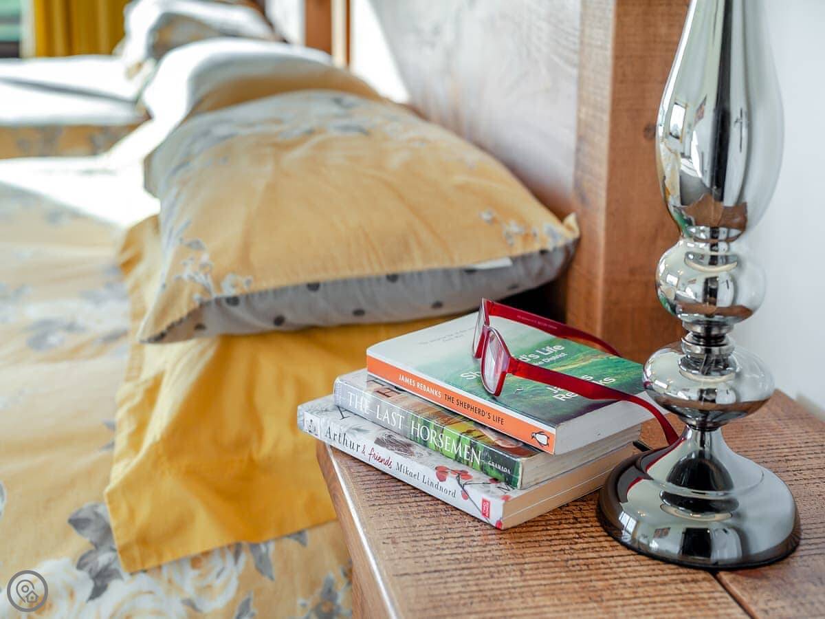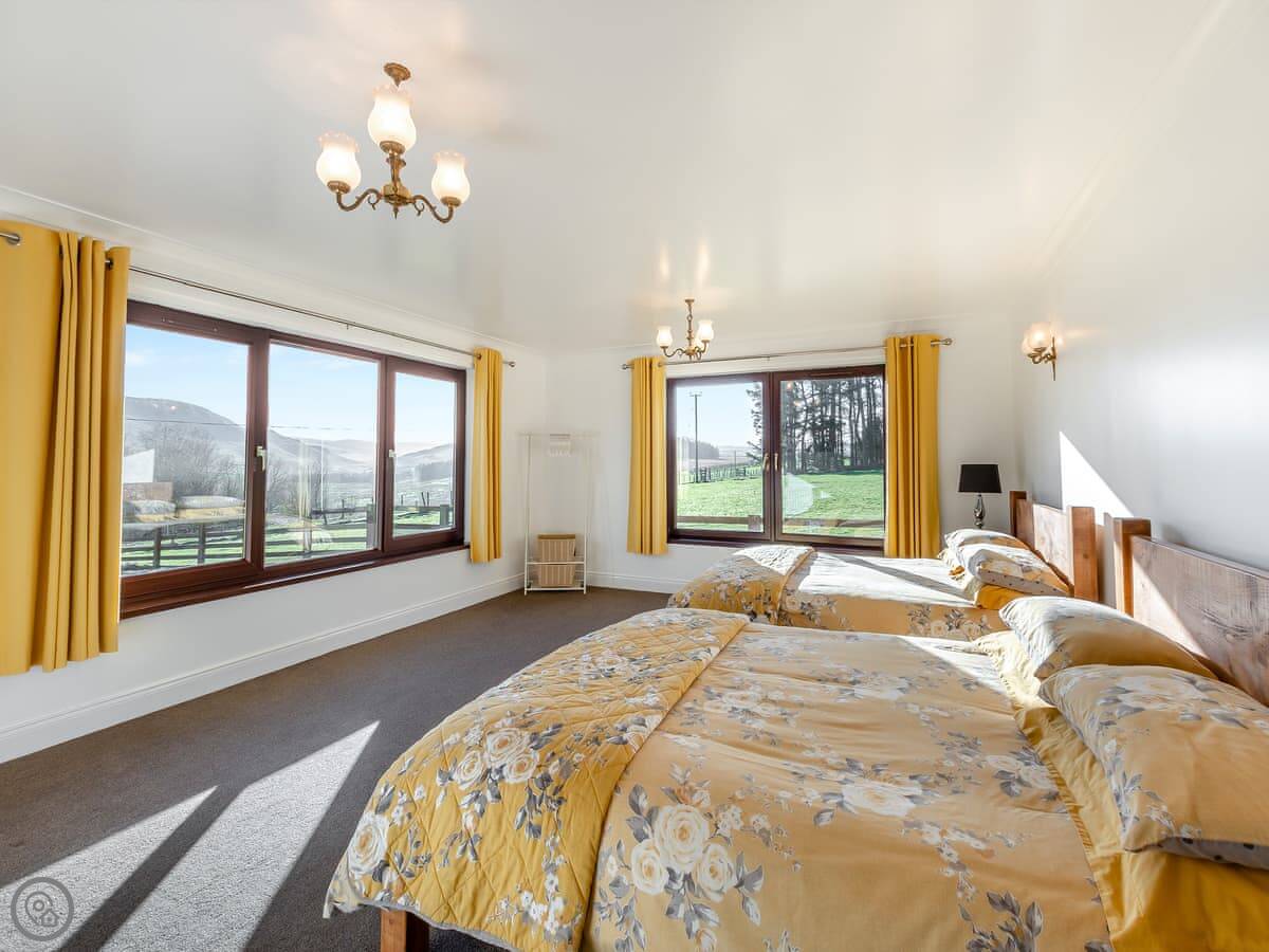 It sleeps six, in three bedrooms. Two have single beds and the main one has a king size. The head of that bed lines up with the window, so you get the view first thing. There are two shower rooms. Both have walk-in showers.