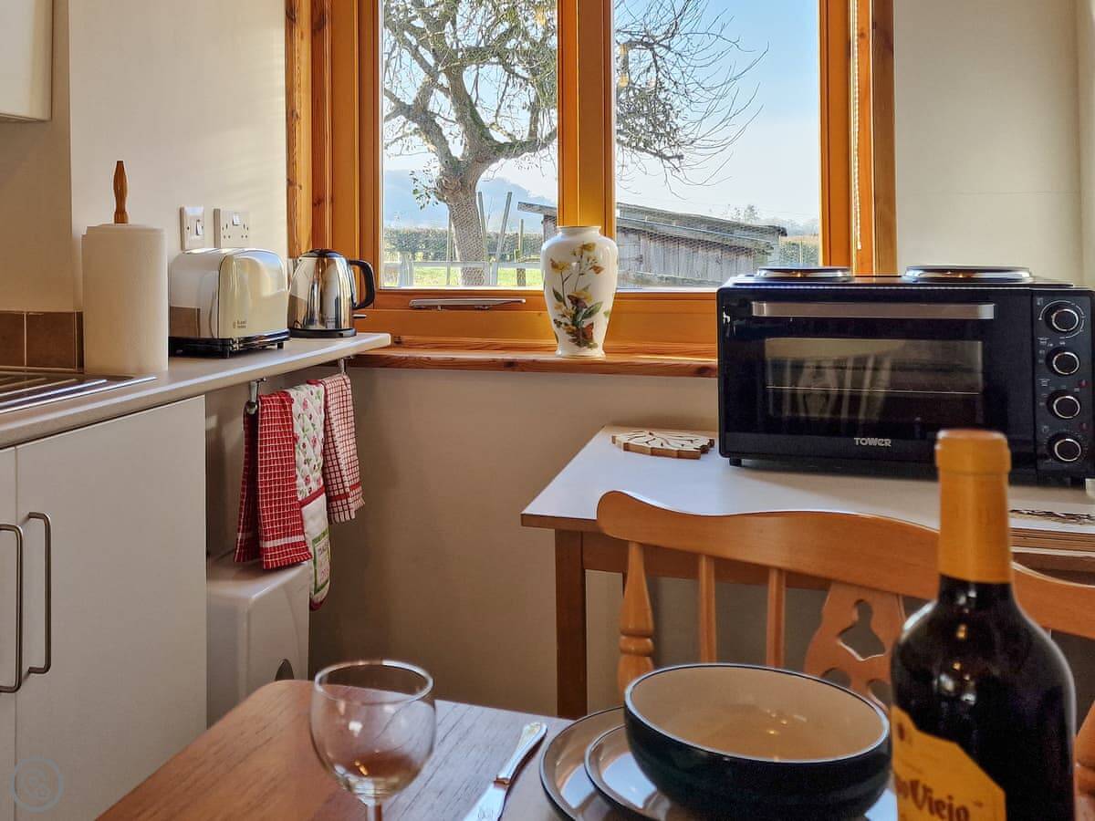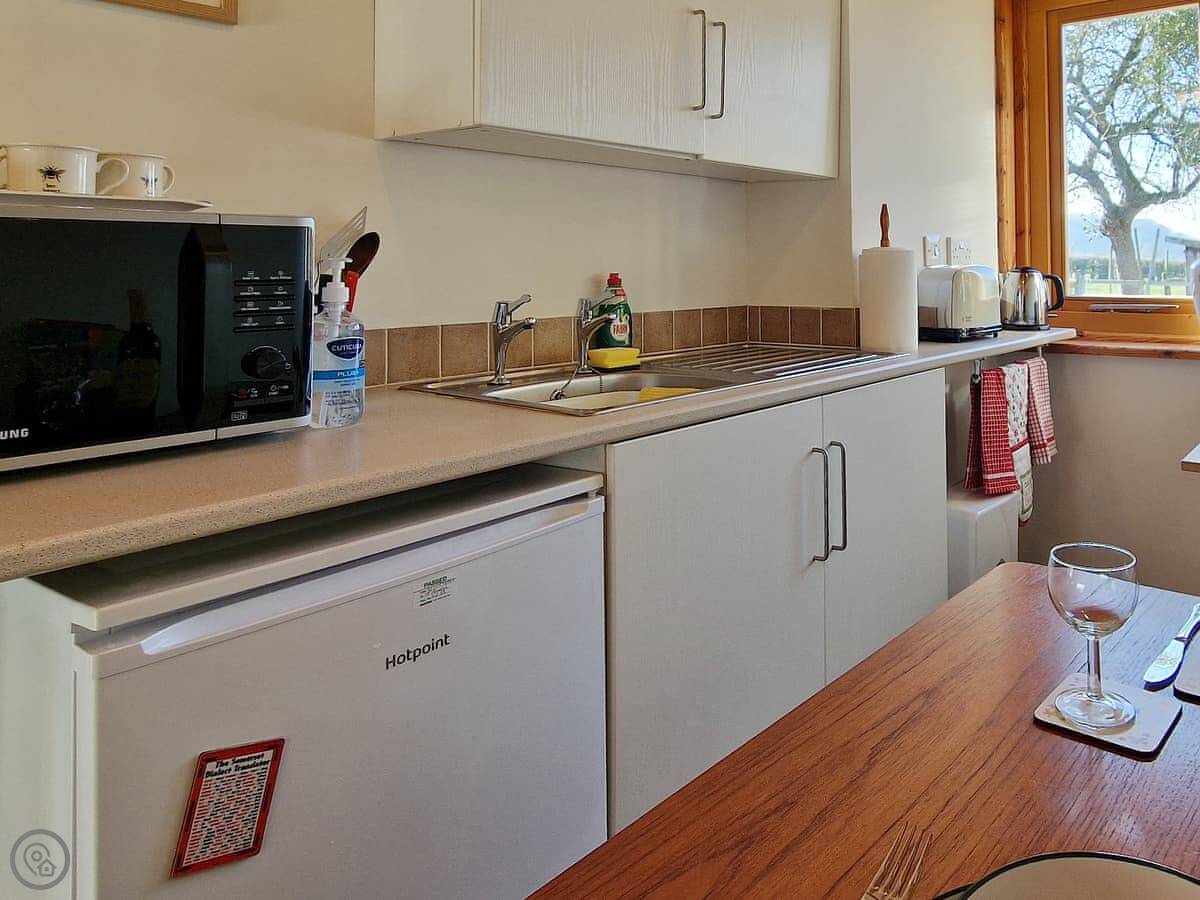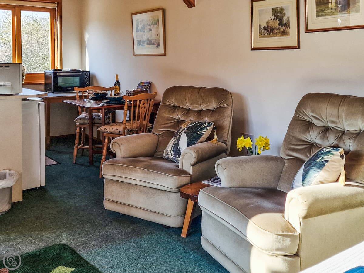 As you enter The Old Orchard you are greeted by a small hall which leads to the open plan living, dining, bedroom, and kitchen area. The bedroom area has a double bed, while the living area has two comfy armchairs to relax in after a day out. The kitchen is equipped with all you will need to create a light meal. There is also a separate shower room with an electric shower. Outside, you have a seating area with table and chairs that overlook the owners’ free range chickens.