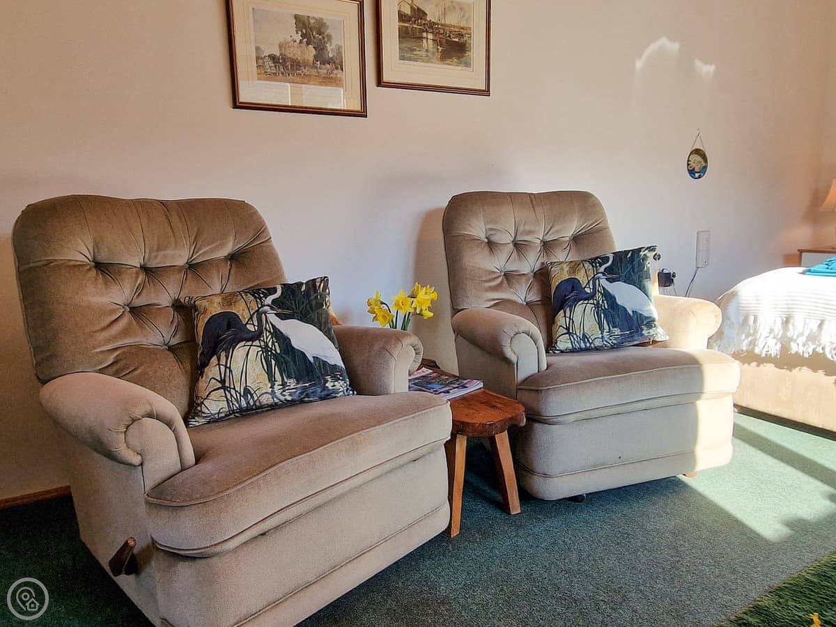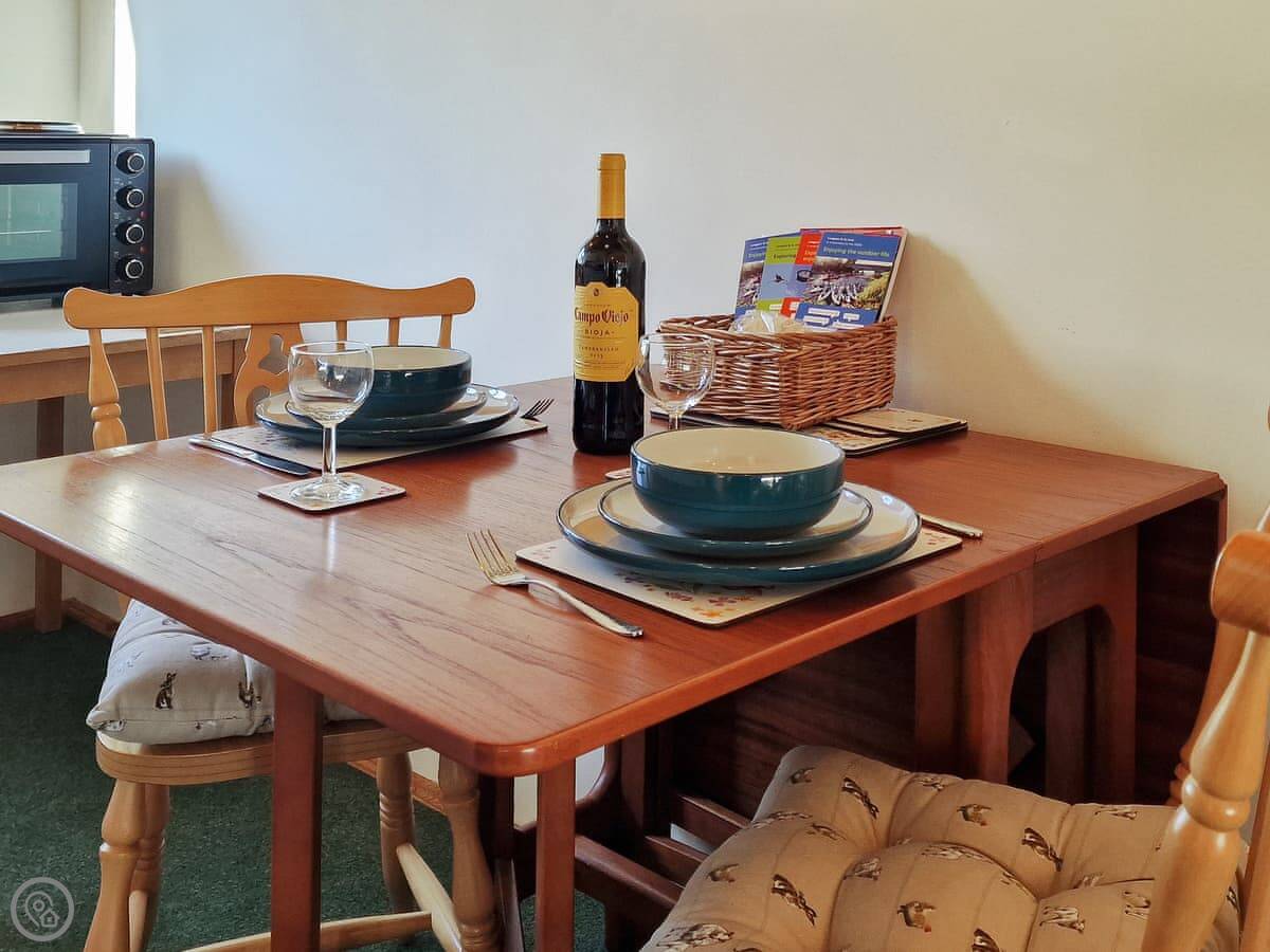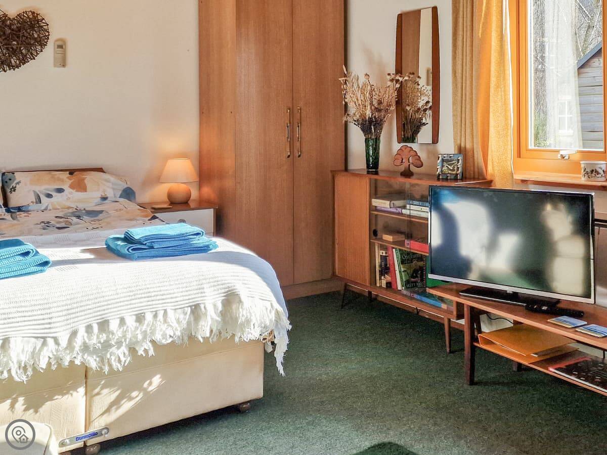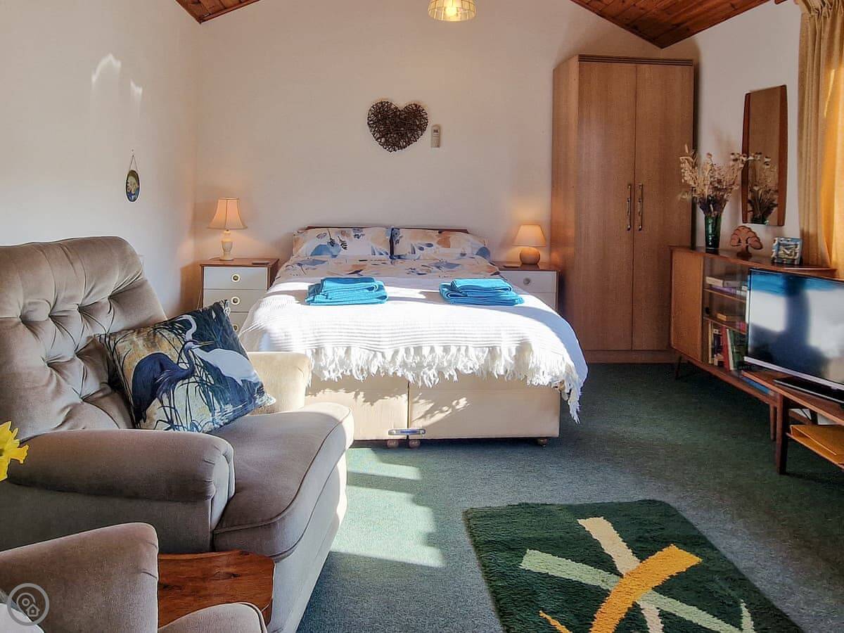 As you enter The Old Orchard you are greeted by a small hall which leads to the open plan living, dining, bedroom, and kitchen area. The bedroom area has a double bed, while the living area has two comfy armchairs to relax in after a day out. The kitchen is equipped with all you will need to create a light meal. There is also a separate shower room with an electric shower. Outside, you have a seating area with table and chairs that overlook the owners’ free range chickens.