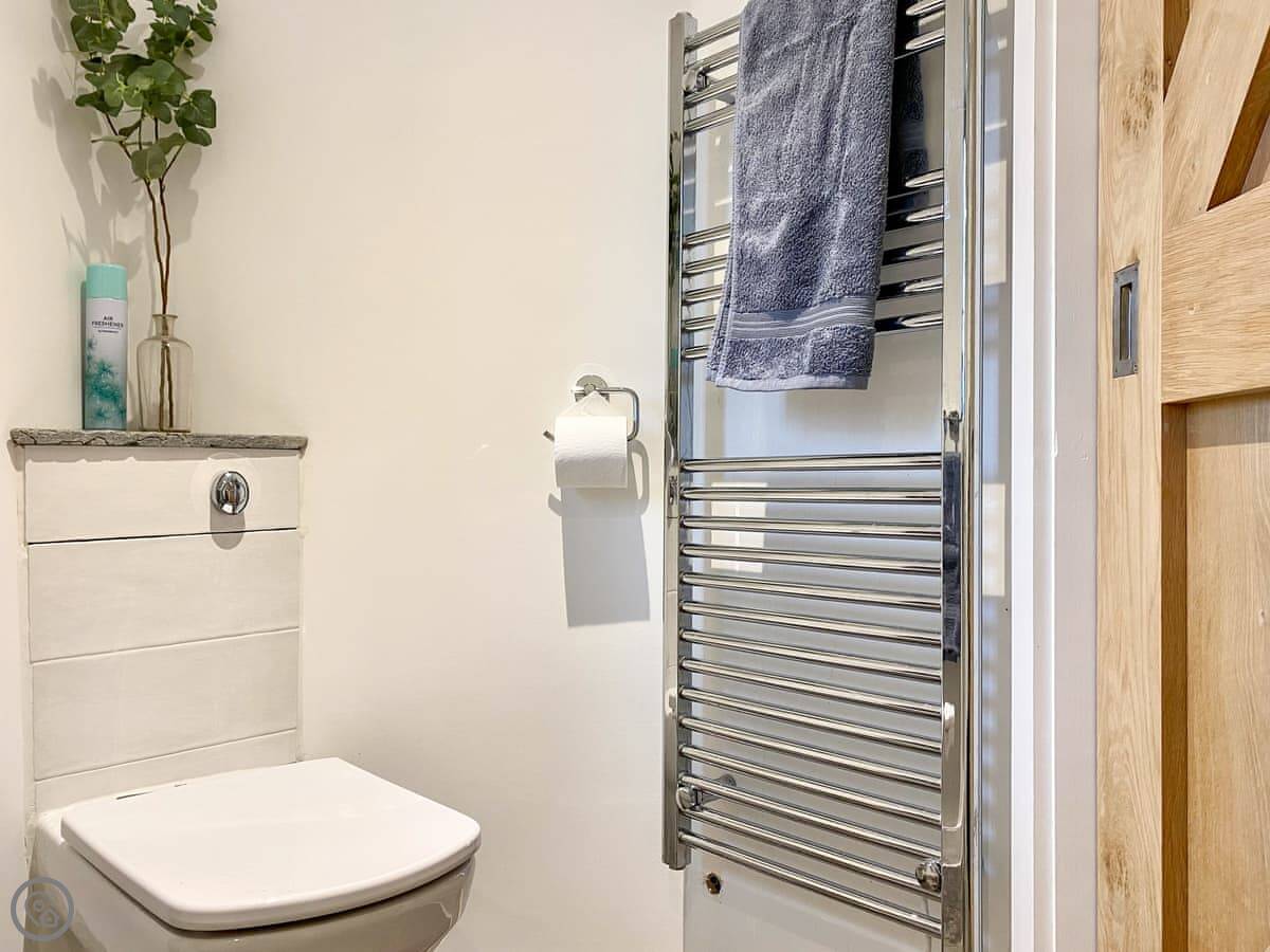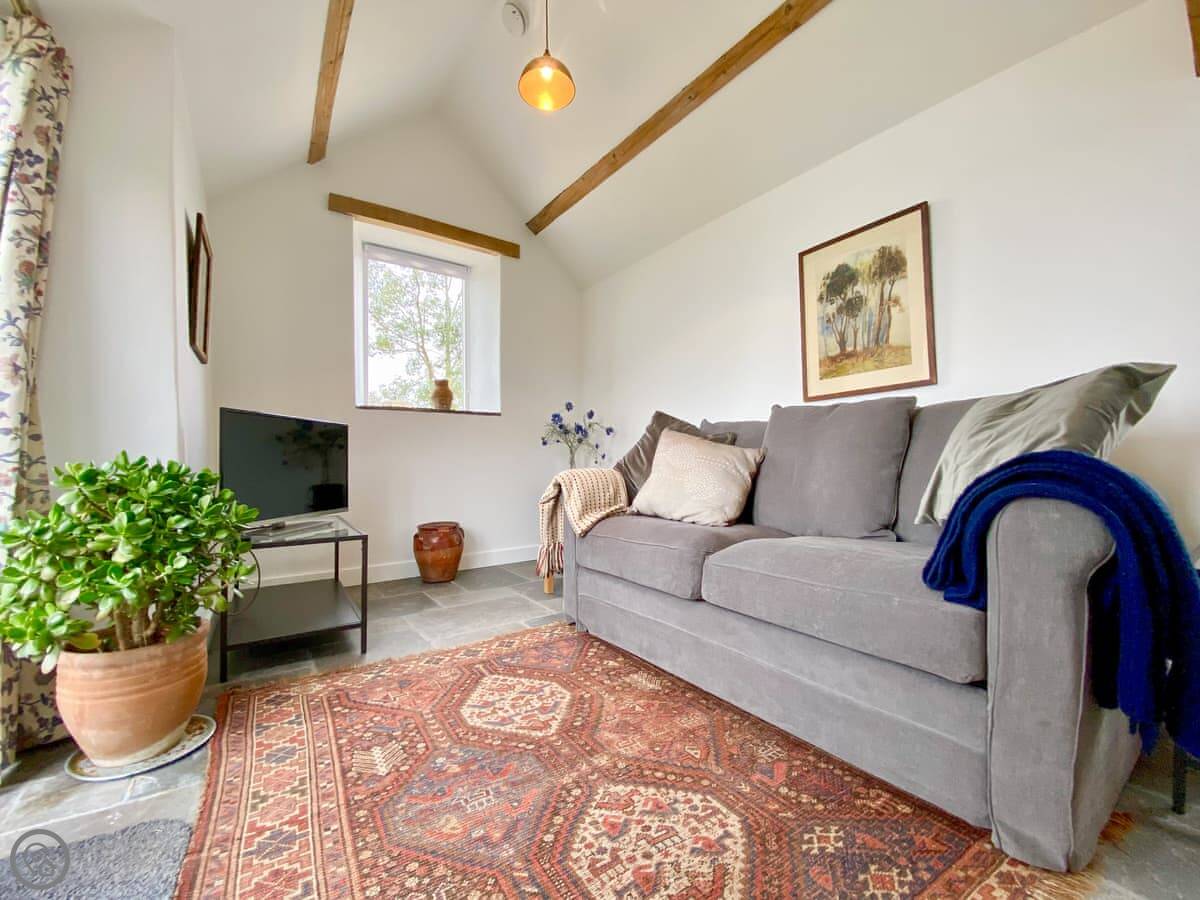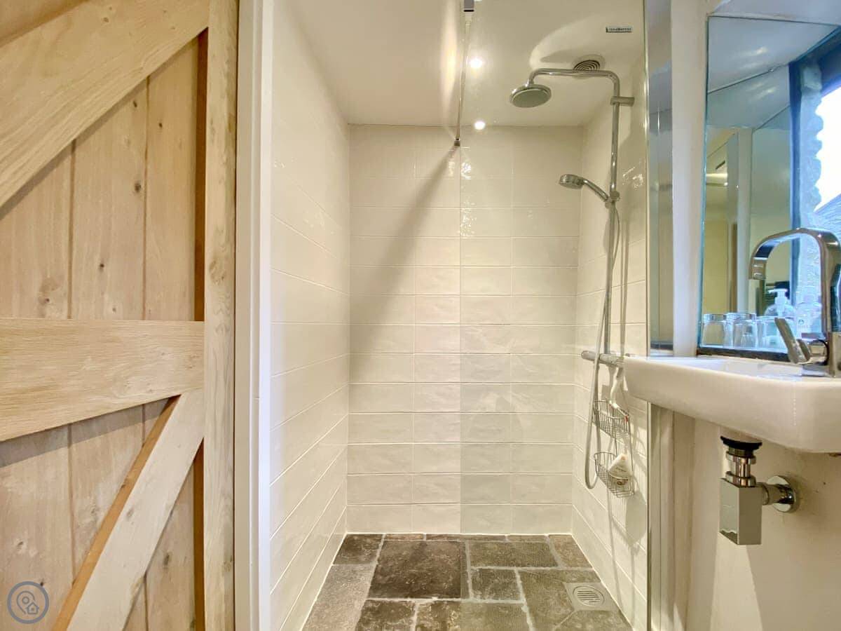 The front doors open right out onto your own bit of garden with a table and chairs. It looks over fields. Inside, it's open plan: a living area with a sofa and TV, a kitchenette, and the bed is in an alcove off the main room. It's got underfloor heating, which takes the chill off the stone floor. The bathroom has a walk-in shower. The kitchen has a small fridge but no freezer, just so you know.