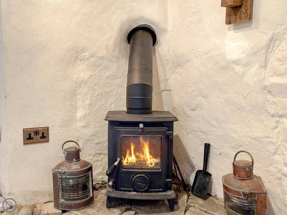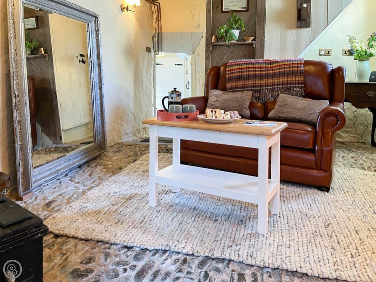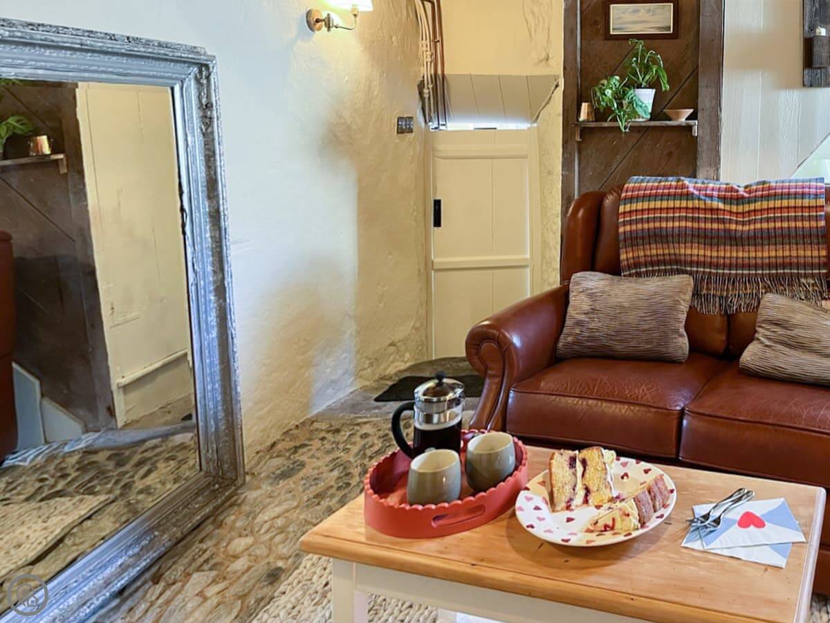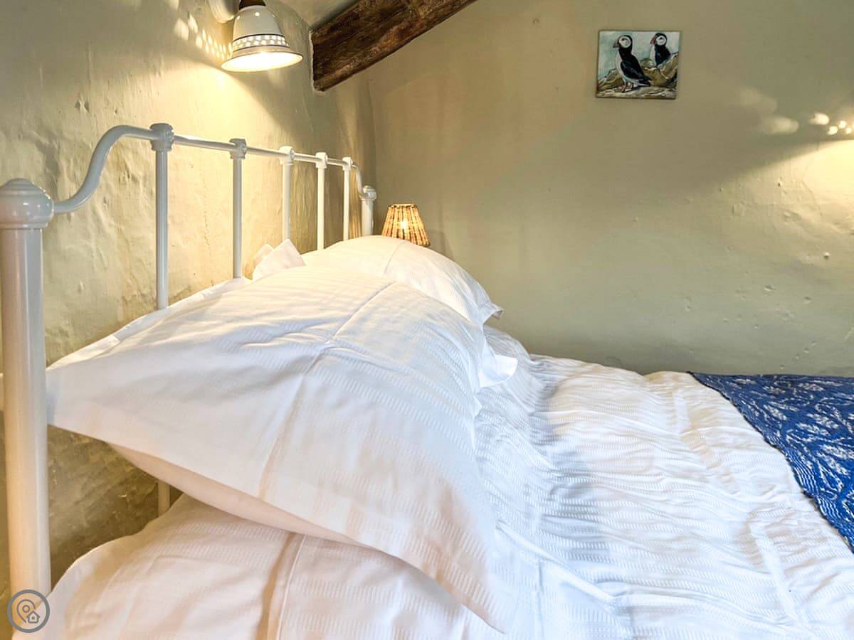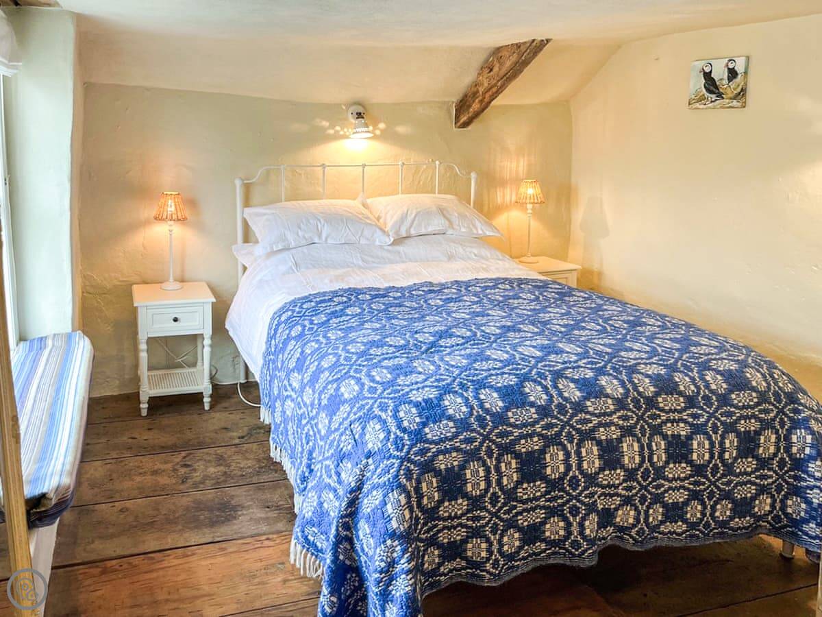 The main room has the original cobble floor. There's a wood burner and a two-seater sofa. The stairs to the bedroom are the original ones. They're steep and a bit uneven. Upstairs is a kingsize bed. You can see a bit of the sea from the window.