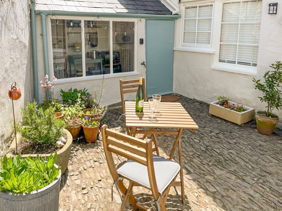 You come in through a little courtyard with cobbles. It's sunny out there, and there's a table and chairs. The kitchen is small, a galley kitchen. It looks out to the courtyard.
