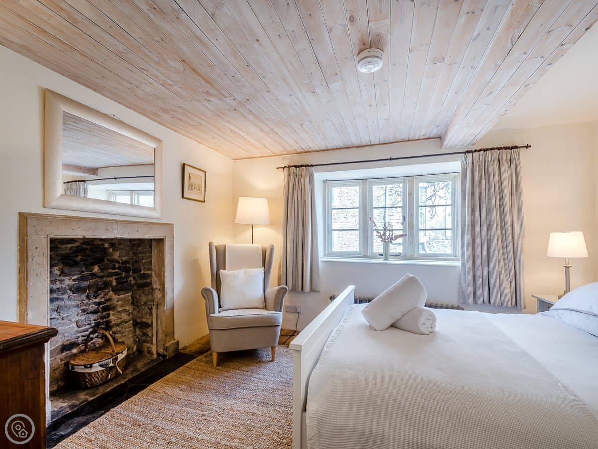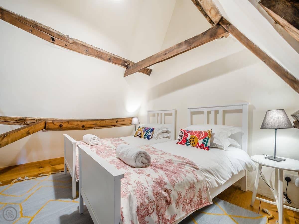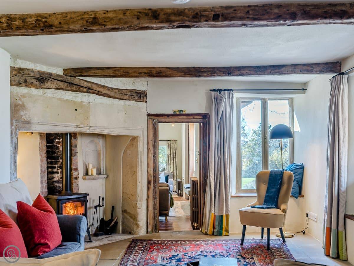 There's an inglenook fireplace in the sitting room with a wood burner. The heating is underfloor in the main living area, which is good in winter. The bedrooms are large. One on the top floor has a glass wall looking right into the old roof beams.