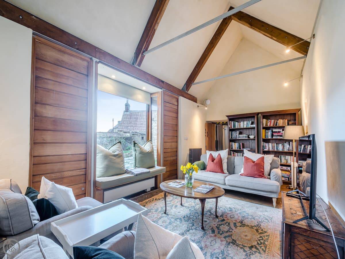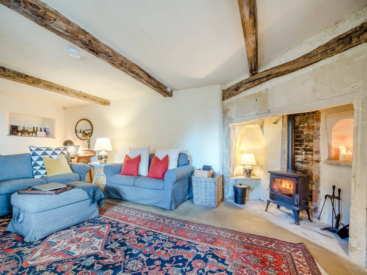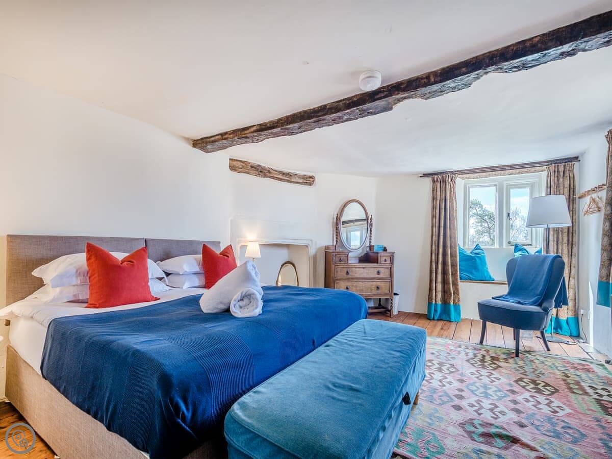 There's an inglenook fireplace in the sitting room with a wood burner. The heating is underfloor in the main living area, which is good in winter. The bedrooms are large. One on the top floor has a glass wall looking right into the old roof beams.