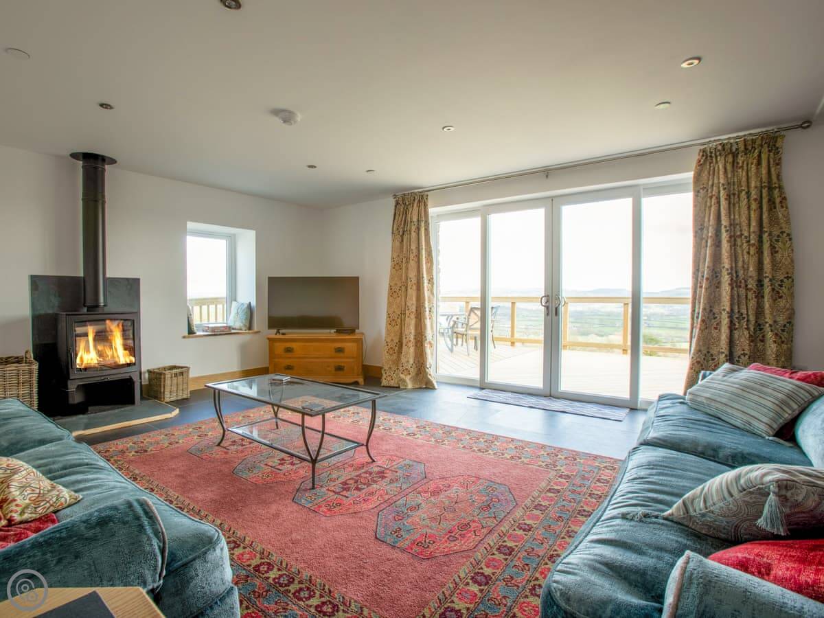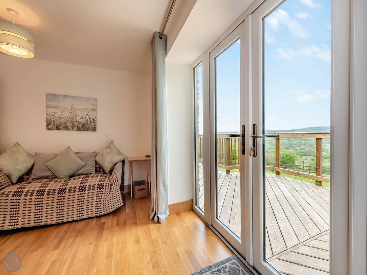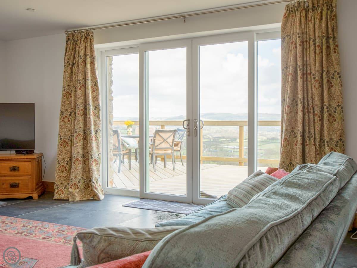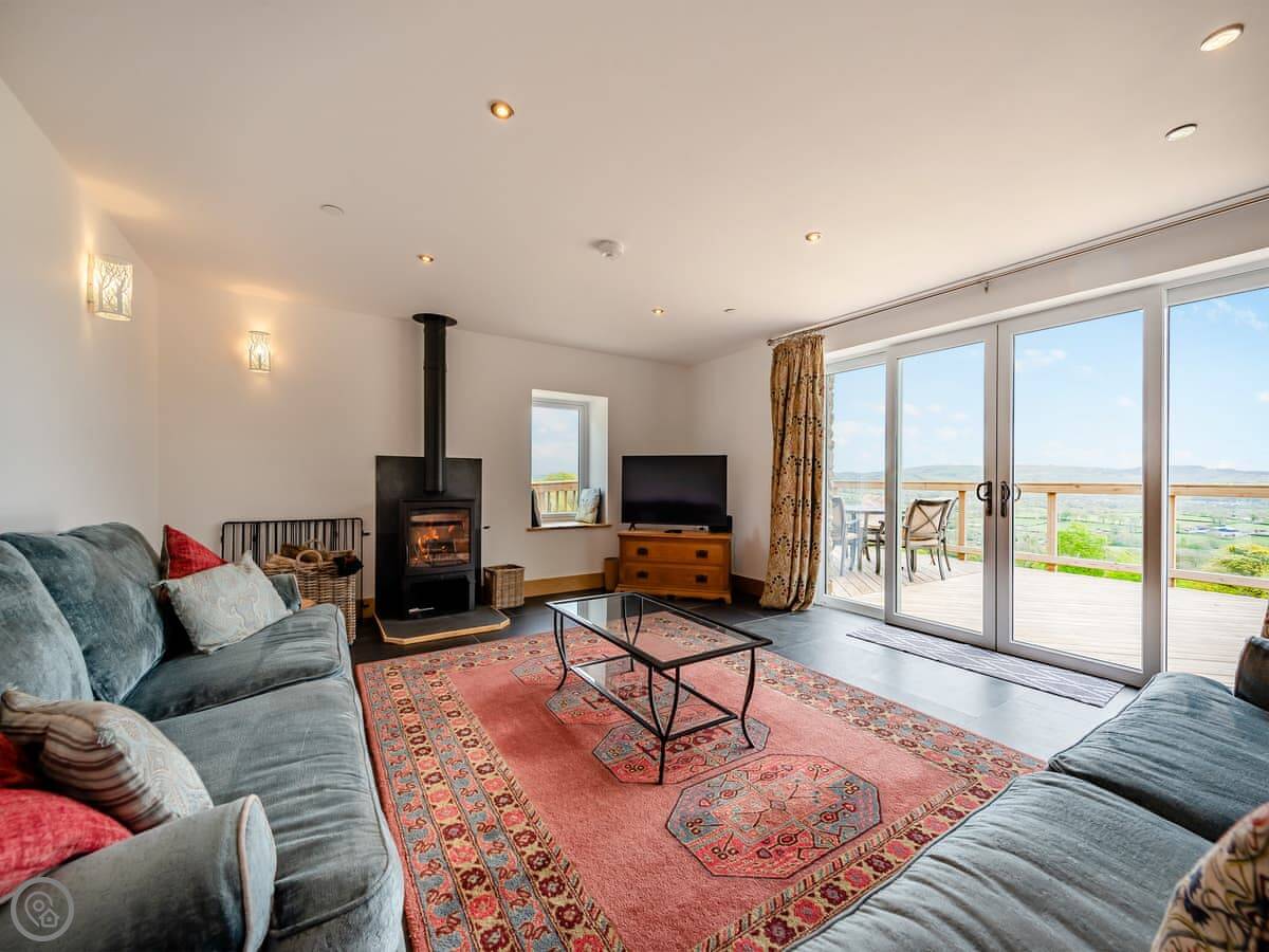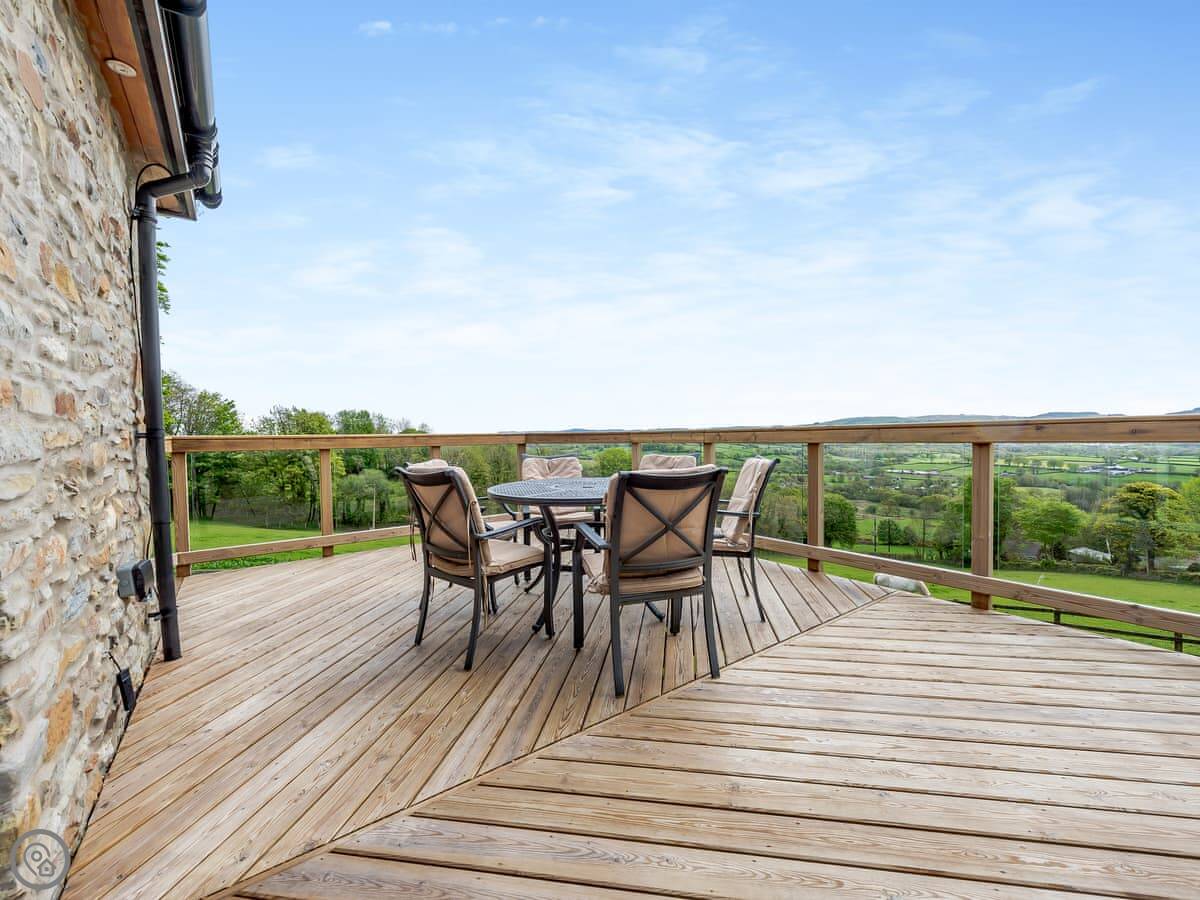 This is Y Beudy. It's in Llanwenog, which is a hamlet in Carmarthenshire. It's a barn we converted. It's detached and sits on the edge of the Teifi Valley, so you get a clear view right down the valley from the main living area and the terrace.