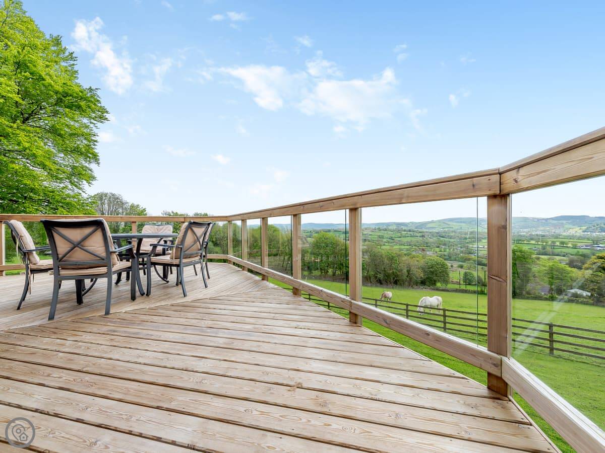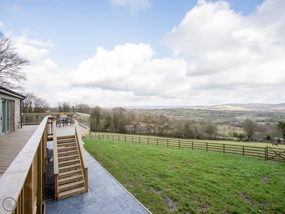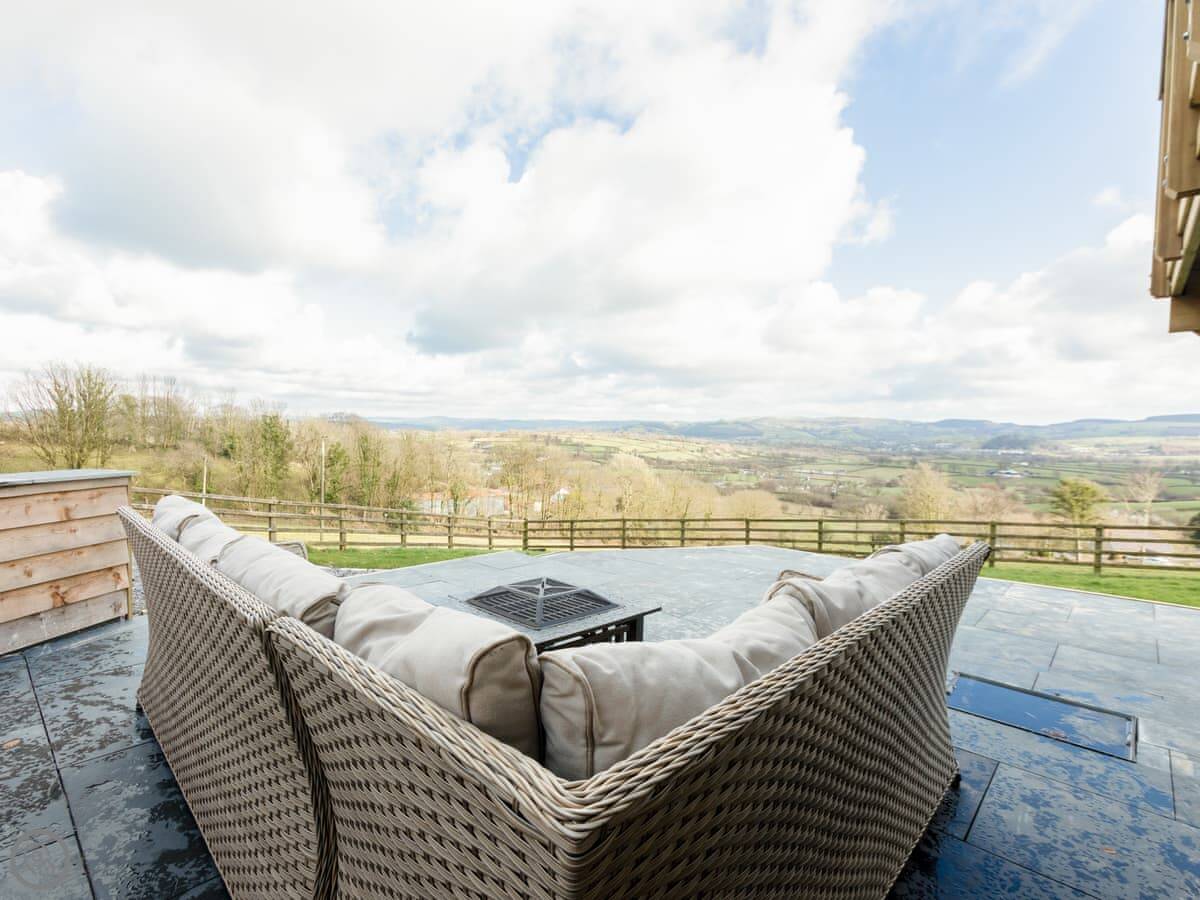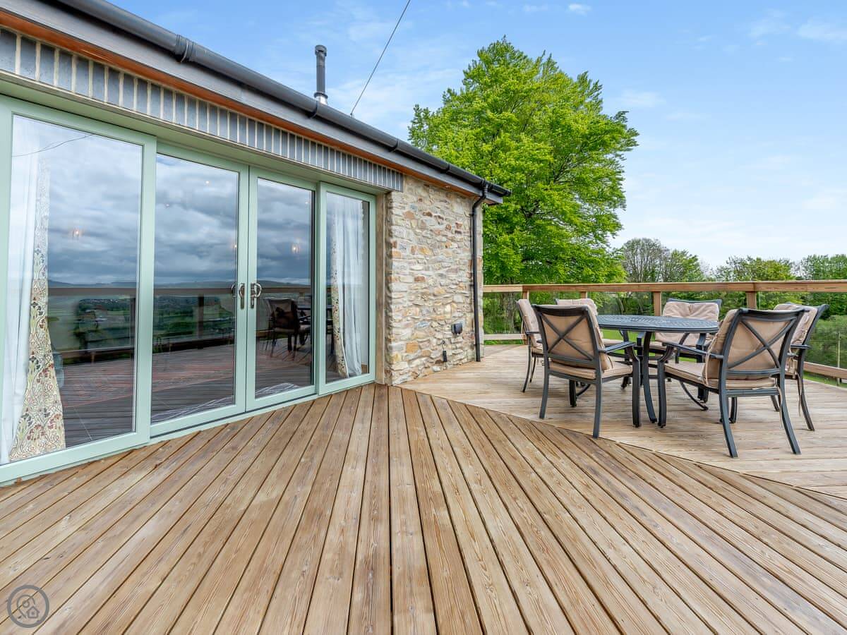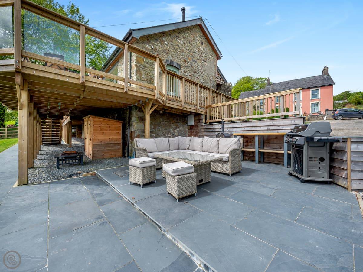 Outside there's a big wraparound terrace. It gets the sun. There's a gas barbecue, a wood-fired pizza oven, and a fire pit out there. The garden is enclosed, which is good if you're bringing dogs. You can bring up to four dogs. They need to be kept on a lead outside the garden though, as there are working farms with livestock nearby.