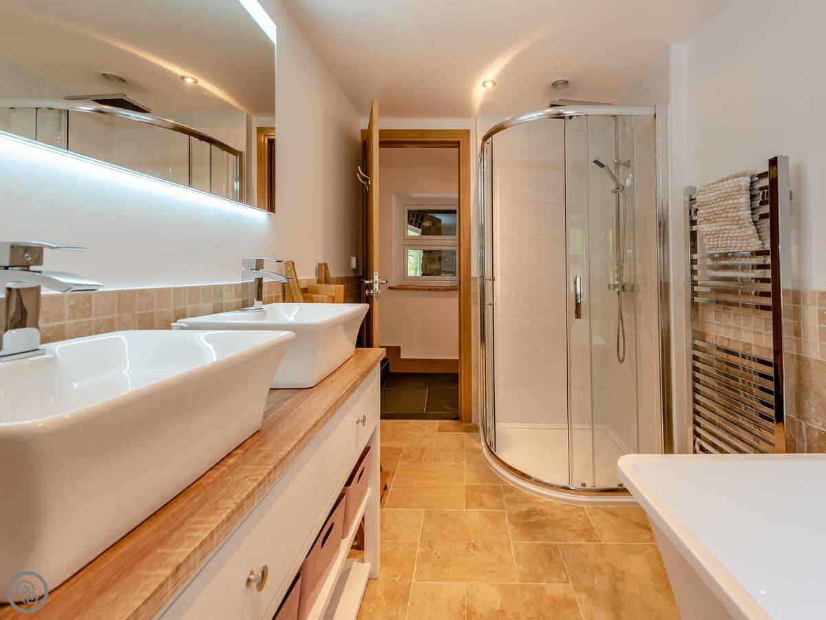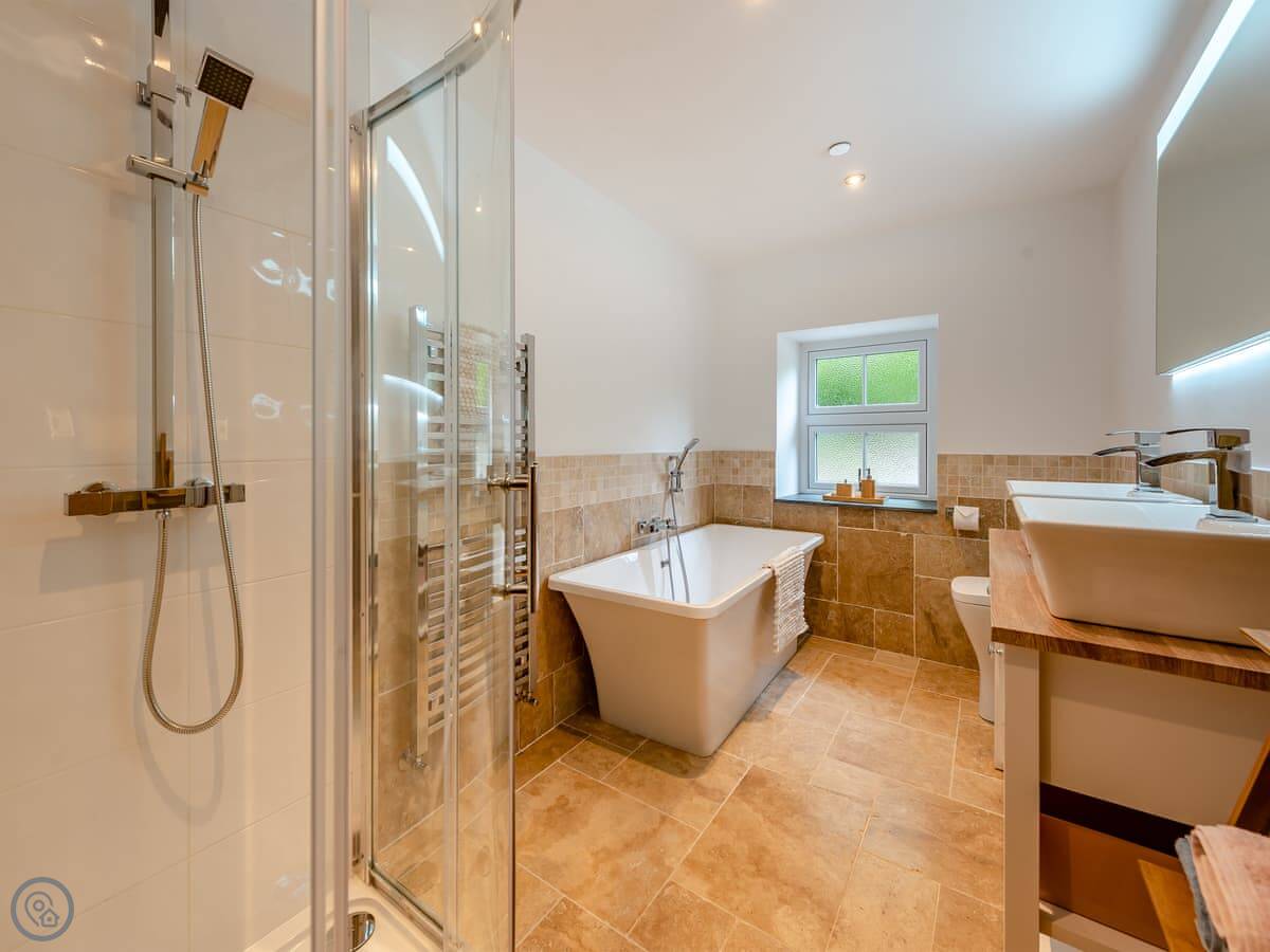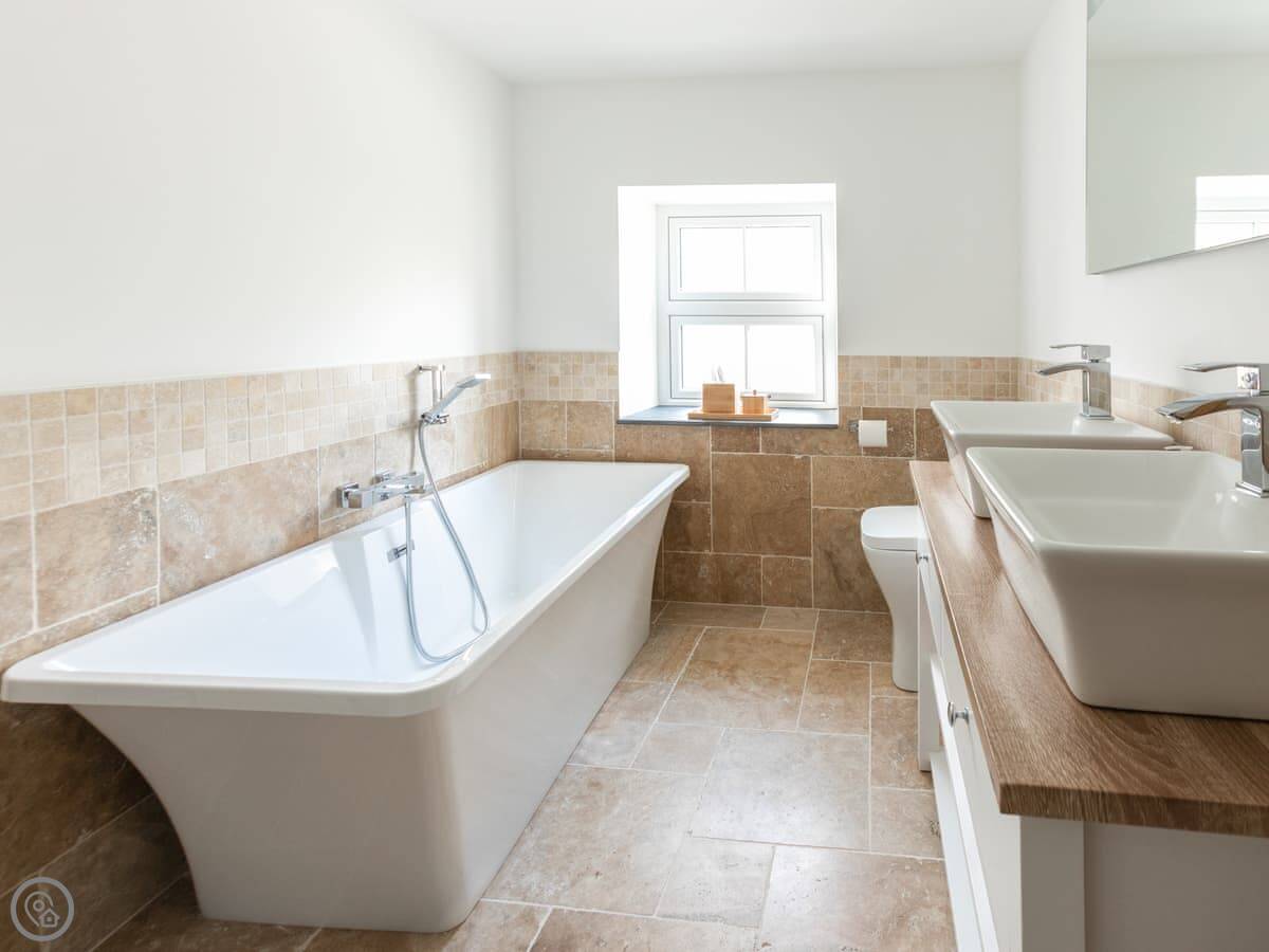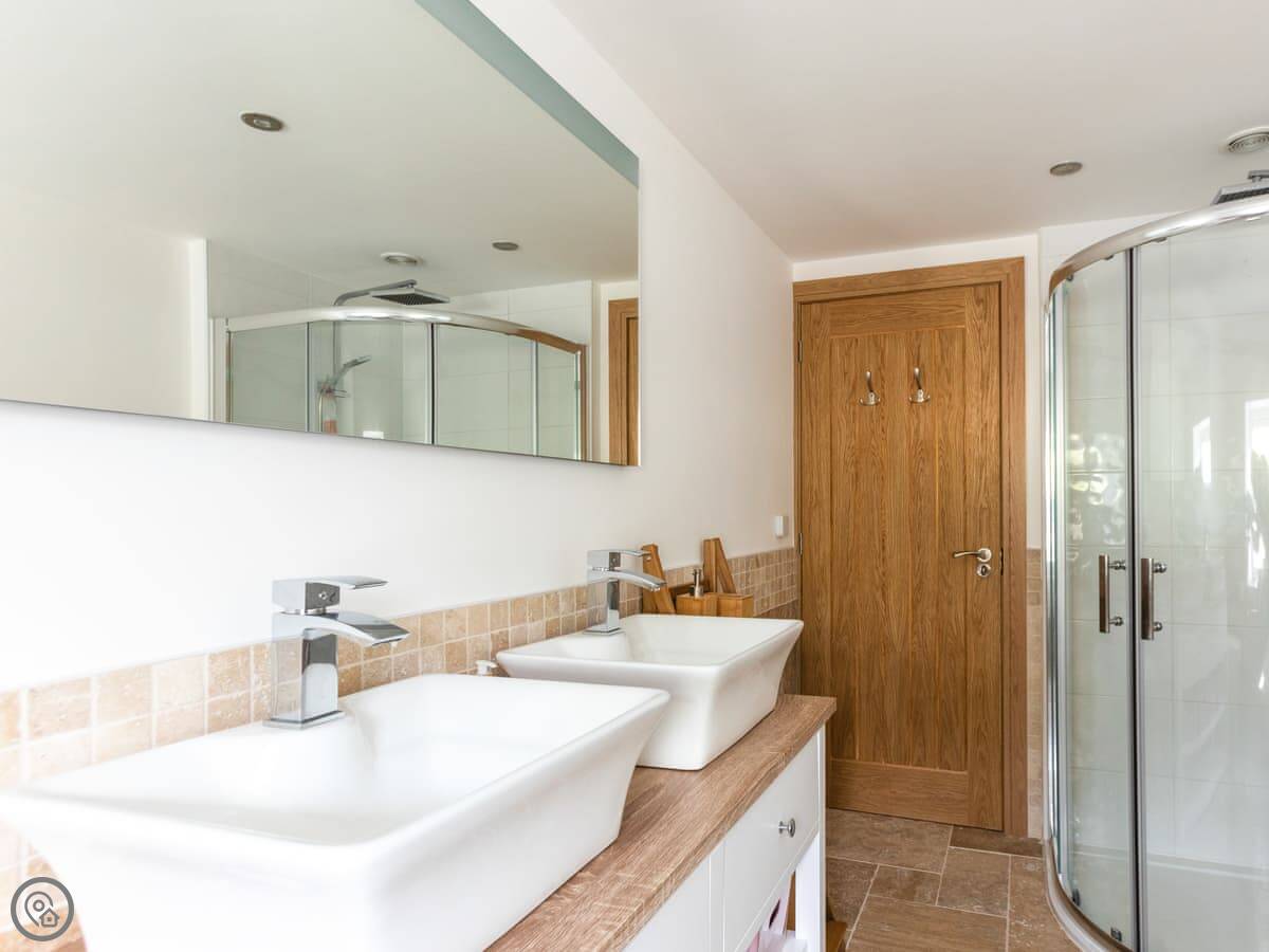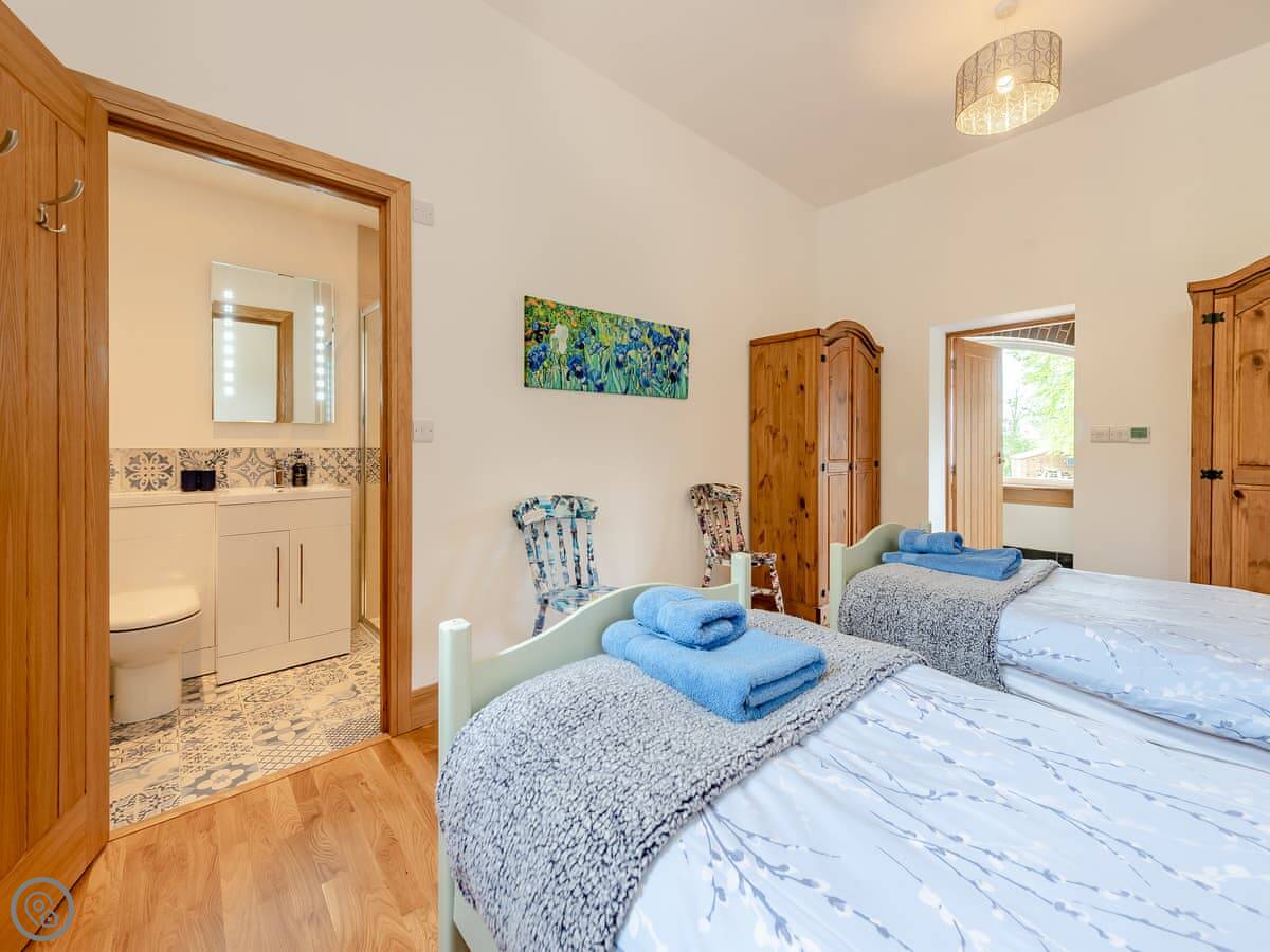 Outside there's a big wraparound terrace. It gets the sun. There's a gas barbecue, a wood-fired pizza oven, and a fire pit out there. The garden is enclosed, which is good if you're bringing dogs. You can bring up to four dogs. They need to be kept on a lead outside the garden though, as there are working farms with livestock nearby.