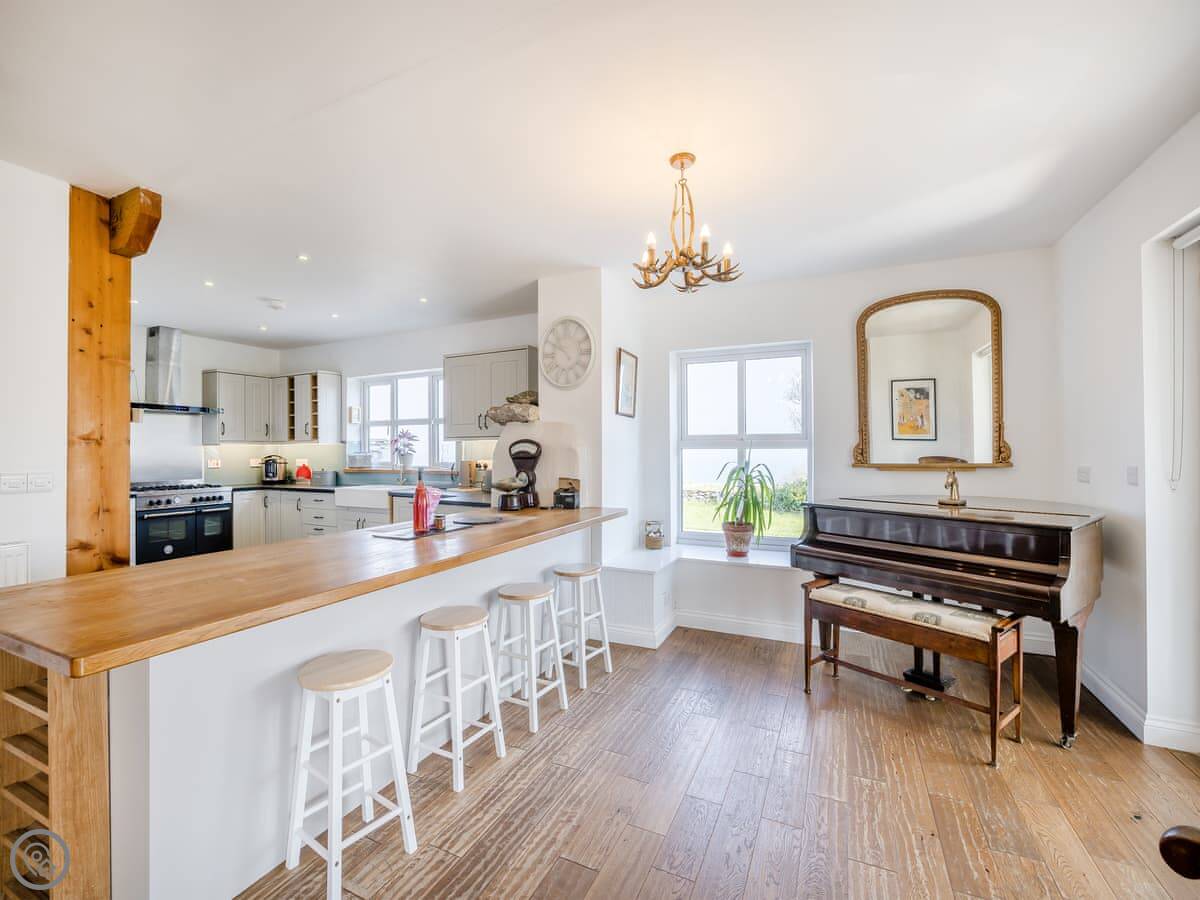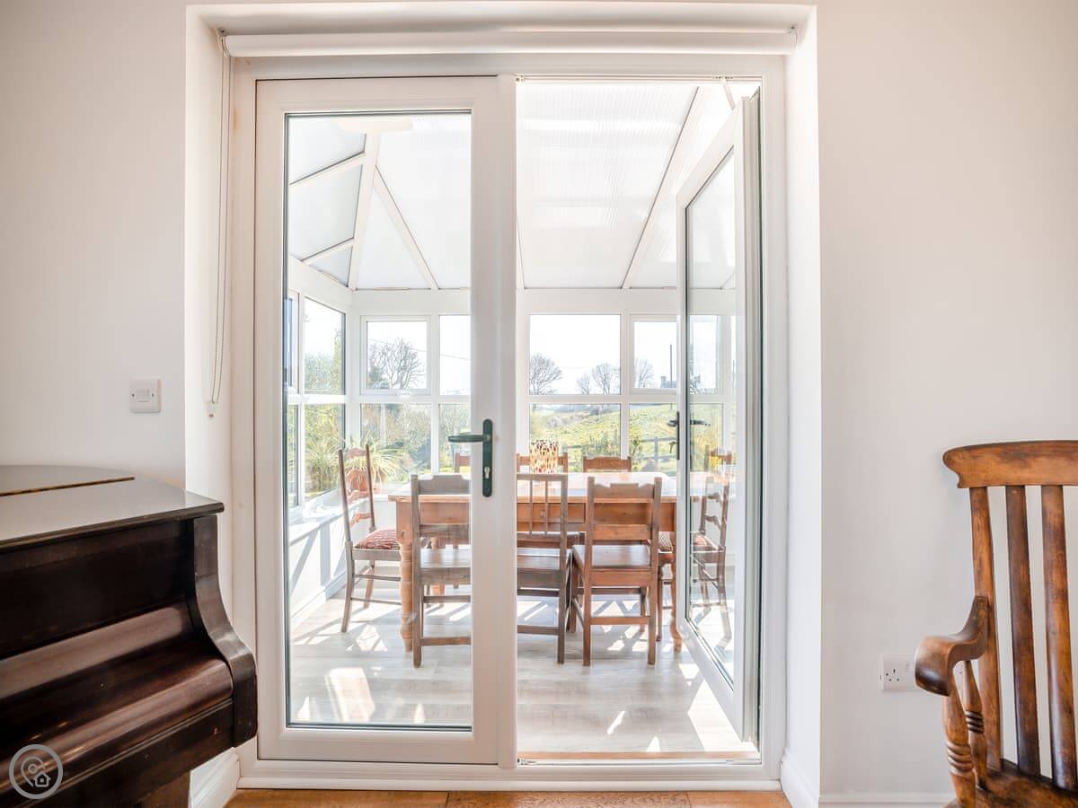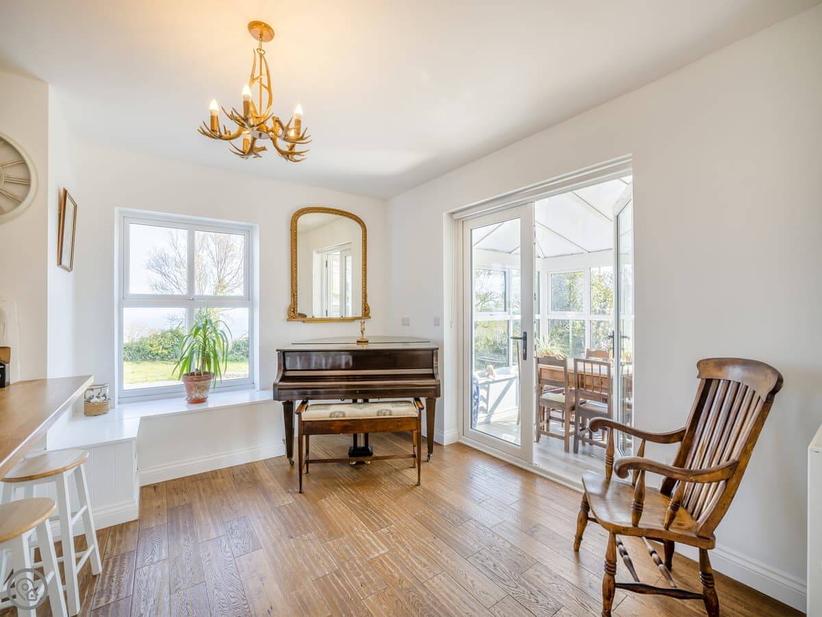 A couple of things to know. The stairs are normal house stairs, not too steep. There's a baby grand piano in the living room. If you can play, great. If not, it's just there. The conservatory gets the morning sun and is a good spot for breakfast.