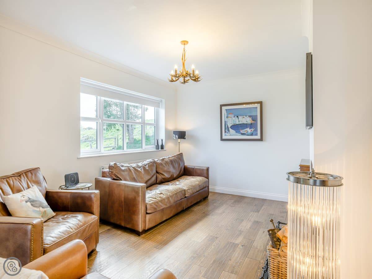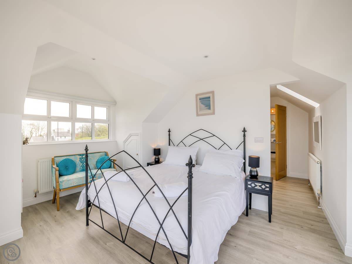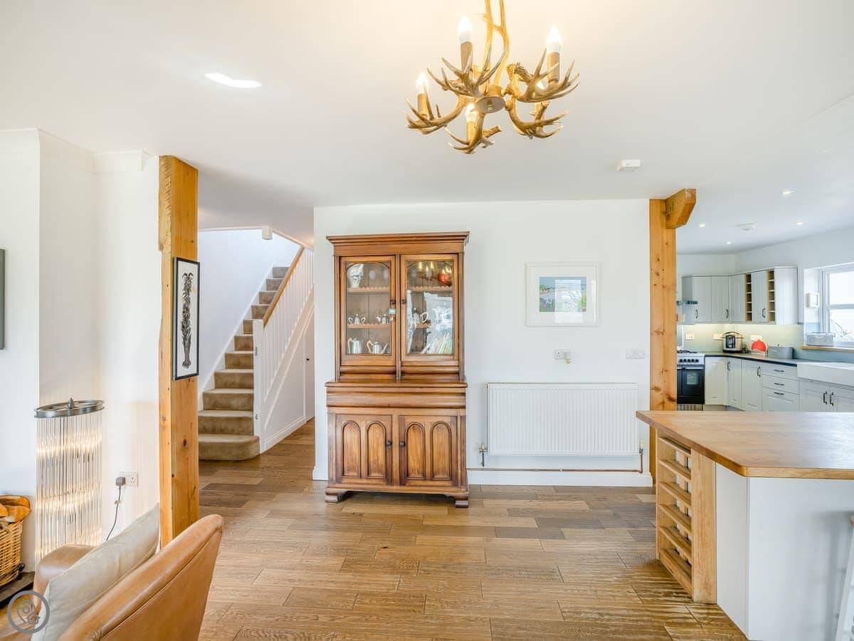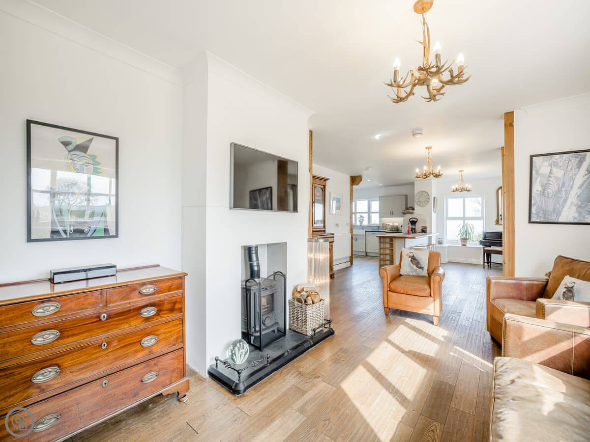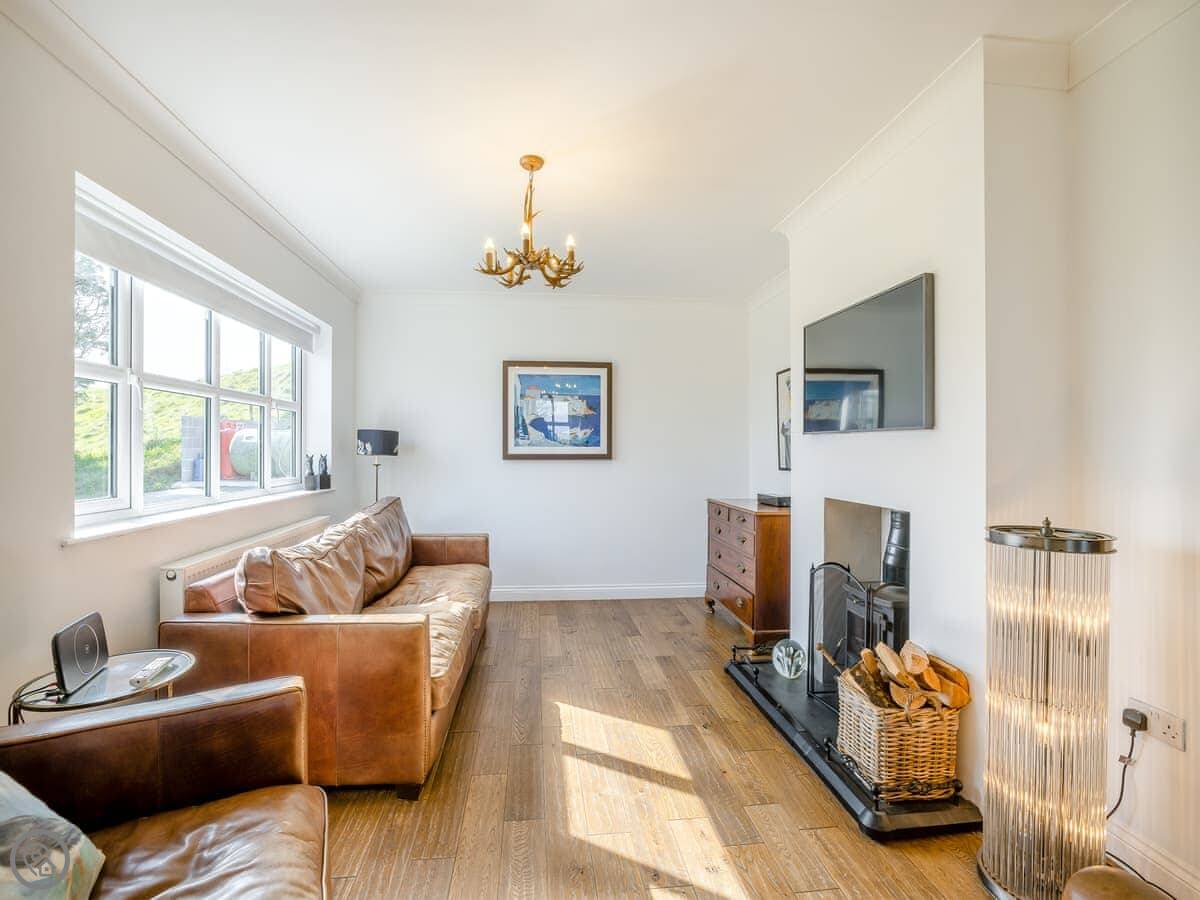 It's a five star place, which means it's well put together. It sleeps eight people. There are four bedrooms and three bathrooms. Two bedrooms and a Jack and Jill bathroom are downstairs. The main bedroom upstairs has a balcony looking out to sea, a walk-in wardrobe, and a big bathroom with a separate shower. The living area is open plan, good for a group. There's a wood burner for cooler evenings.