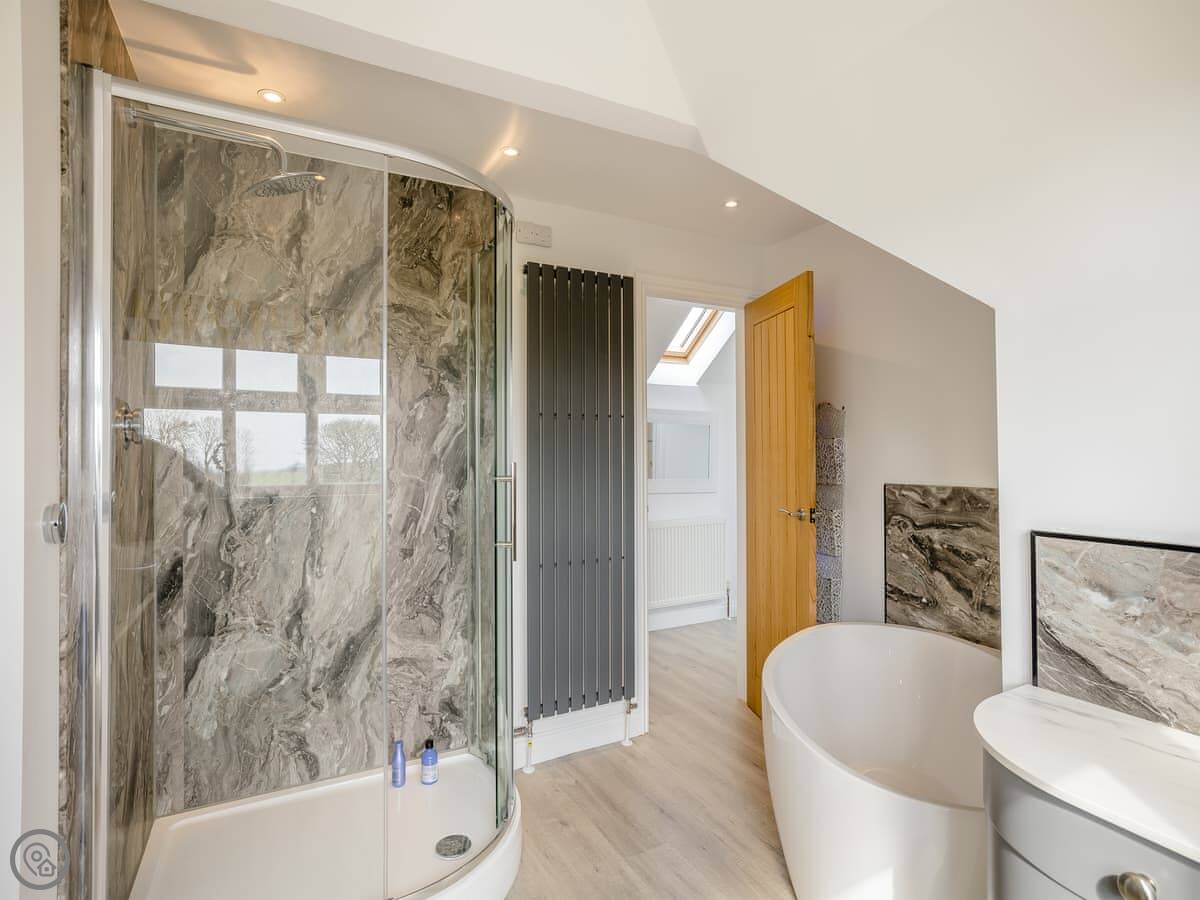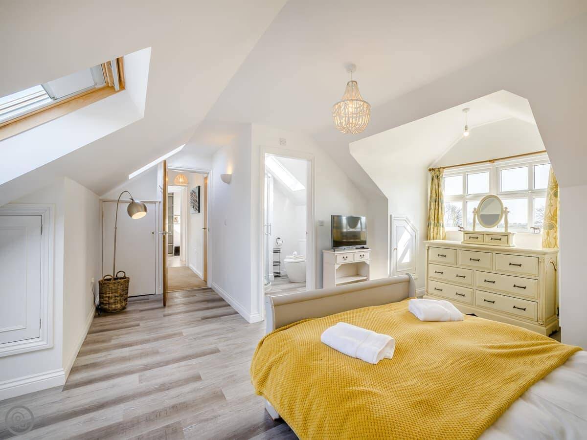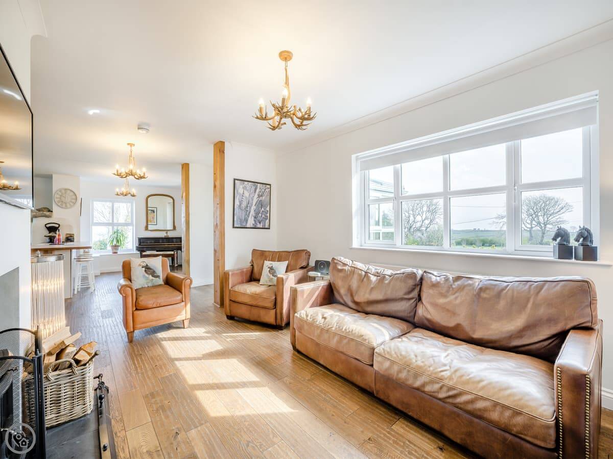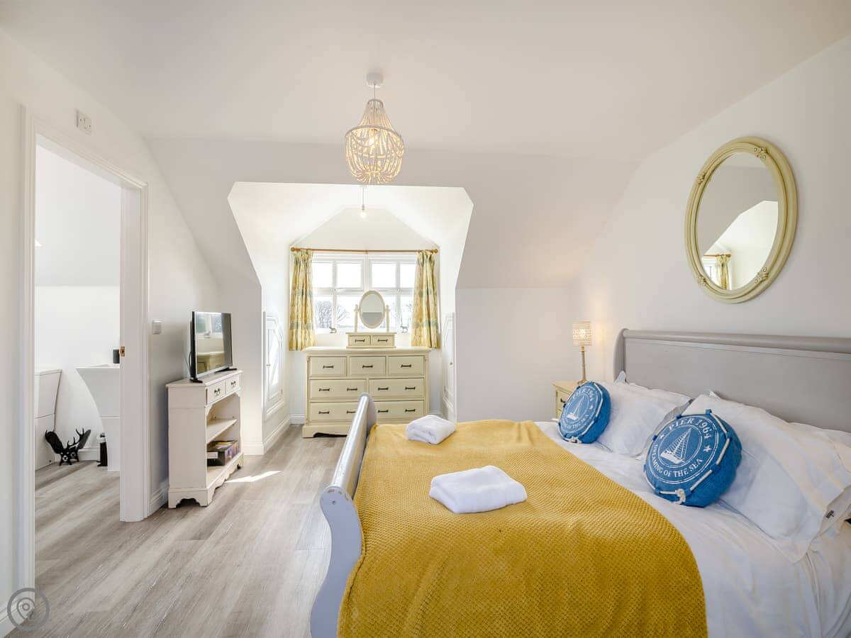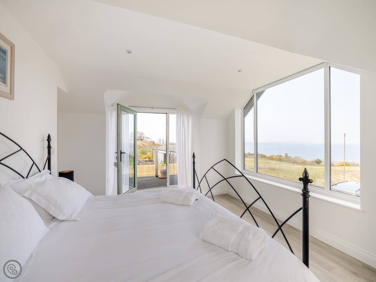 It's a five star place, which means it's well put together. It sleeps eight people. There are four bedrooms and three bathrooms. Two bedrooms and a Jack and Jill bathroom are downstairs. The main bedroom upstairs has a balcony looking out to sea, a walk-in wardrobe, and a big bathroom with a separate shower. The living area is open plan, good for a group. There's a wood burner for cooler evenings.