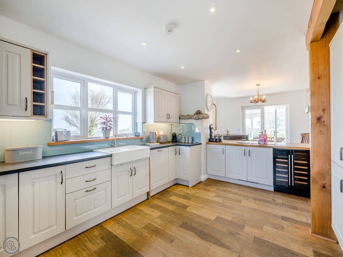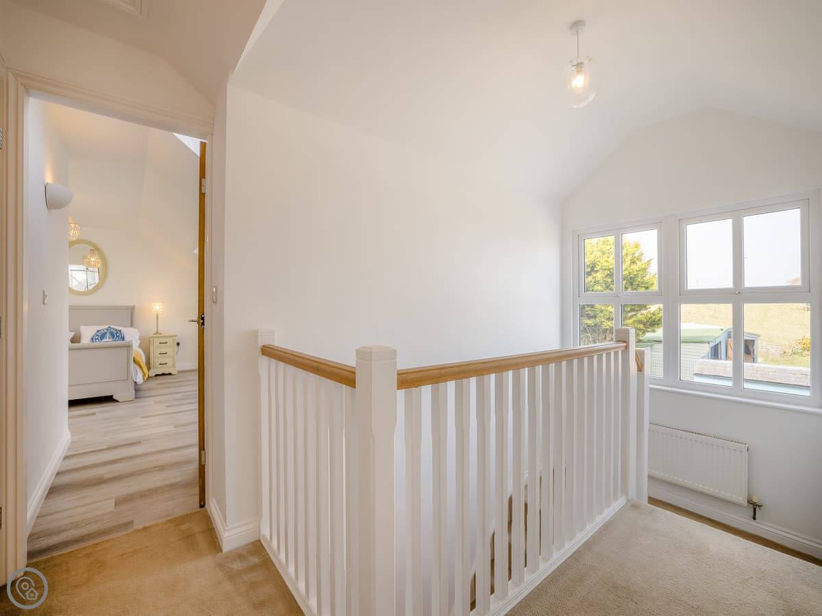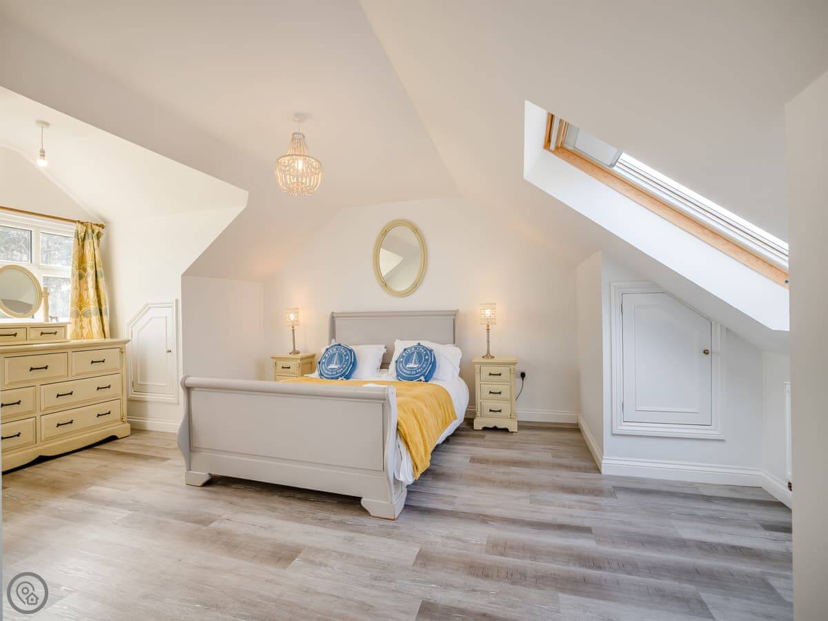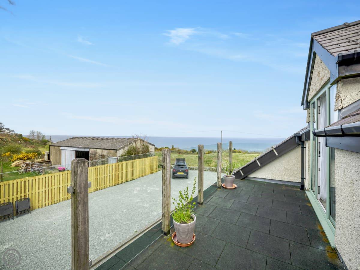 It's a five star place, which means it's well put together. It sleeps eight people. There are four bedrooms and three bathrooms. Two bedrooms and a Jack and Jill bathroom are downstairs. The main bedroom upstairs has a balcony looking out to sea, a walk-in wardrobe, and a big bathroom with a separate shower. The living area is open plan, good for a group. There's a wood burner for cooler evenings.