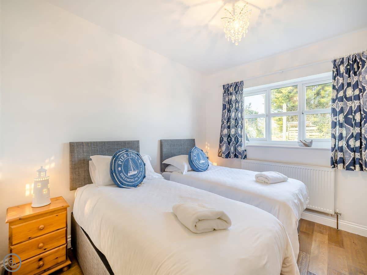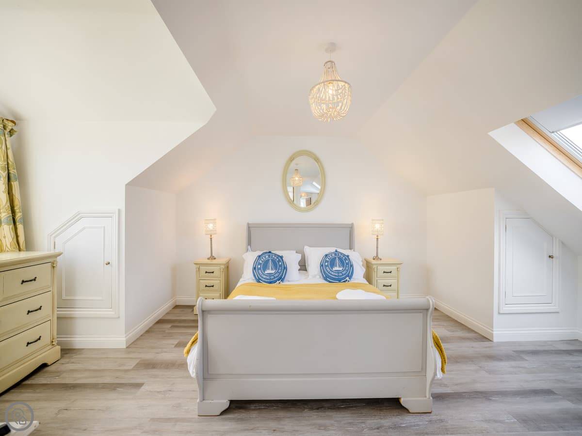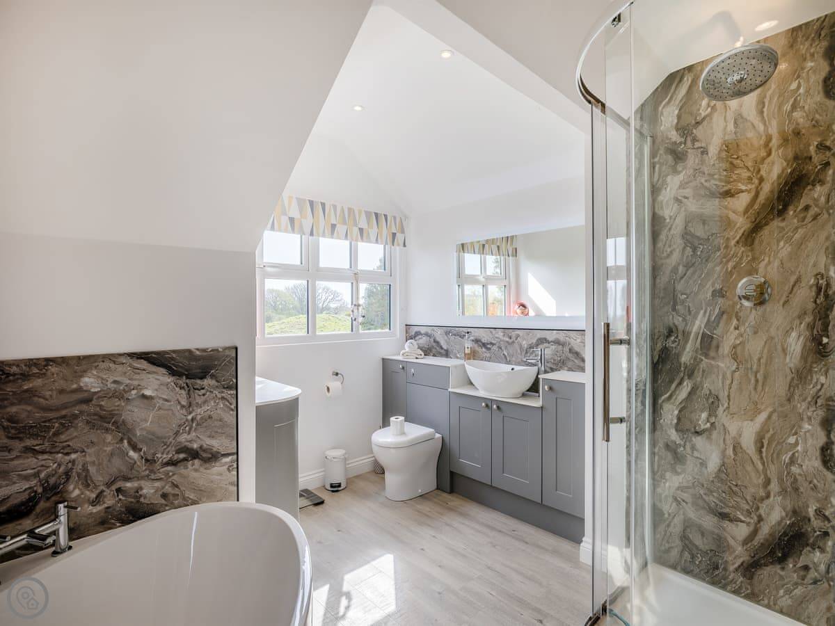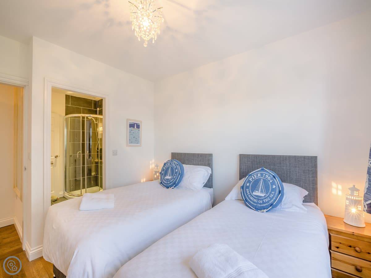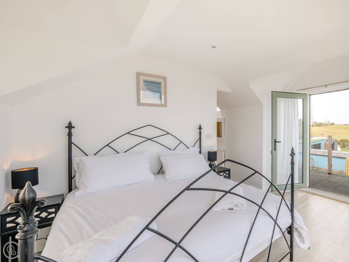It's a five star place, which means it's well put together. It sleeps eight people. There are four bedrooms and three bathrooms. Two bedrooms and a Jack and Jill bathroom are downstairs. The main bedroom upstairs has a balcony looking out to sea, a walk-in wardrobe, and a big bathroom with a separate shower. The living area is open plan, good for a group. There's a wood burner for cooler evenings.