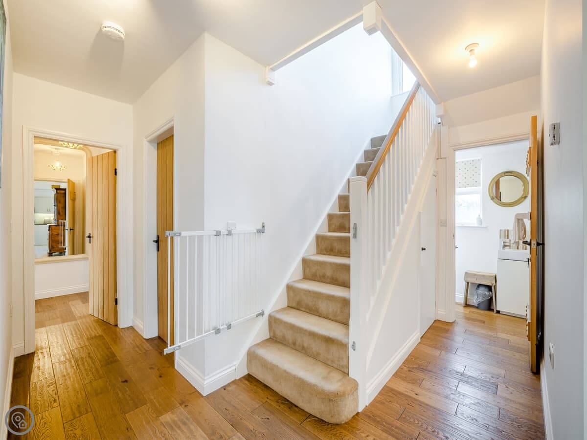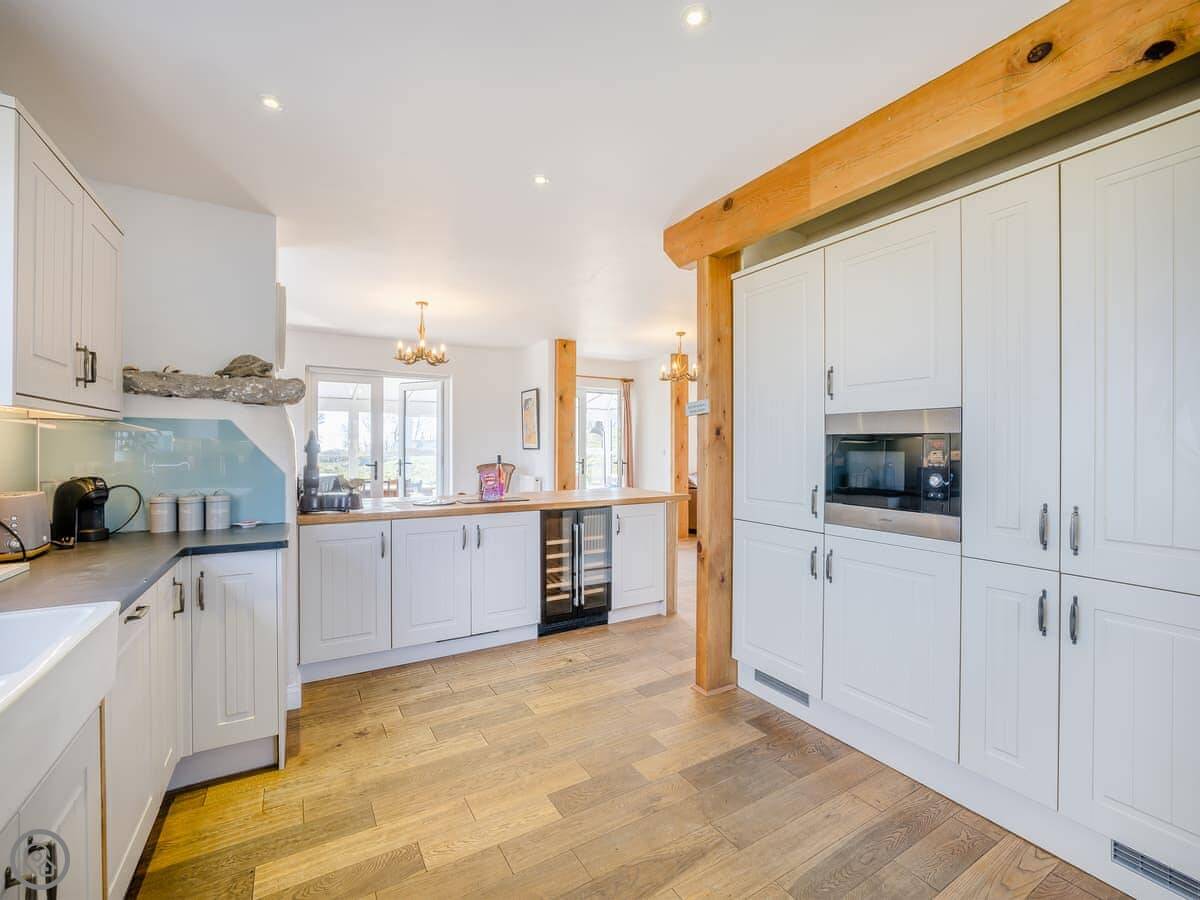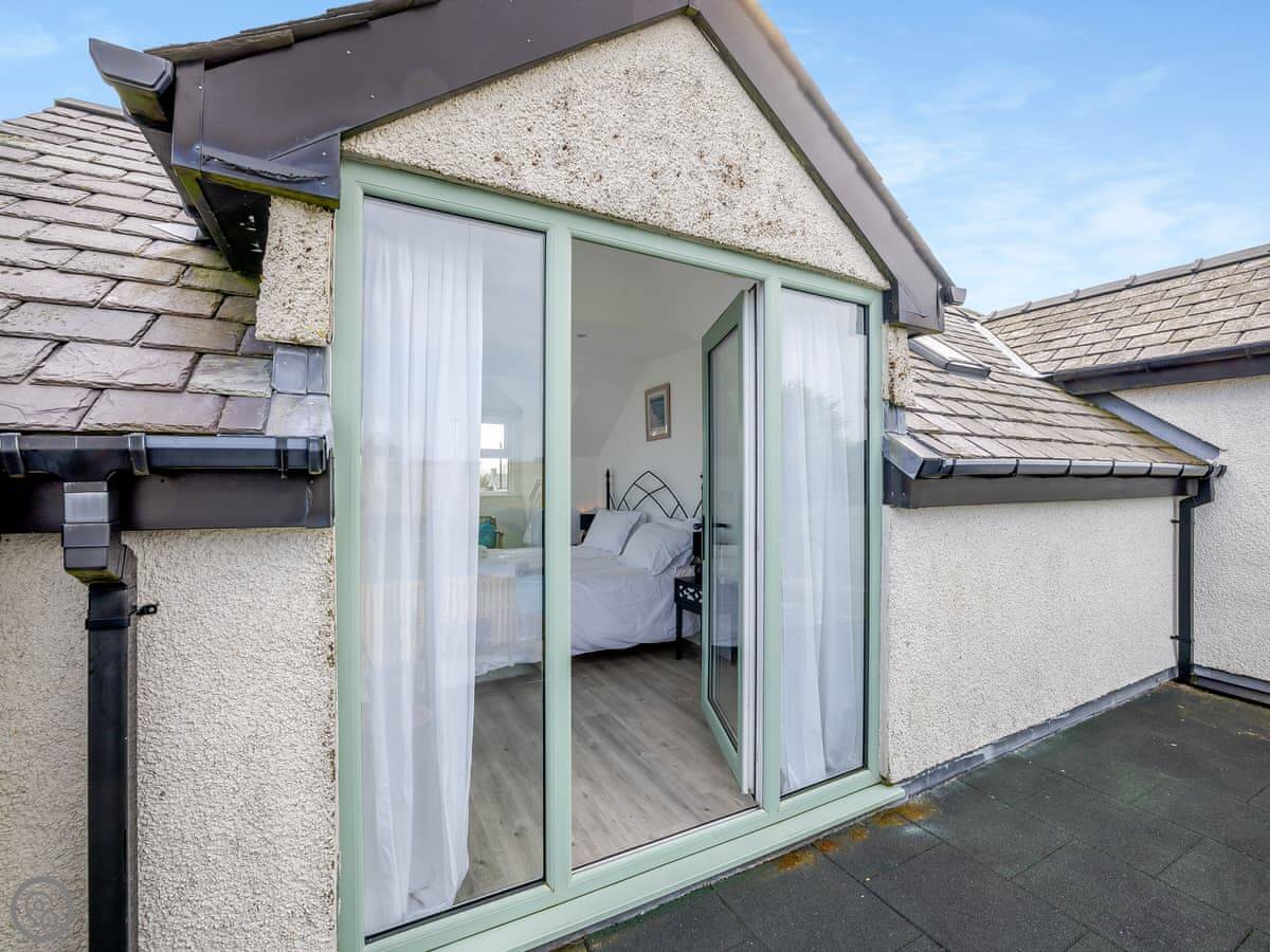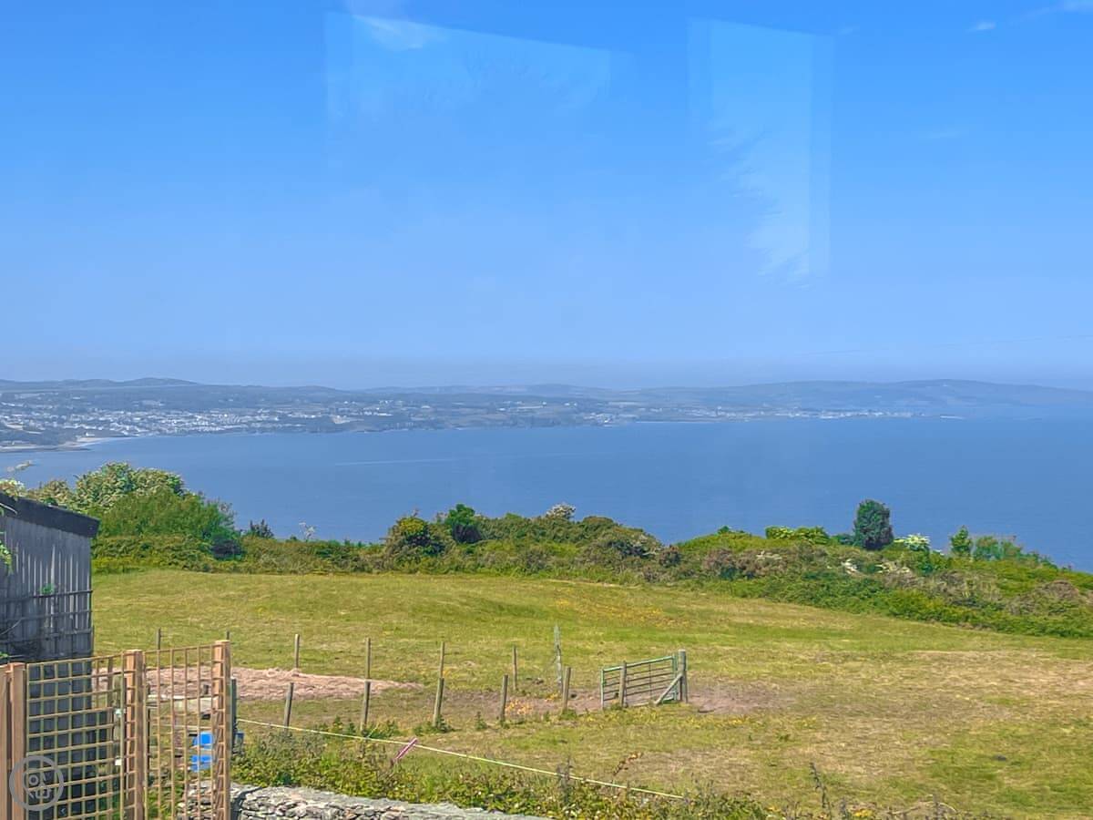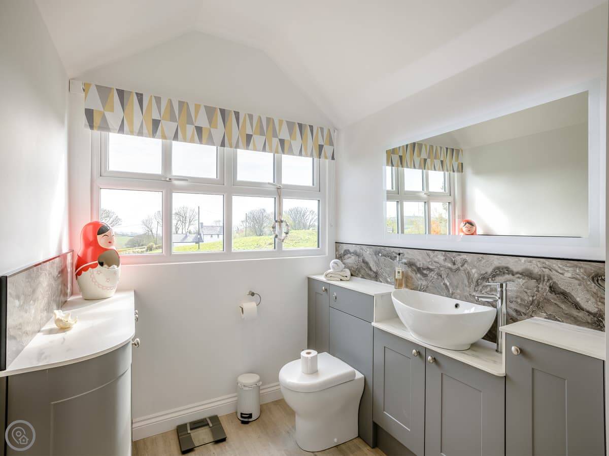 It's a five star place, which means it's well put together. It sleeps eight people. There are four bedrooms and three bathrooms. Two bedrooms and a Jack and Jill bathroom are downstairs. The main bedroom upstairs has a balcony looking out to sea, a walk-in wardrobe, and a big bathroom with a separate shower. The living area is open plan, good for a group. There's a wood burner for cooler evenings.