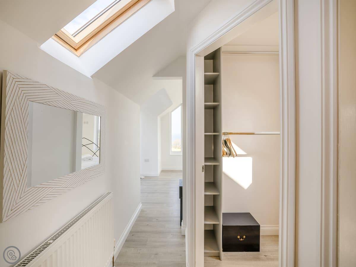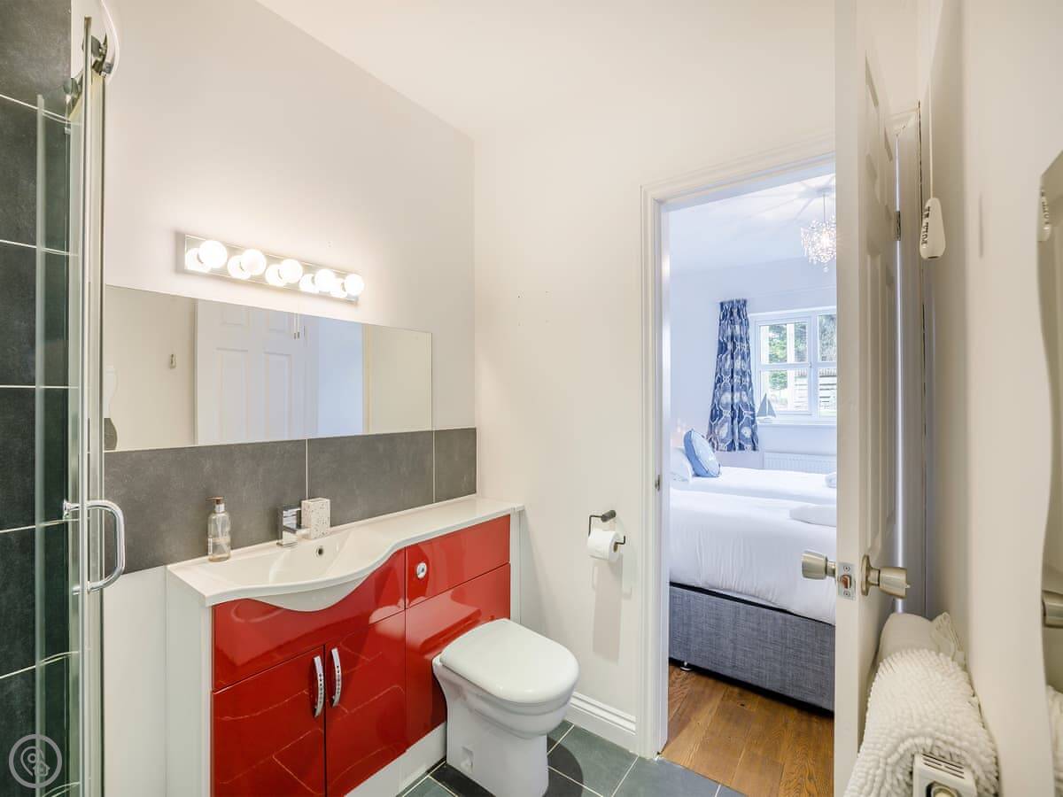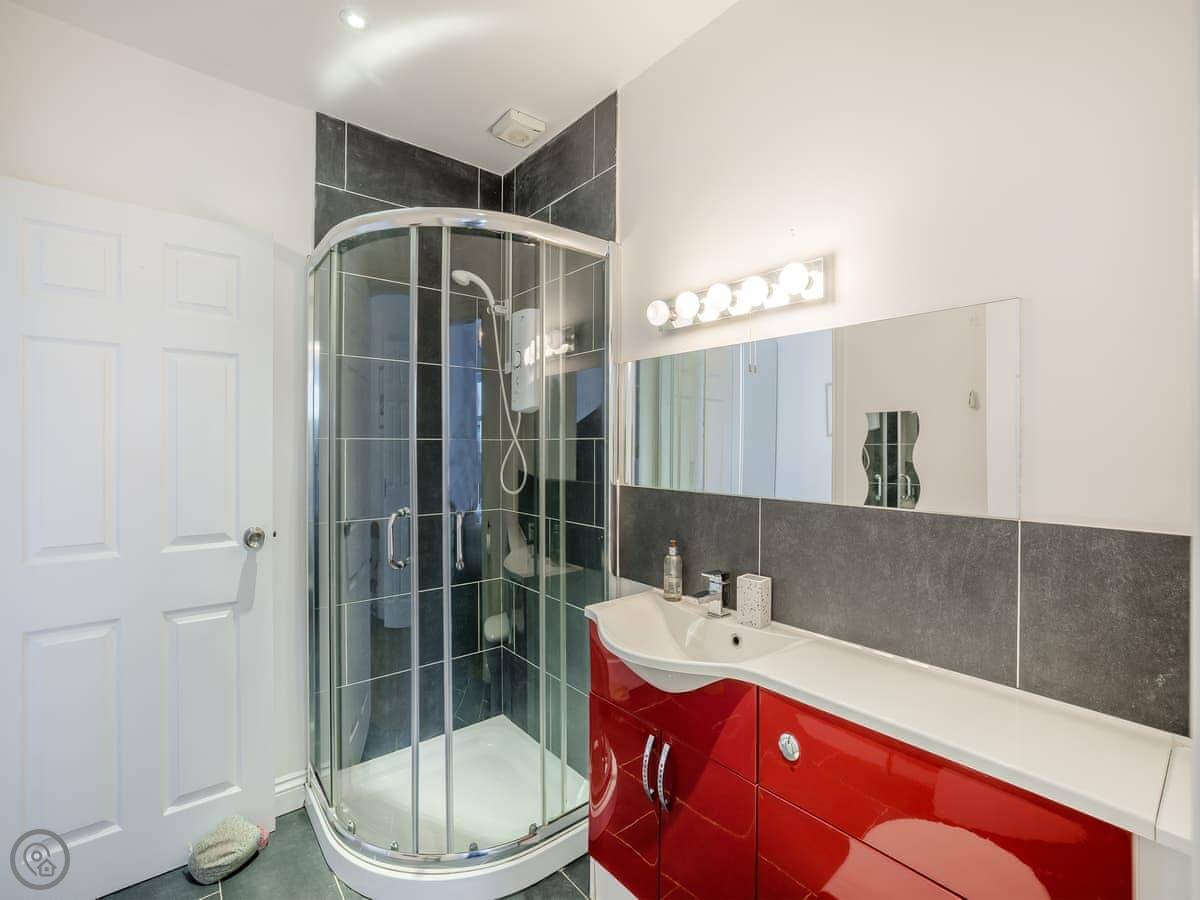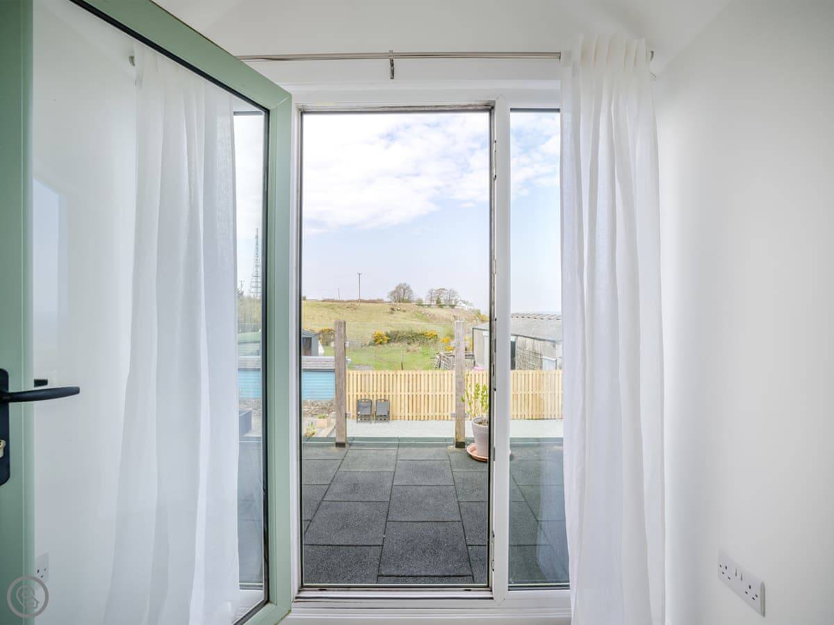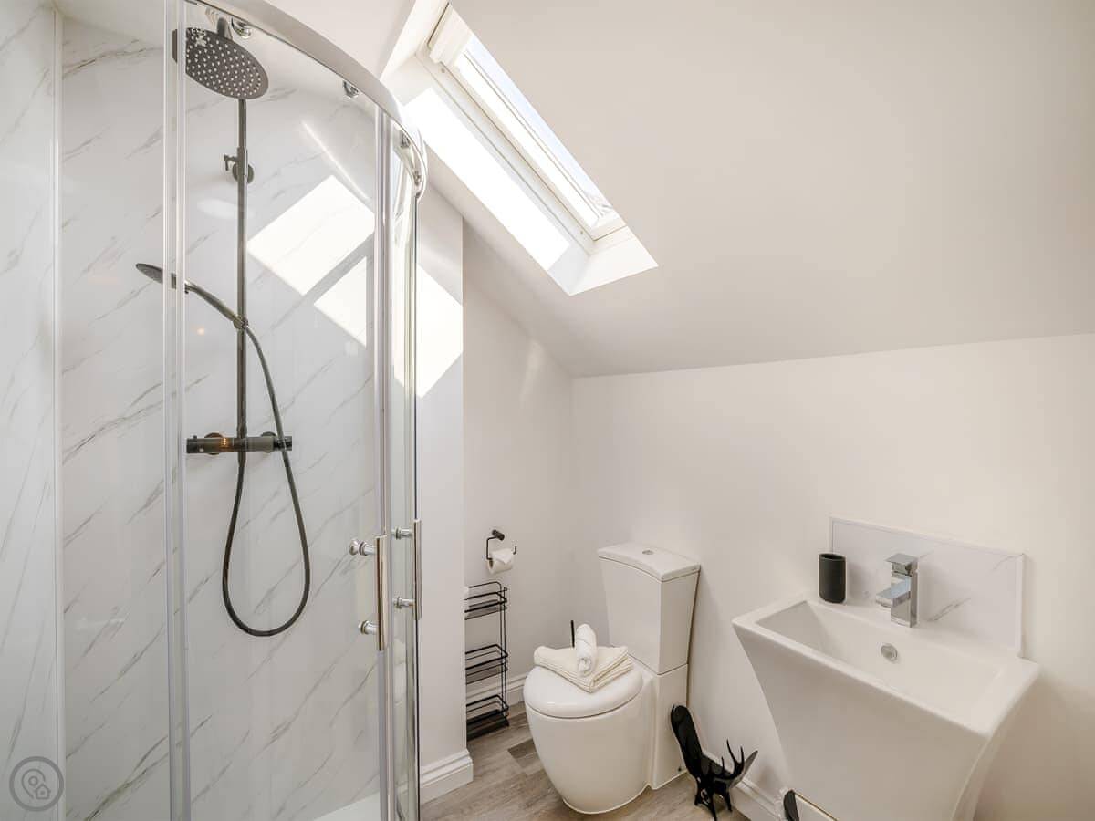 It's a five star place, which means it's well put together. It sleeps eight people. There are four bedrooms and three bathrooms. Two bedrooms and a Jack and Jill bathroom are downstairs. The main bedroom upstairs has a balcony looking out to sea, a walk-in wardrobe, and a big bathroom with a separate shower. The living area is open plan, good for a group. There's a wood burner for cooler evenings.