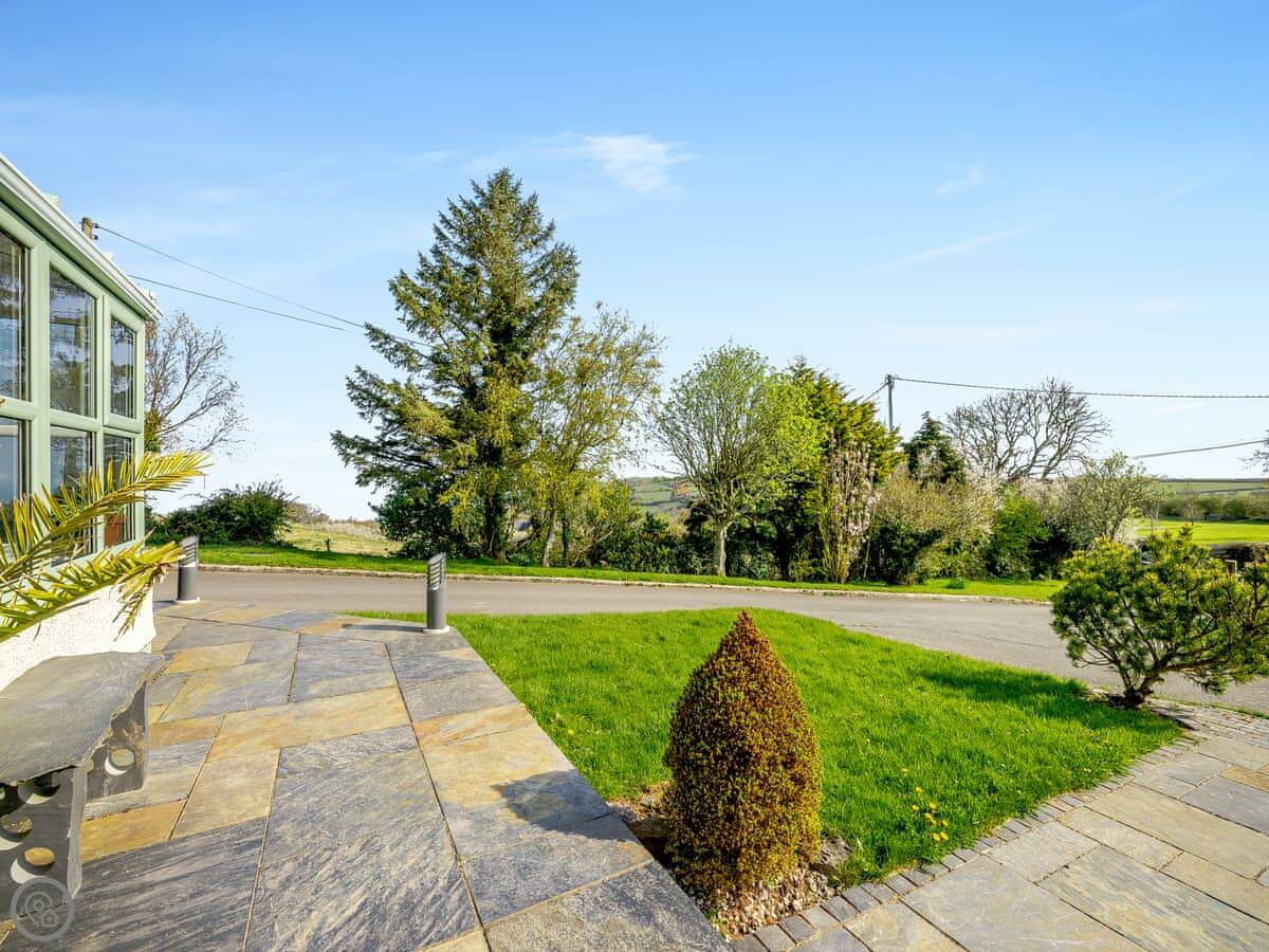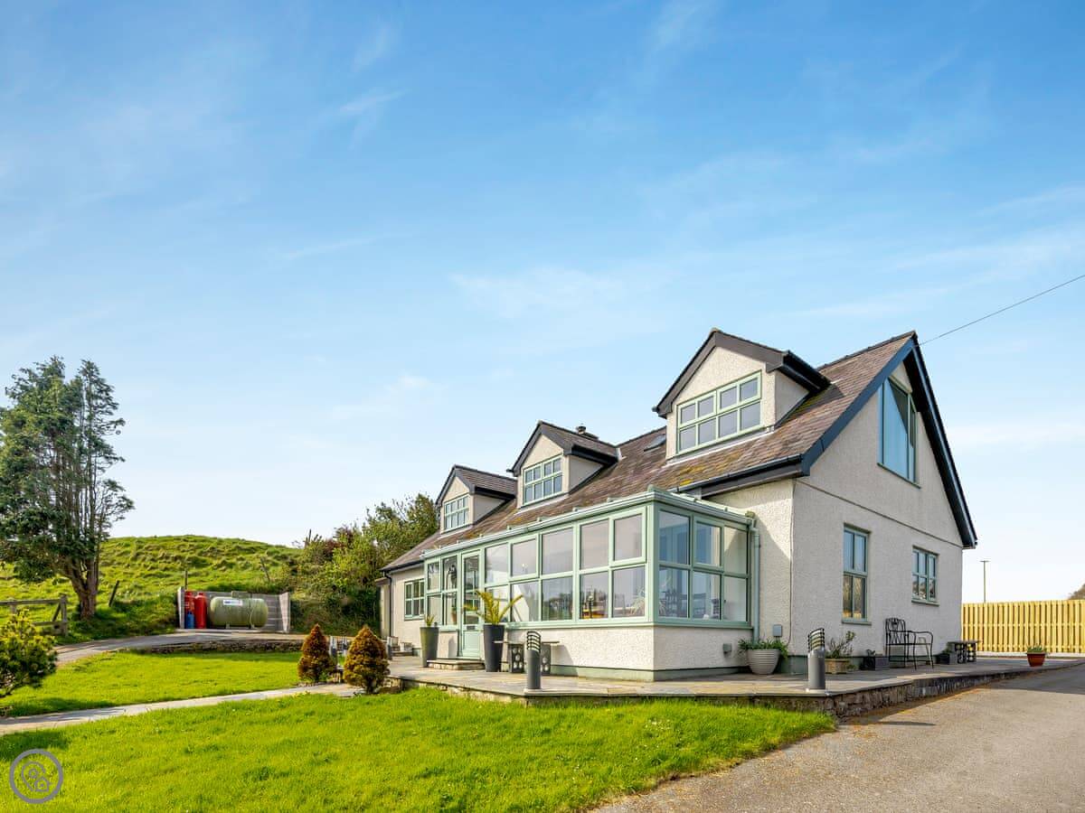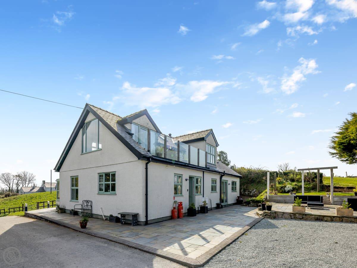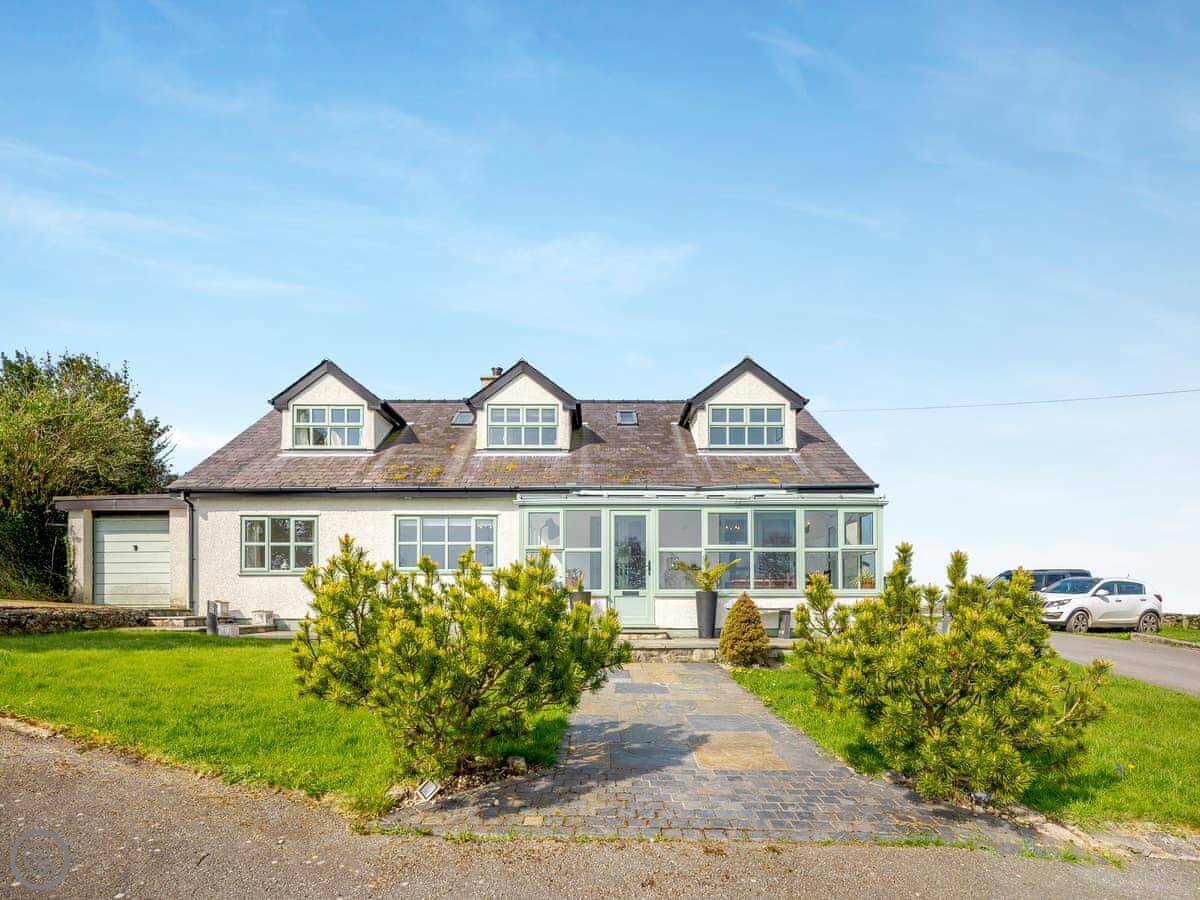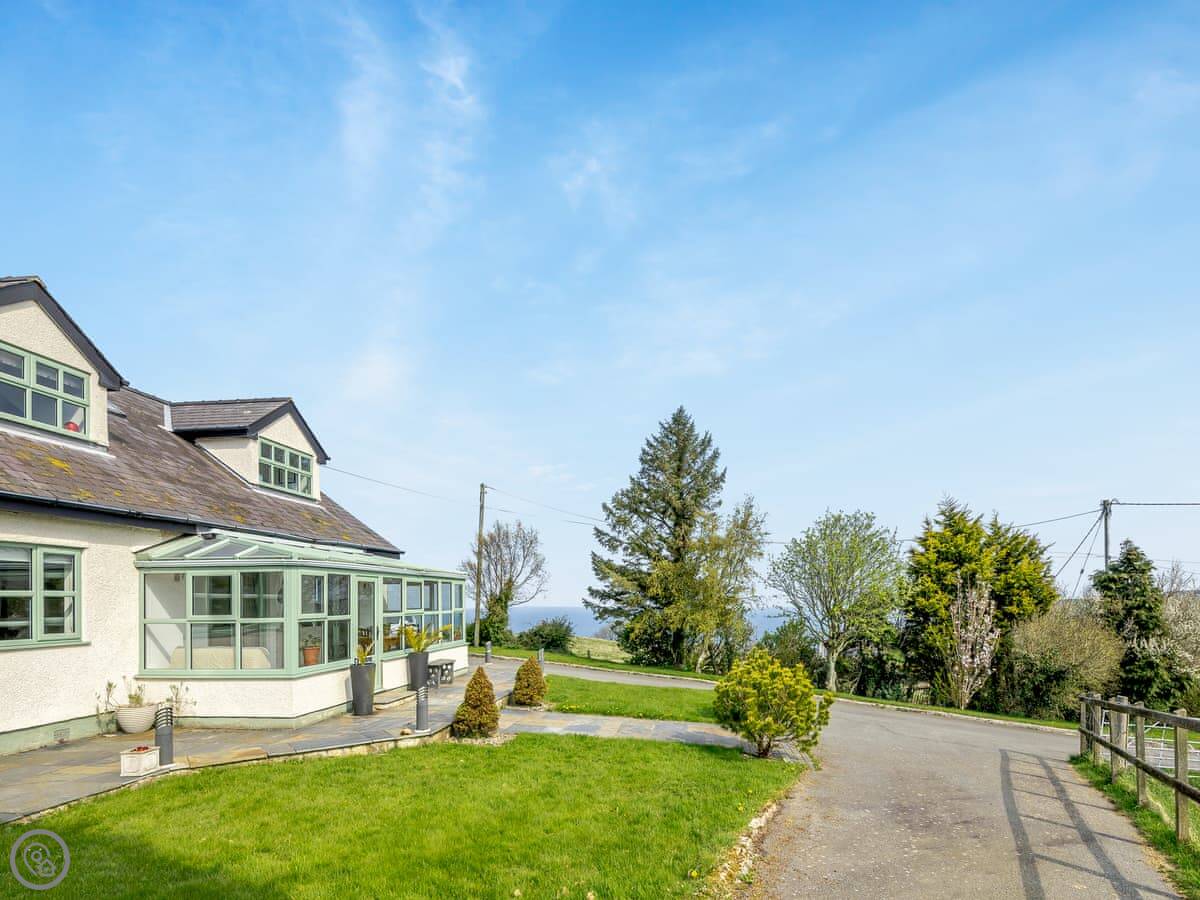 This is Ty Newydd. It's a detached house in Llanddona on Anglesey. The name just means 'new house'. There's a big garden and a long driveway. You can see the sea from the front.