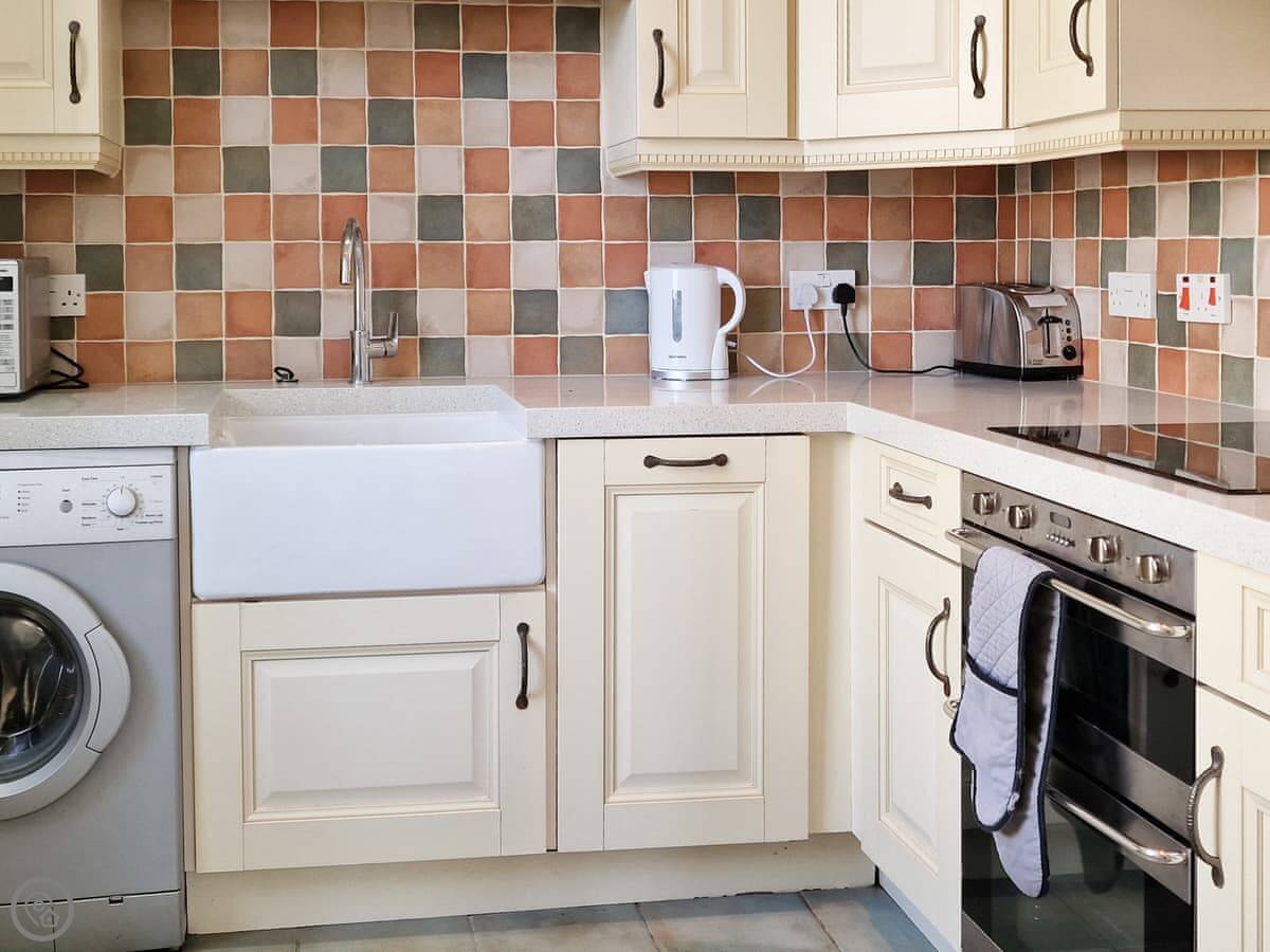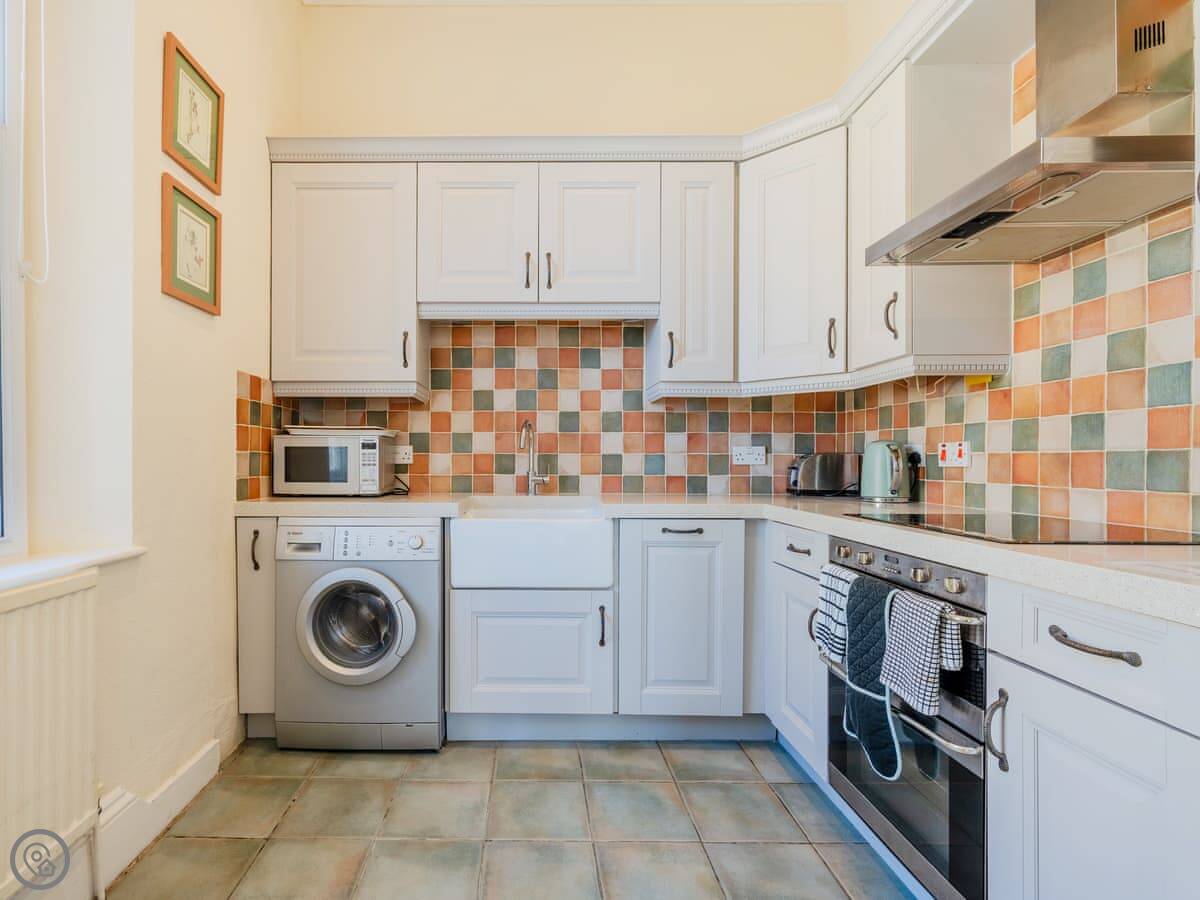 The kitchen has what you need. There's a washing machine and a dishwasher. Parking for one car round the back.
