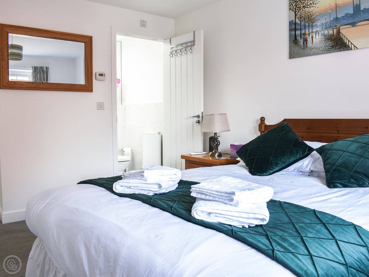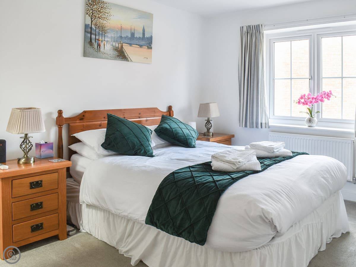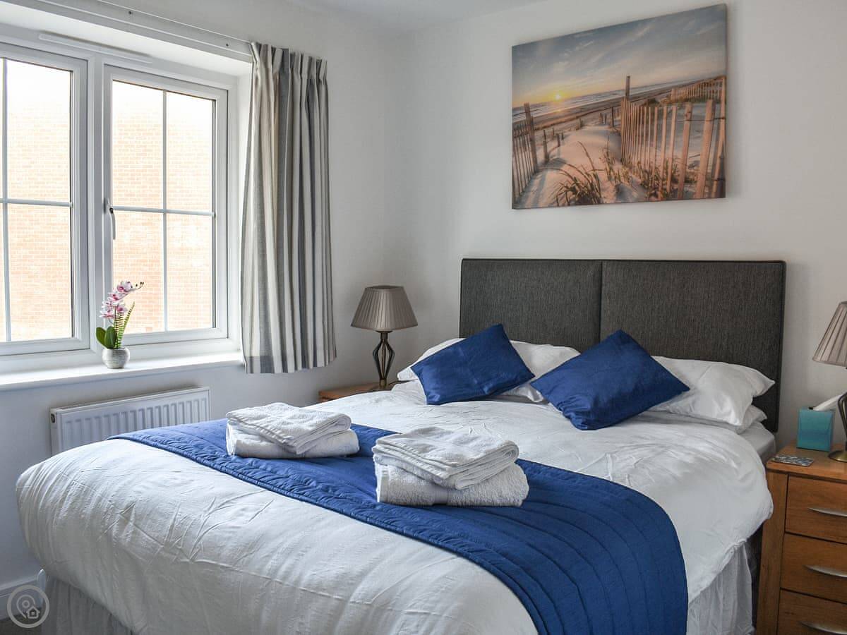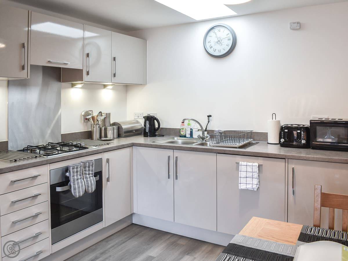 It sleeps four, in two bedrooms. Each room has its own bathroom, which is handy. It’s got a 4 Star rating. The living space is open plan, with a decent sized kitchen and a comfortable sofa area. There’s a washing machine and a dishwasher.