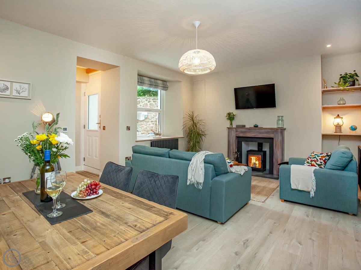 Inside, it's a good size. There's a wood burner in the living room. The kitchen is a galley style, but it's got everything you'd need, including a dishwasher and washing machine. The patio out front is enclosed, so it's secure for a dog.