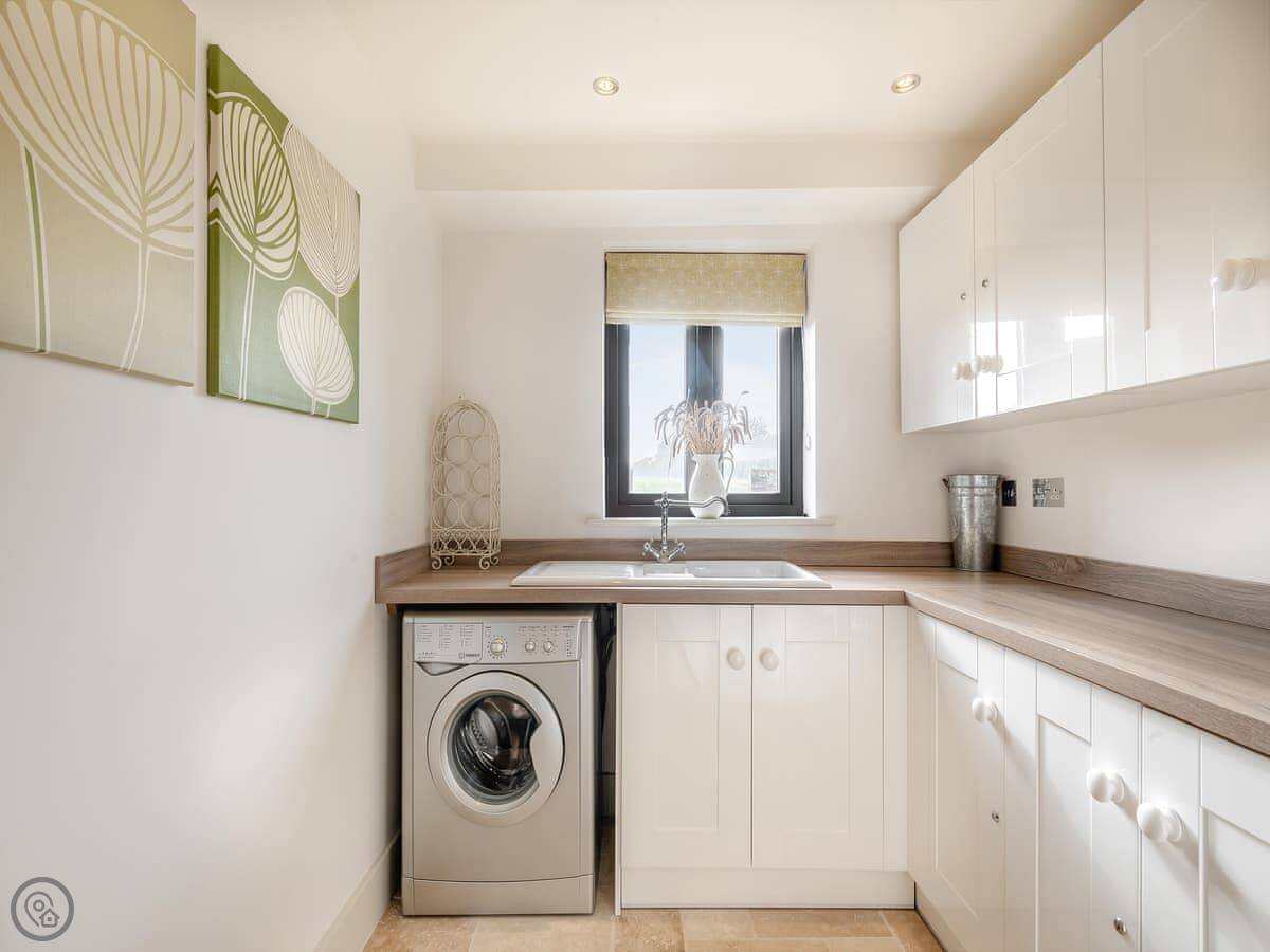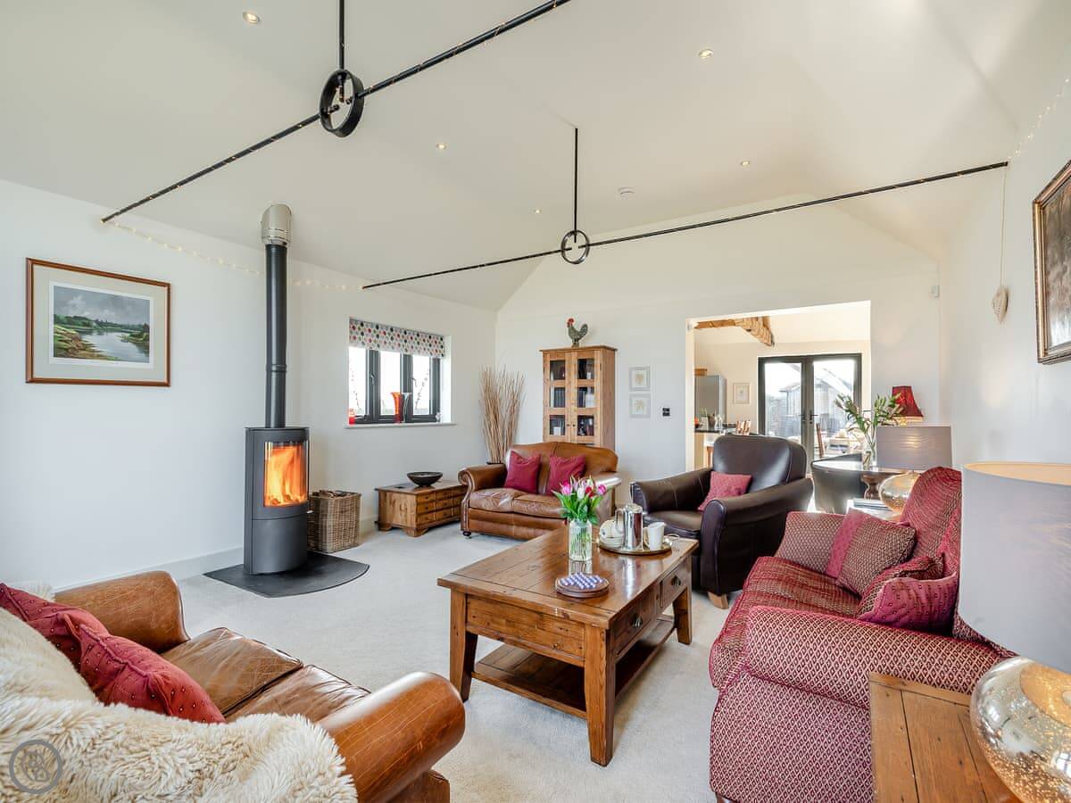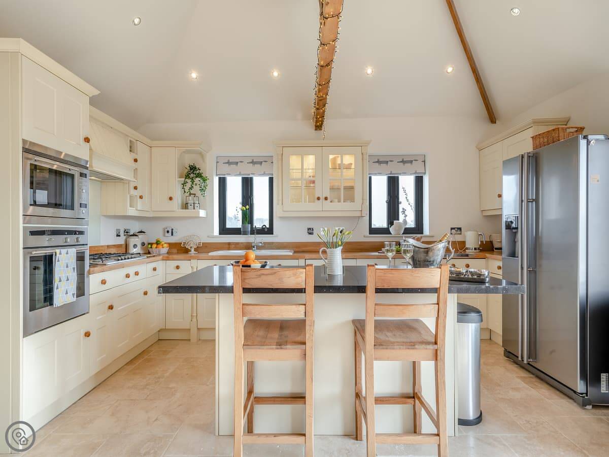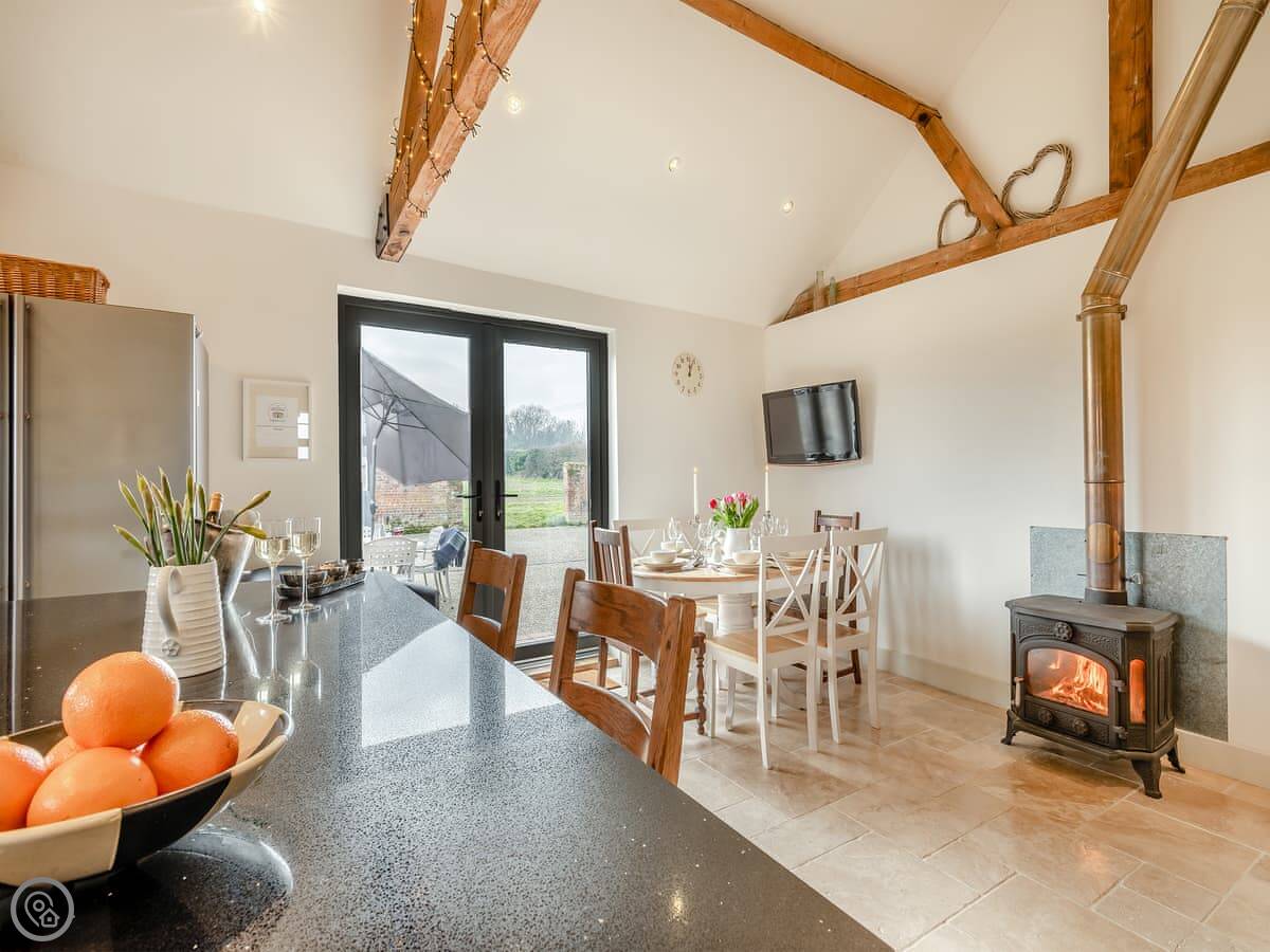 Inside, it’s all open plan. Vaulted ceiling, exposed beams. There are two wood burners, one in the dining area and one in the sitting area. The kitchen has a breakfast island. There’s a TV, WiFi, and a washing machine. All bedding is included. There’s a cot and a highchair if you need them.