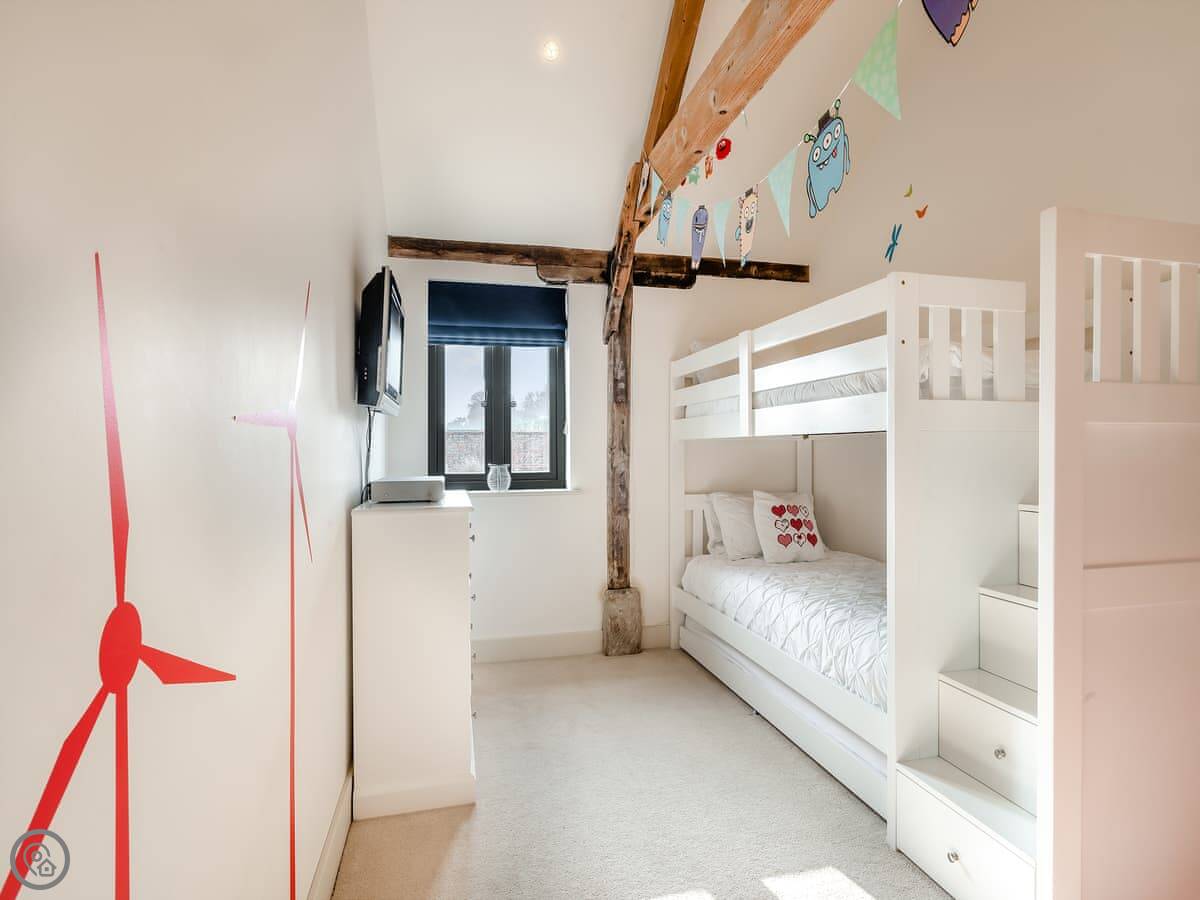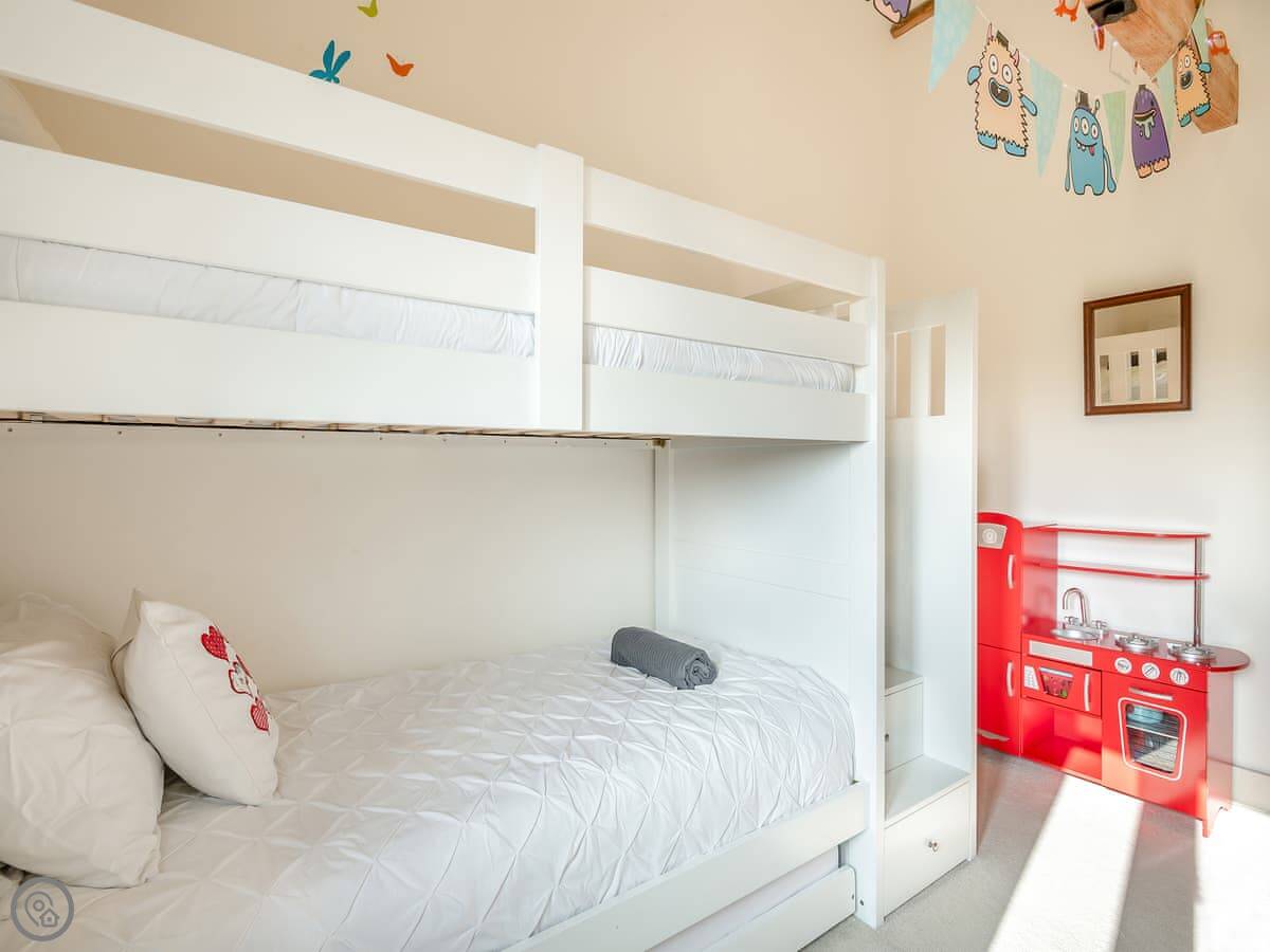 It’s got a 5 Star rating. That means it's well-finished and comfortable. Sleeps eight. Four bedrooms: two king-size beds, a twin room, and a bunk room for kids. Two bathrooms, one is en-suite to the main bedroom.
