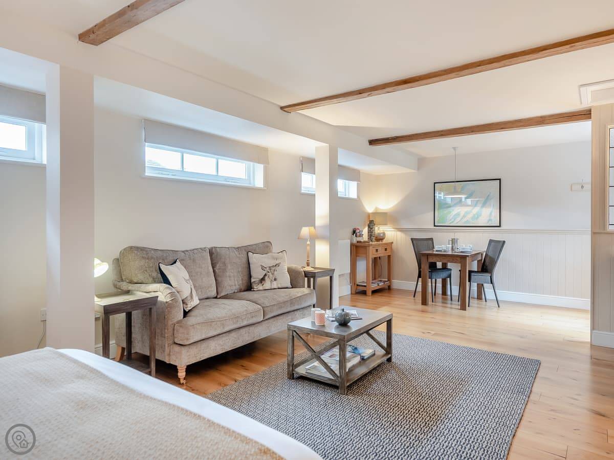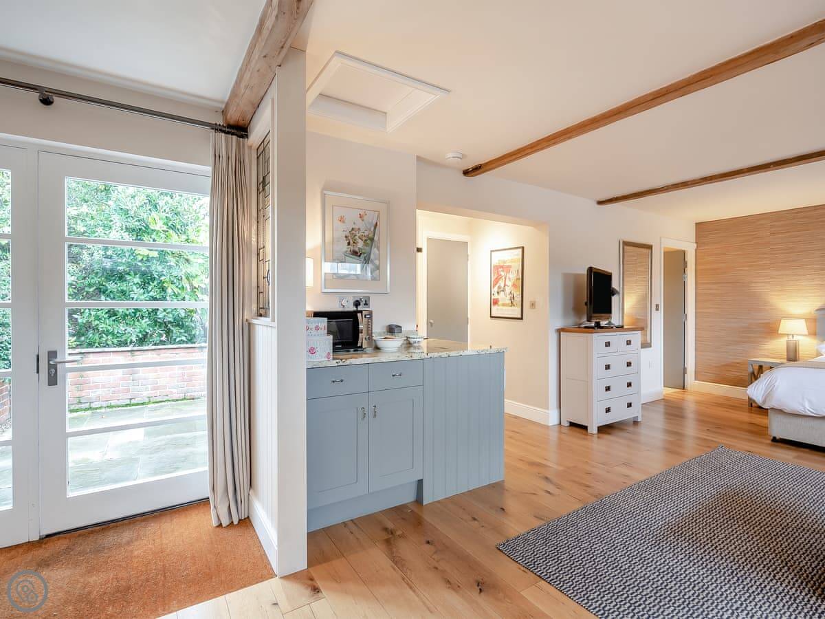 This stylish, self-contained, open-plan barn has been tastefully furnished and fitted out to the highest standard. There is a kingsize bed making sleeping a dream, a luxurious walk-in shower room and a wonderfully spacious living area with sofa bed. There is also a dining area with a modern fully appointed kitchen, with a fridge well stocked with breakfast ingredients for your stay.