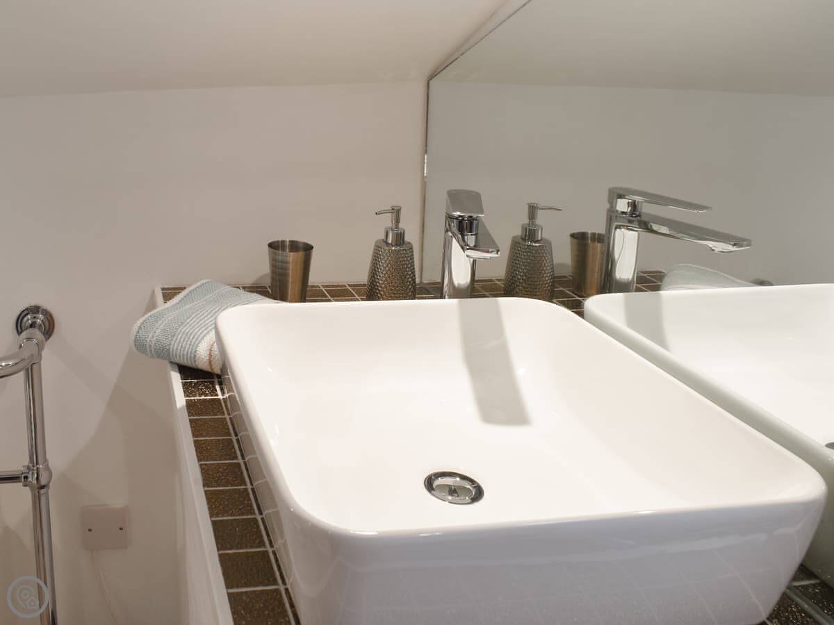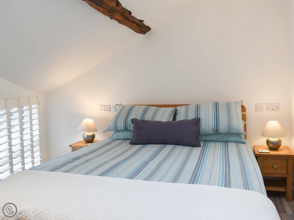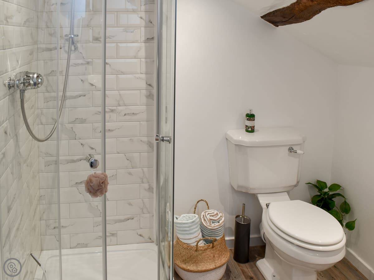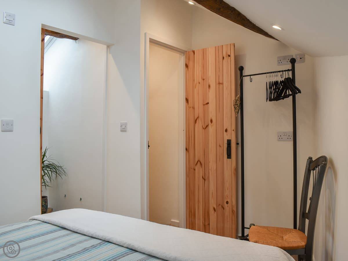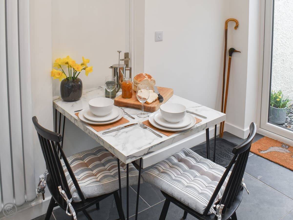 Through the back is the kitchen. It's got everything you need, including a dishwasher. The dining table is there too. Upstairs is just the one bedroom with a kingsize bed. The shower room is en-suite.