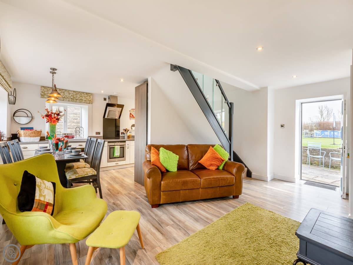 The living space is all open plan. Kitchen, dining table, sofas. It's a normal kitchen with a dishwasher and washing machine. The sofas face a smart TV. It's a 5 Star place, which means it's been checked for quality and is well equipped.