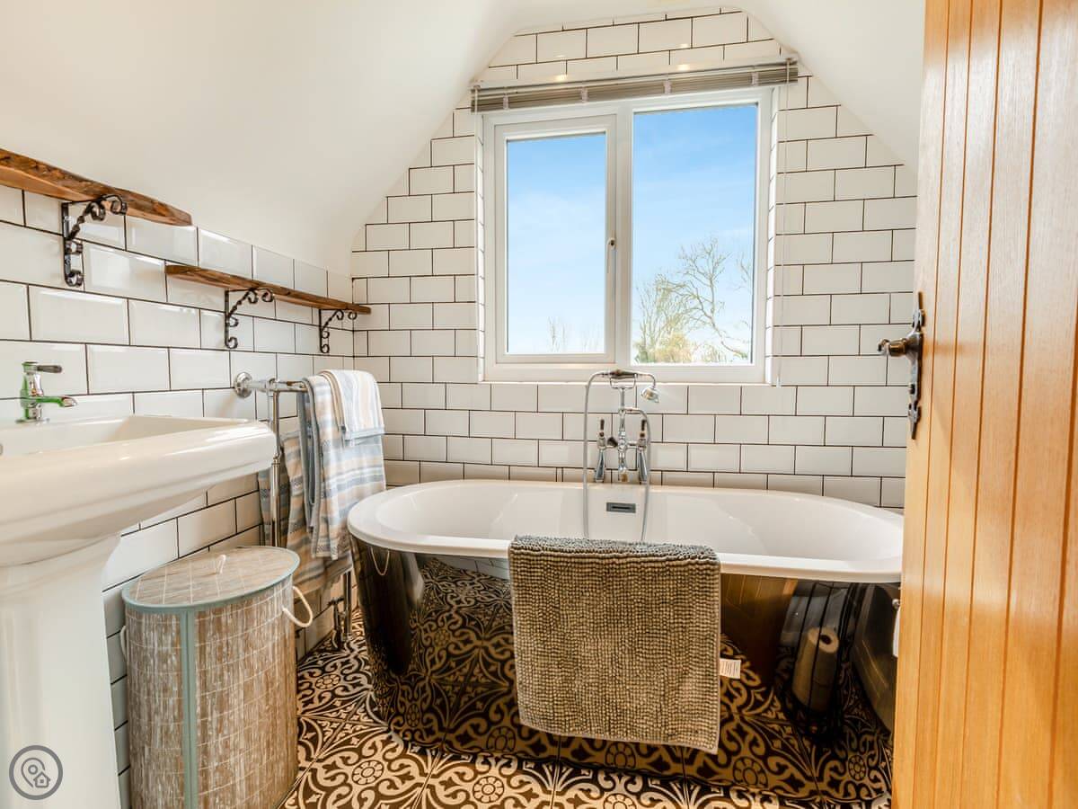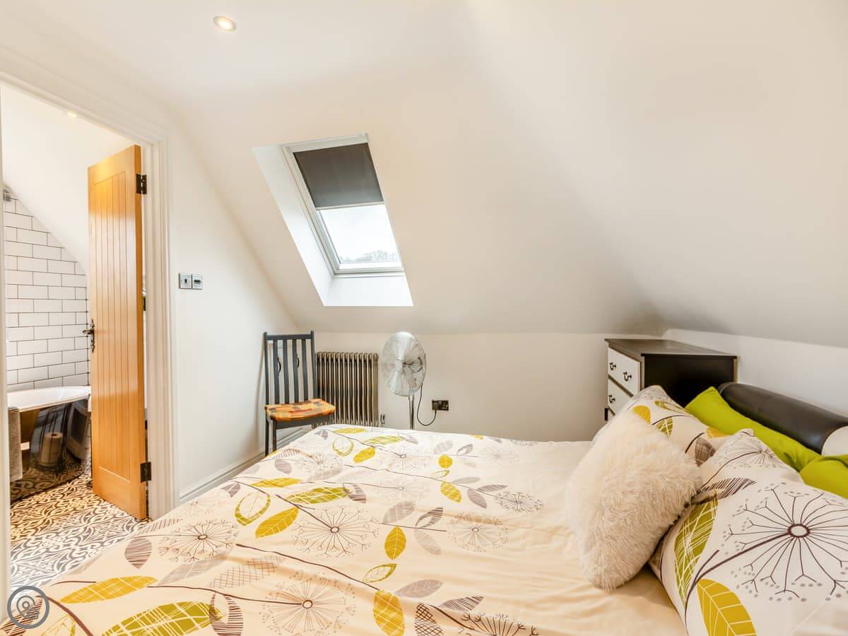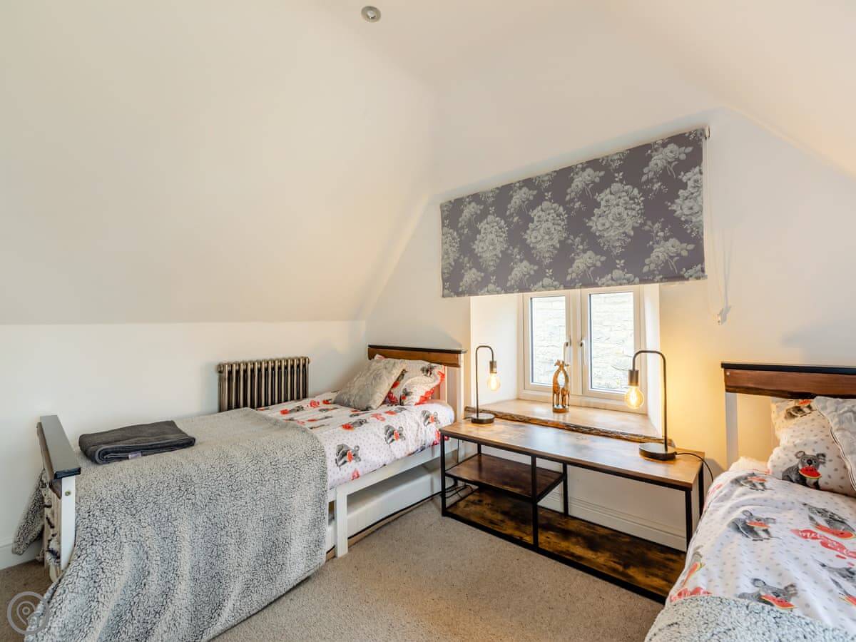 It sleeps eight people. There are four bedrooms. Two are downstairs, one is a king size and it has a door through to another room with a double bed. Upstairs there's a big double with an en-suite bathroom that has a roll-top bath, and a twin room. There's also a shower room on the ground floor.