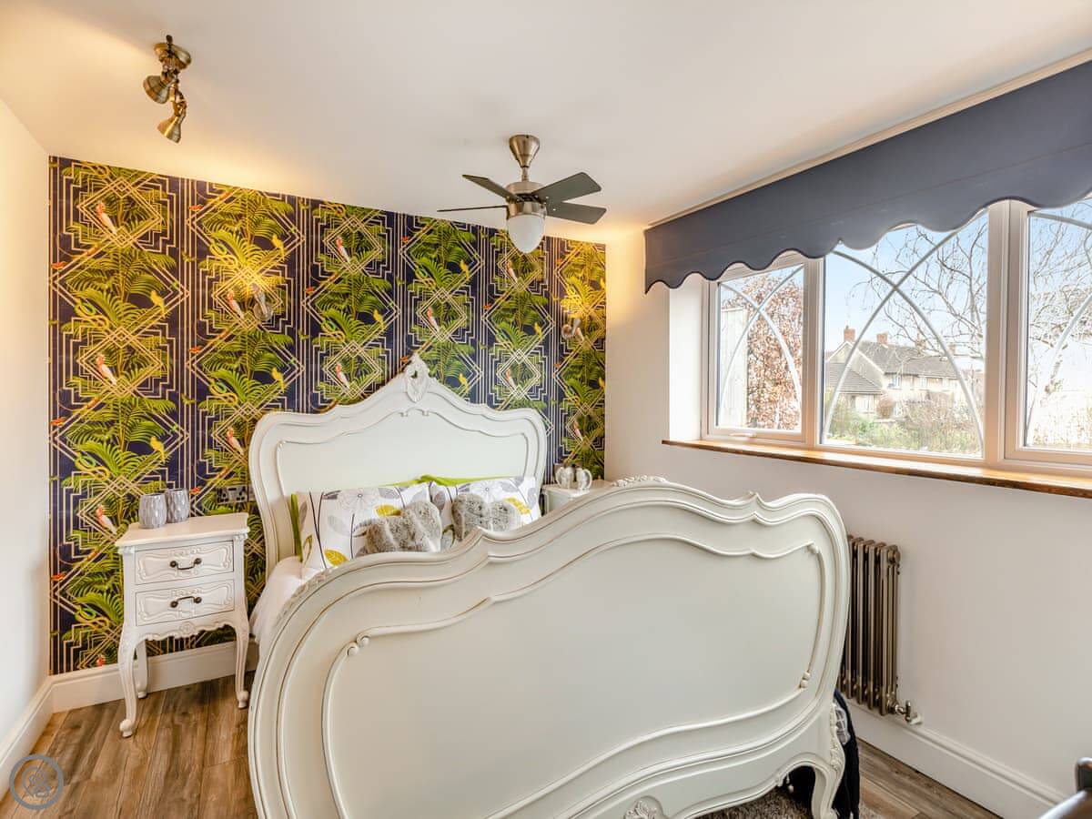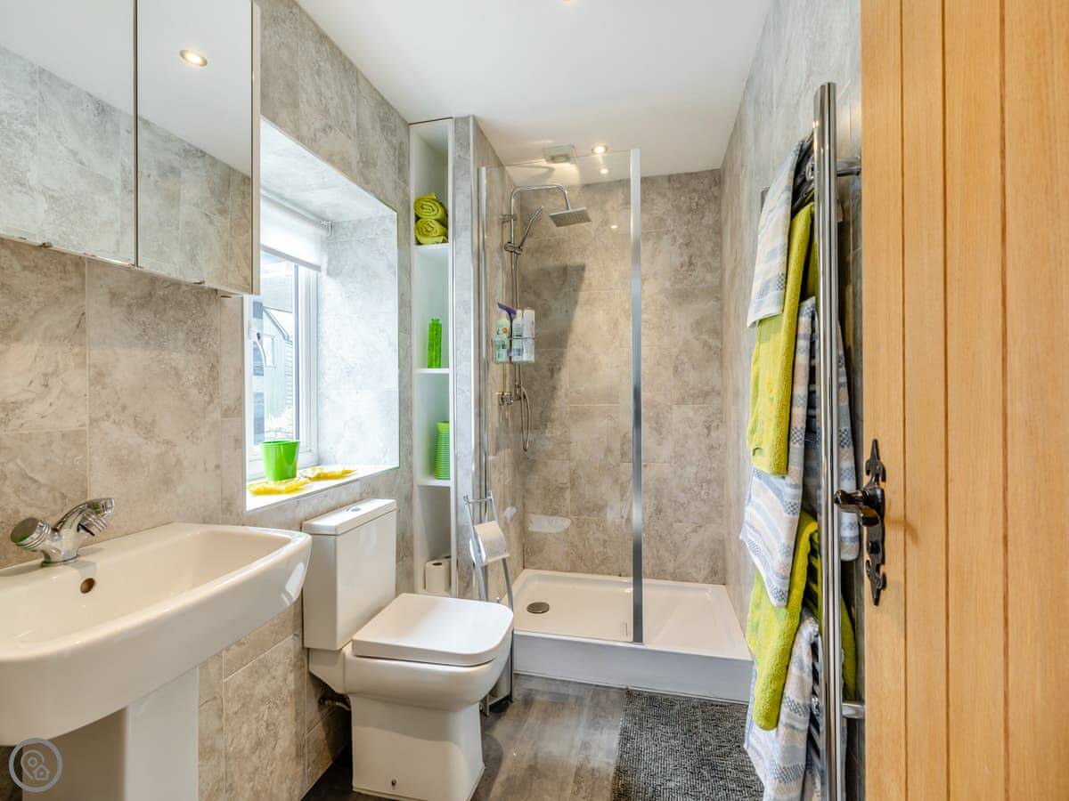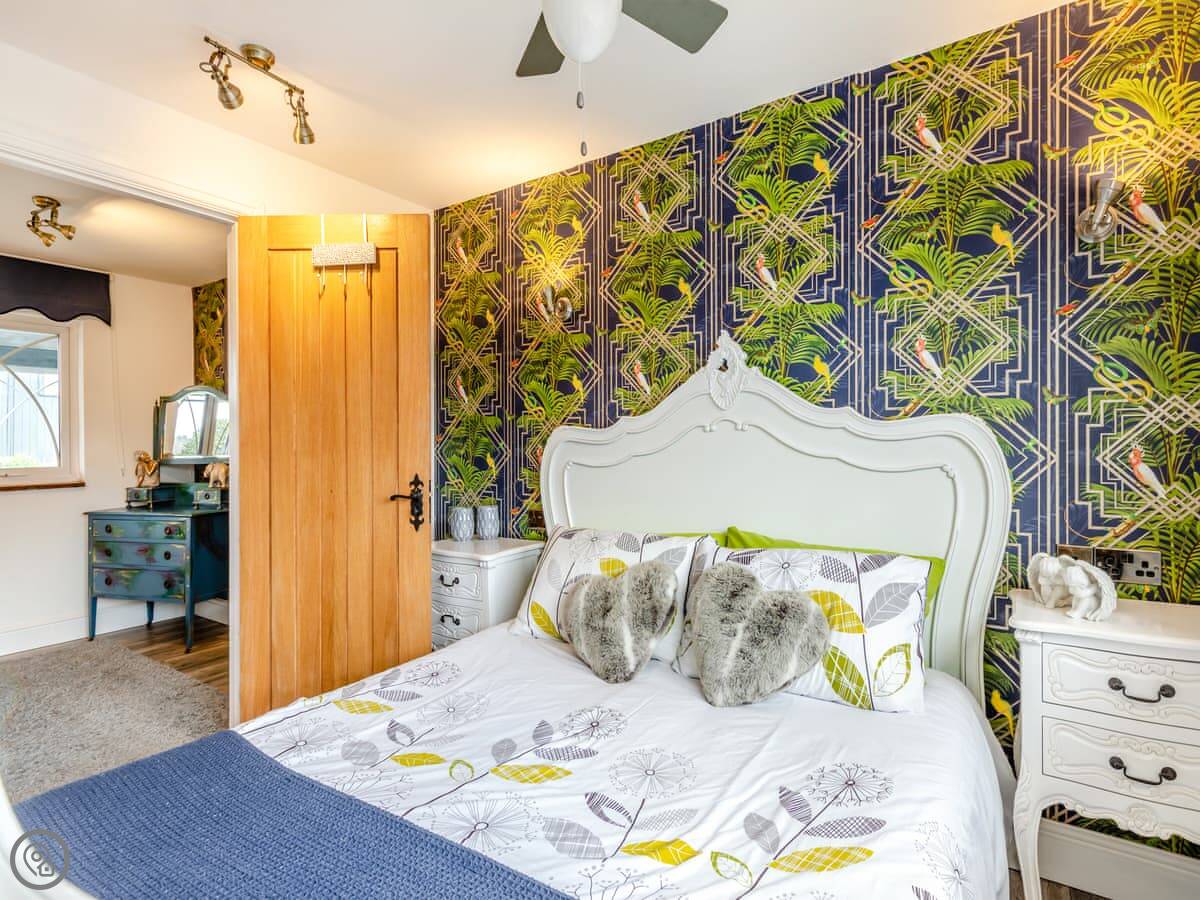 It sleeps eight people. There are four bedrooms. Two are downstairs, one is a king size and it has a door through to another room with a double bed. Upstairs there's a big double with an en-suite bathroom that has a roll-top bath, and a twin room. There's also a shower room on the ground floor.