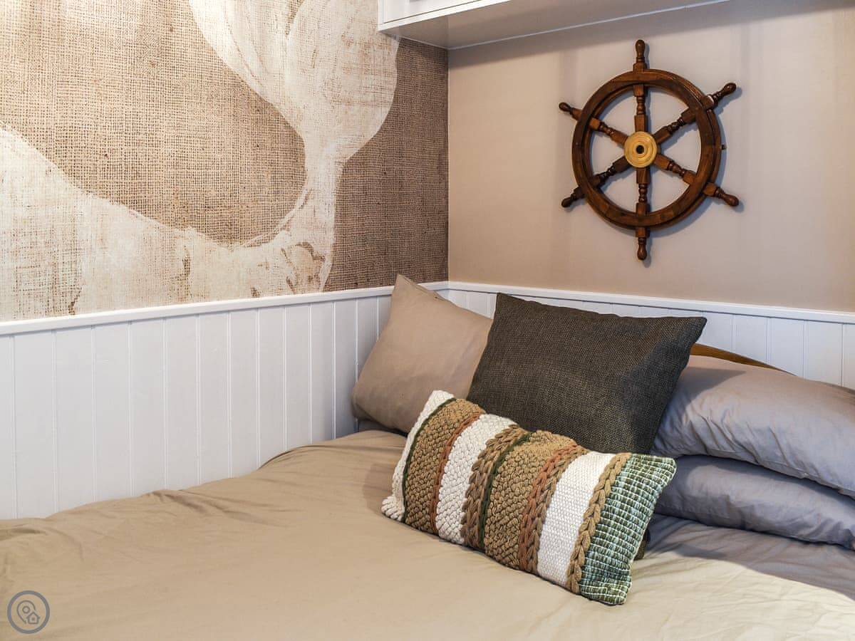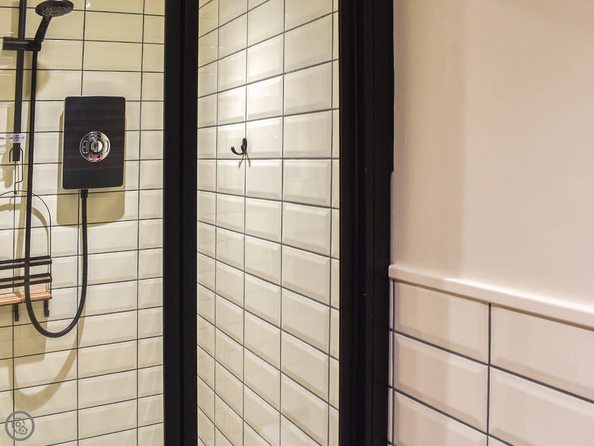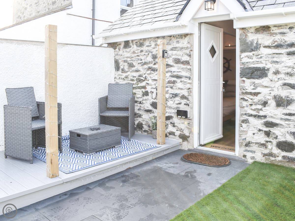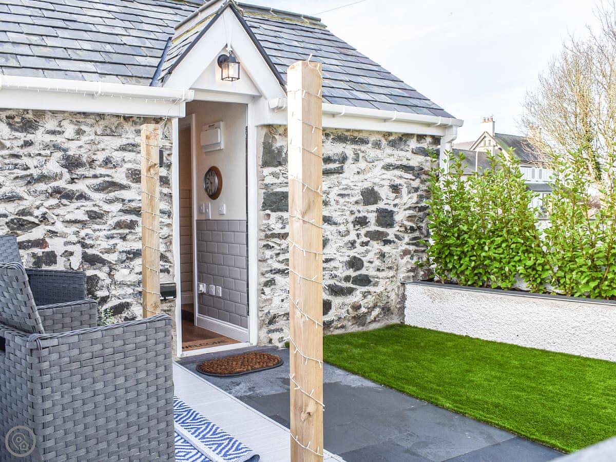 The main space is open plan. You've got the bed in one corner and a small kitchen in the other. The shower room is separate and modern. The patio and garden are enclosed, which is useful with a dog.