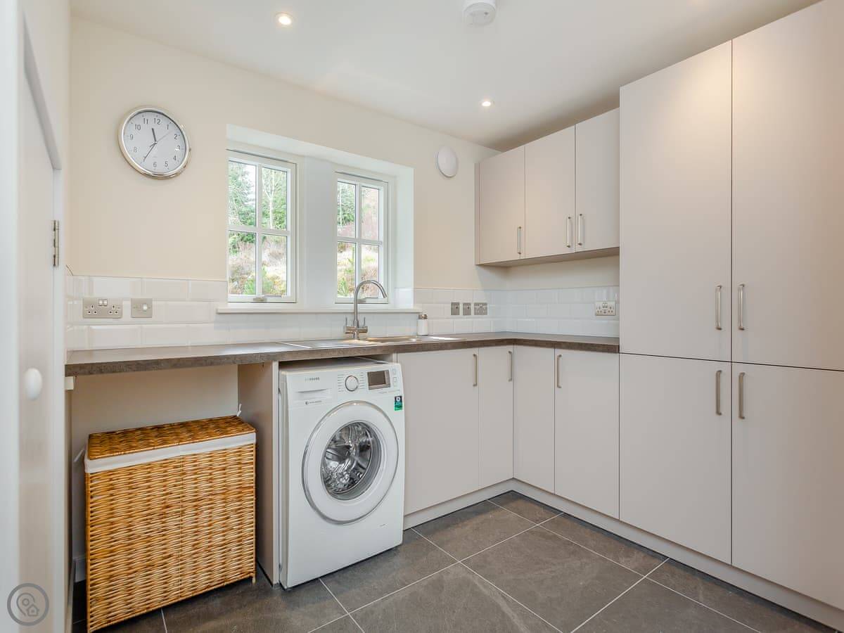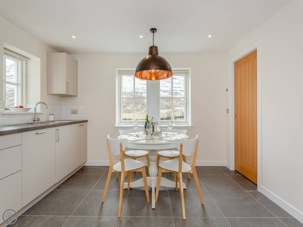 Downstairs, there's a kitchen with a dining table by the window. The view from there is over the water. There's a snug with a sofa bed if you need it, a utility room with a washing machine and tumble dryer, and a separate toilet.