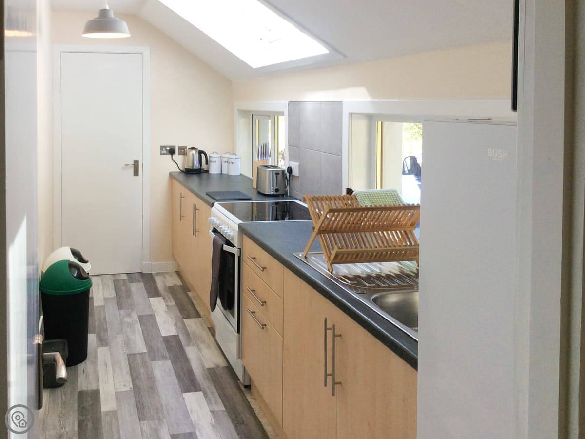 It's for two people. One bedroom, one bathroom. It's a 4 Star, so it's comfortable and well looked after. Everything's on one level, which is handy. You come in into a hall. Kitchen's to the right, it's bright and has what you need. Bathroom's opposite. The living room's at the end, with a wood burner, a sofa and a table. There's a utility room next to it with space for coats and boots.