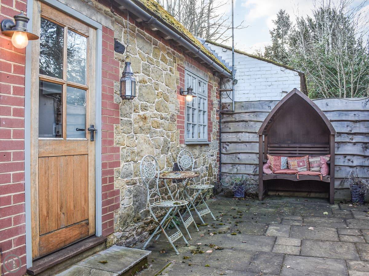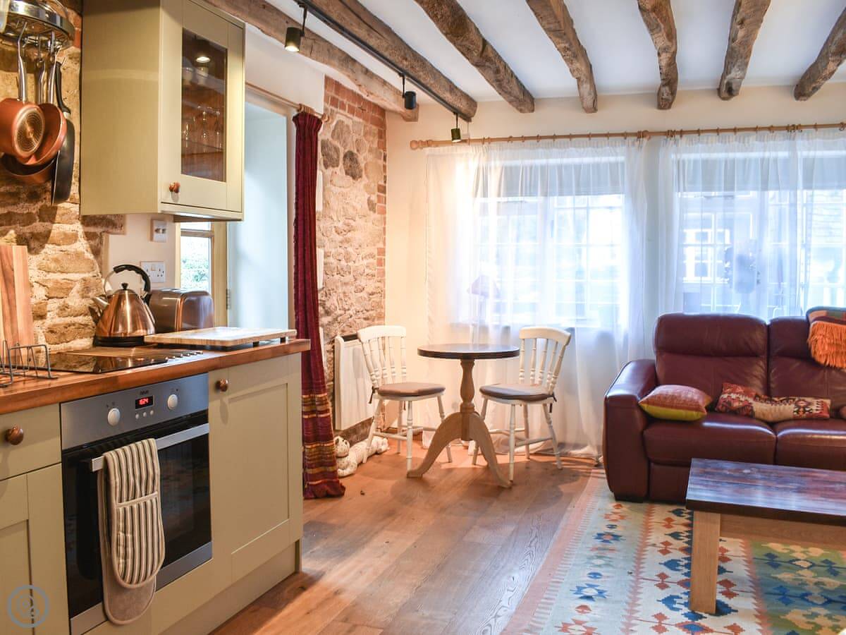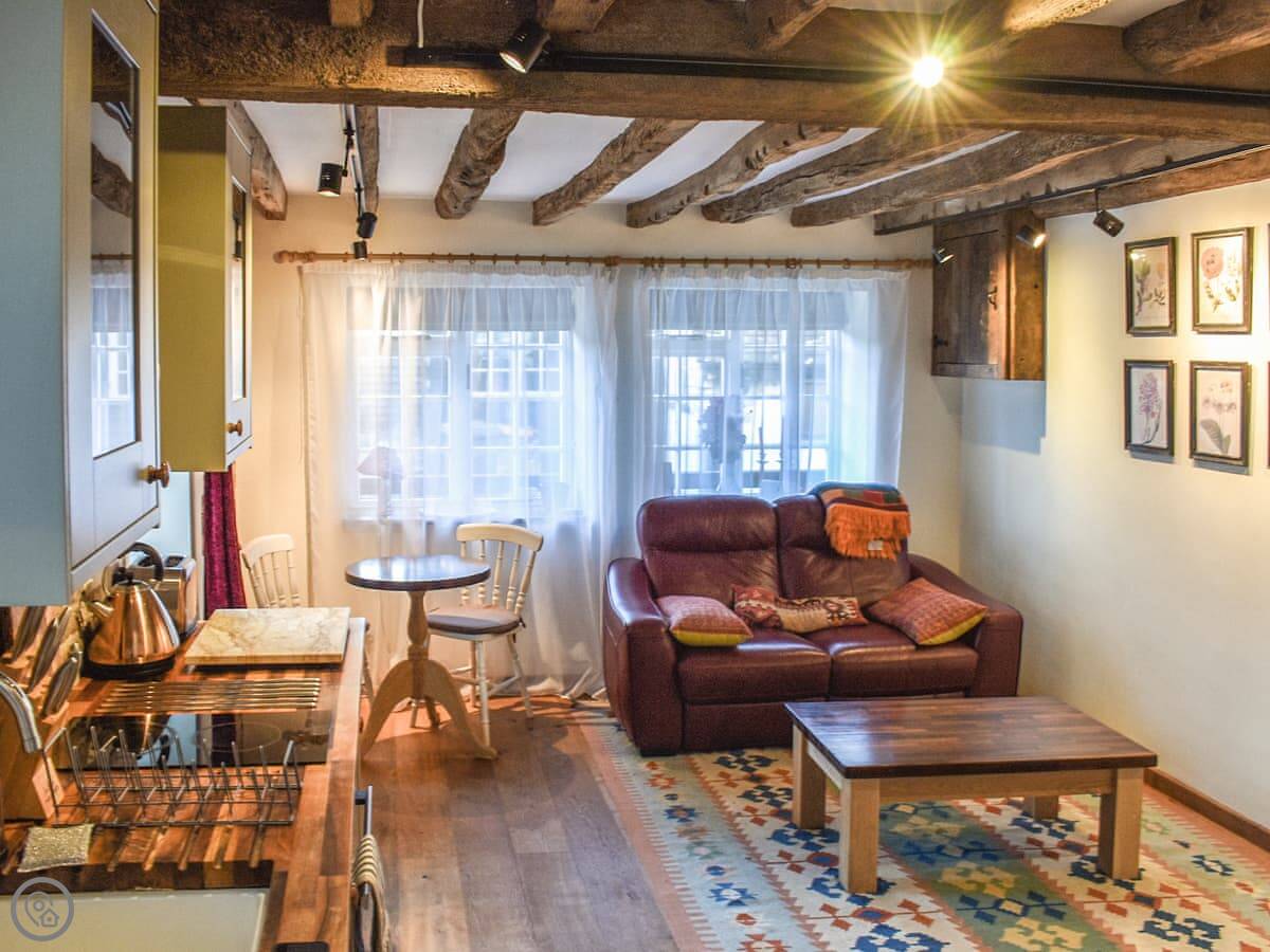 With its own enclosed courtyard garden, this is a quiet and peaceful holiday home. It was formerly an old coach house that has been stylishly refurbished whilst retaining much of the original period features. Downstairs the cottage has a lovely open plan living space with oak flooring, reclining sofa and a Smart TV. It offers a private enclosed sitting-out area with outdoor table, chairs and covered seating. Upstairs in the eaves, with countryside side views, is a carpeted bedroom with lower level kingsize bed .