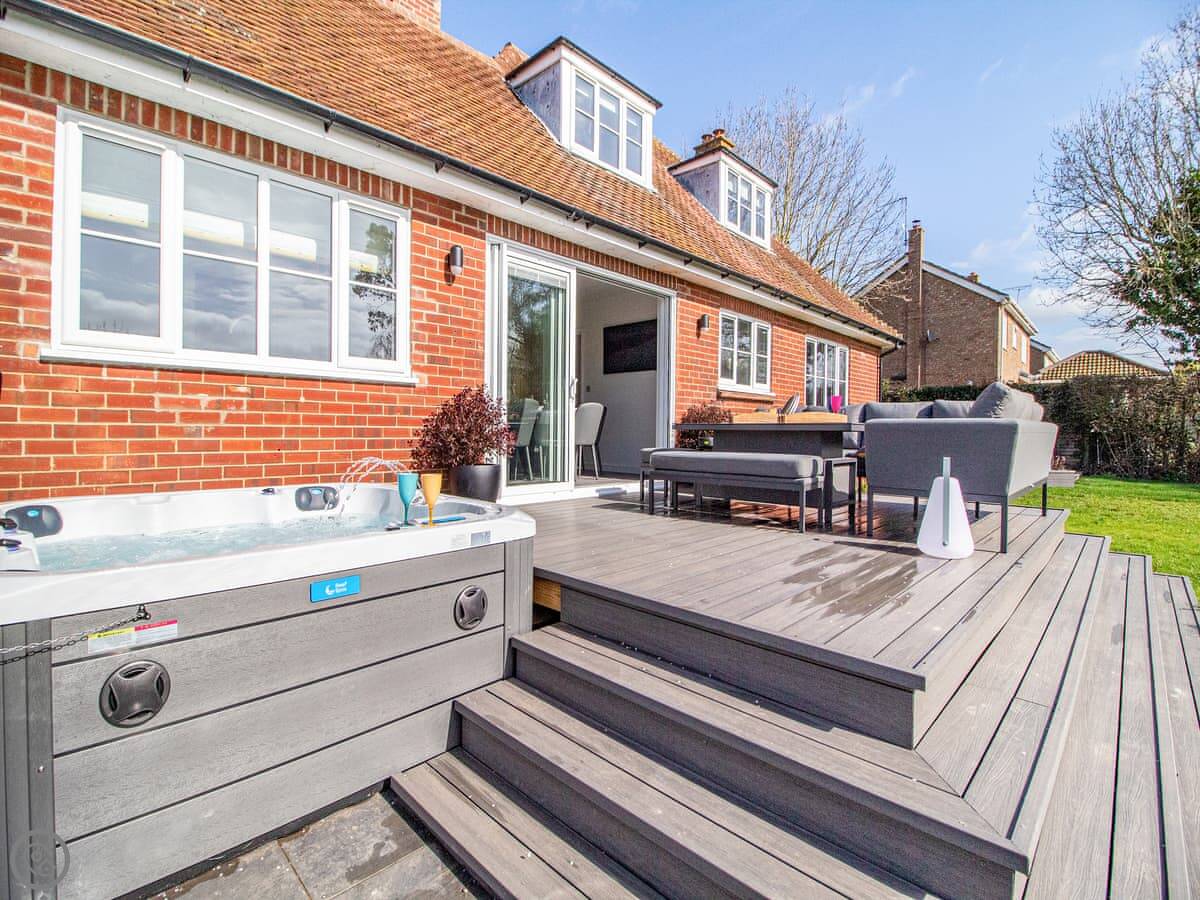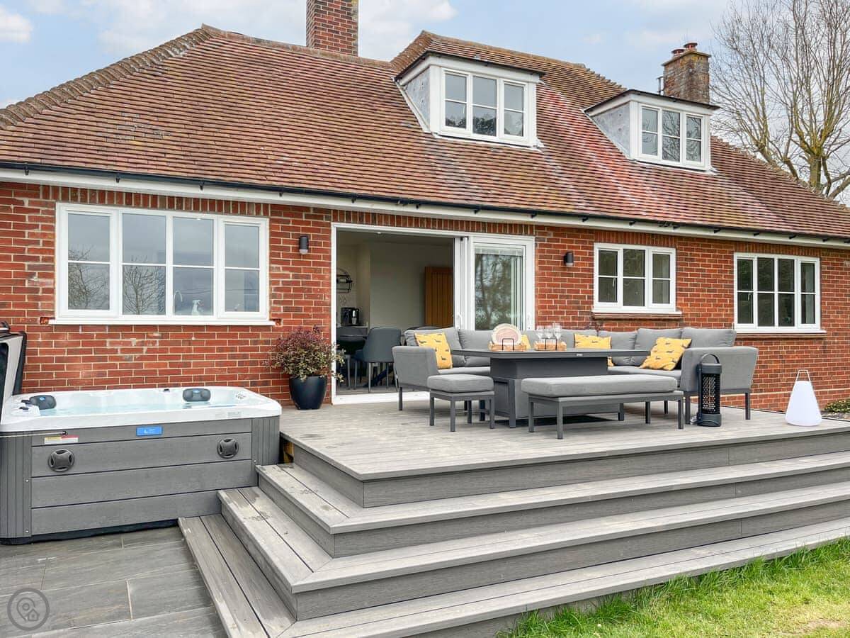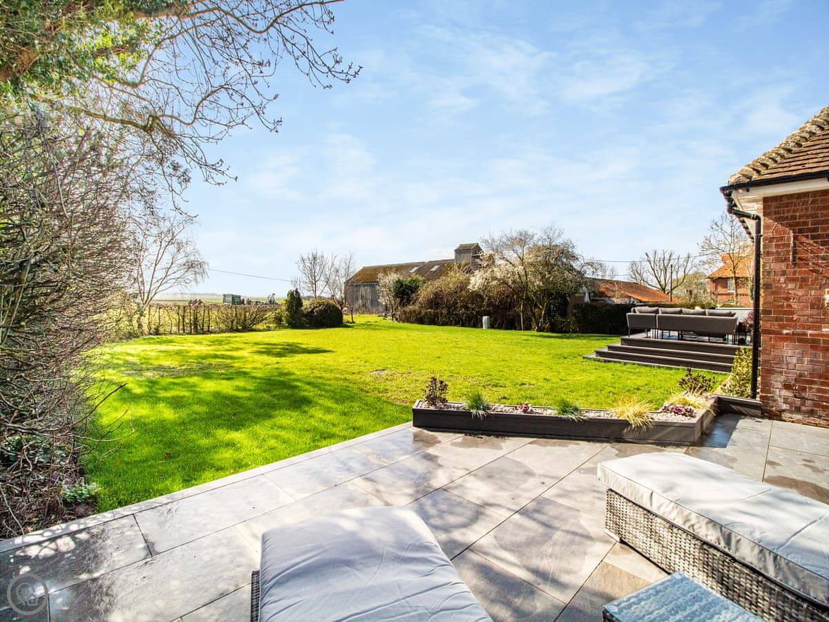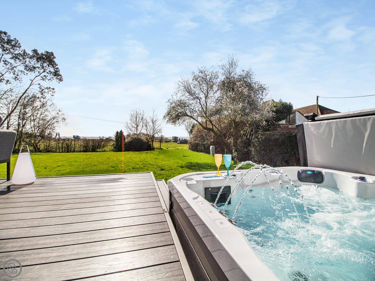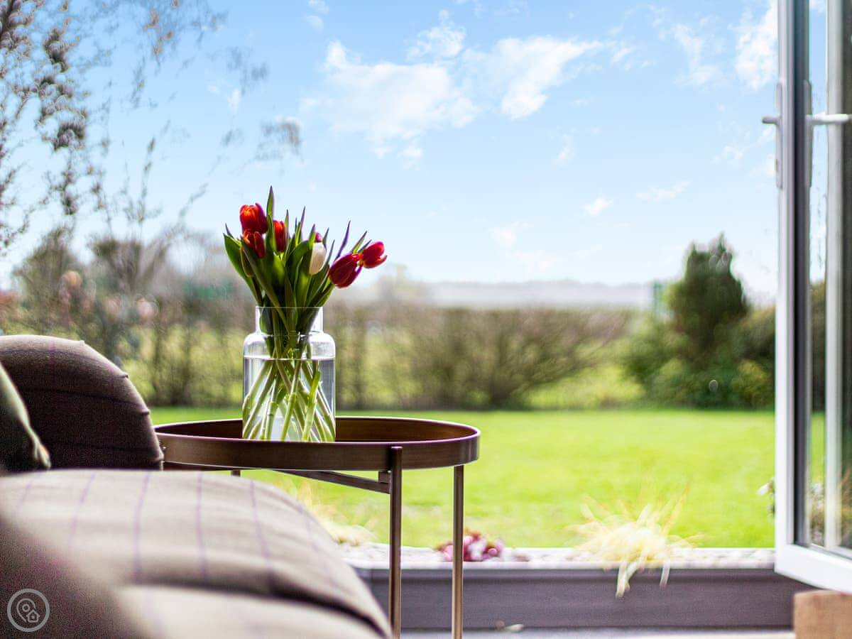 The garden is a good size, enclosed, with a patio and a lawn. There's a hot tub out there. The living room has doors that open onto it. You get a view over fields.