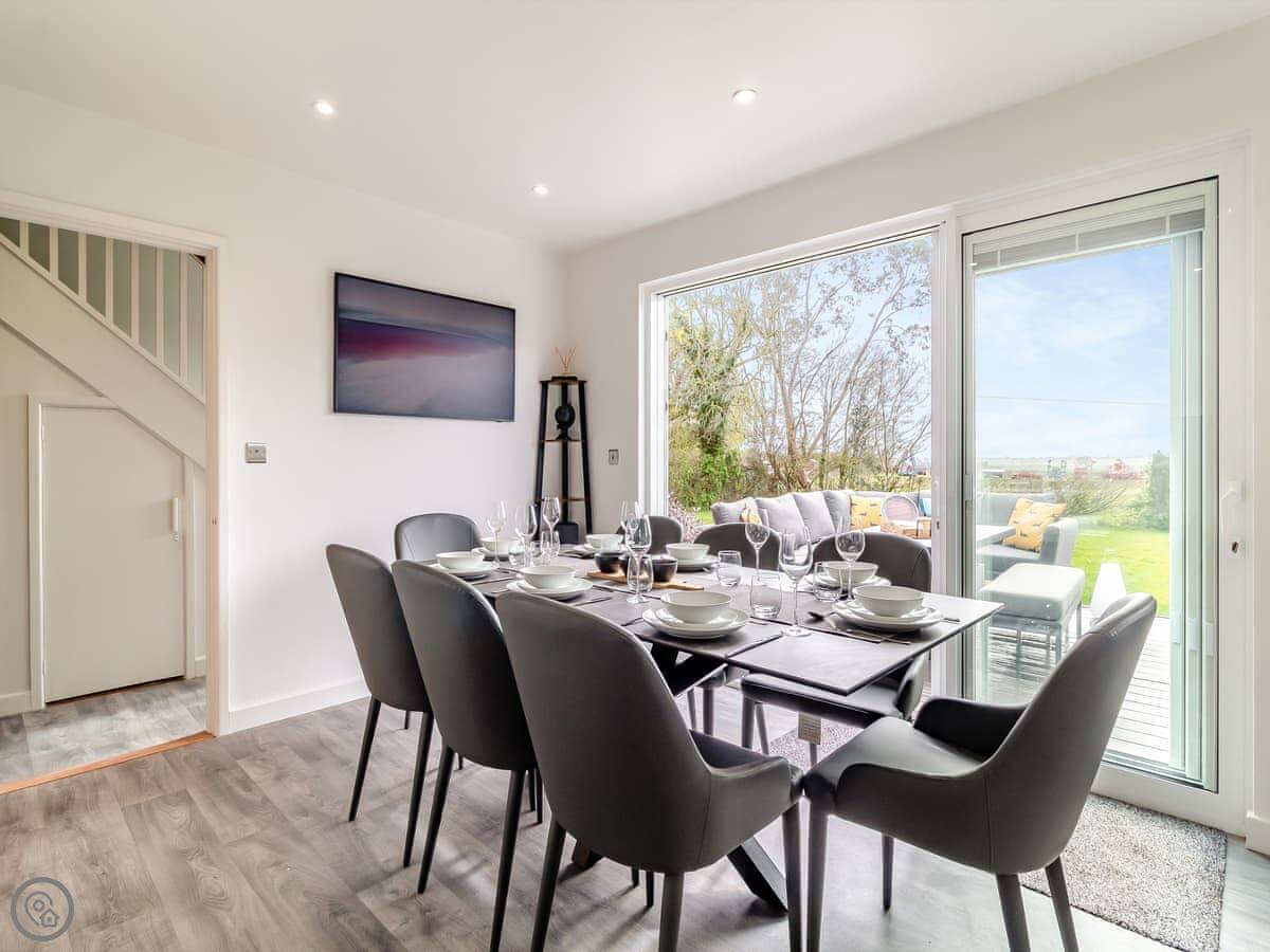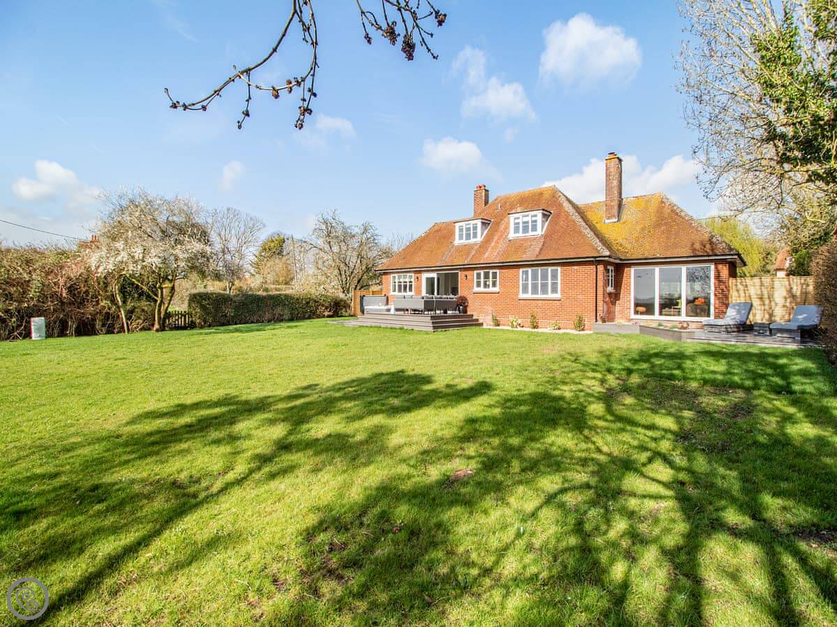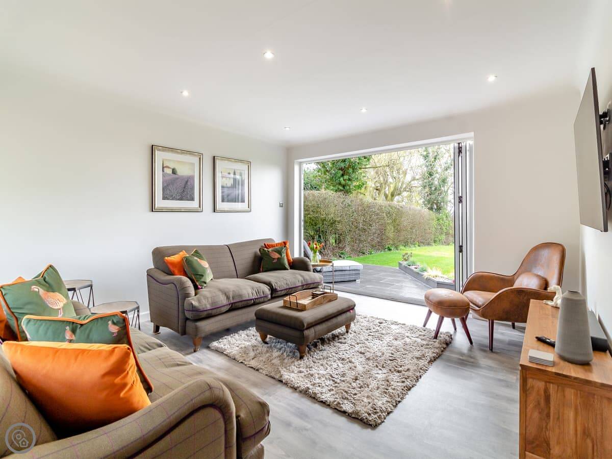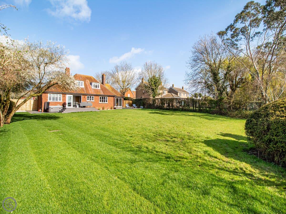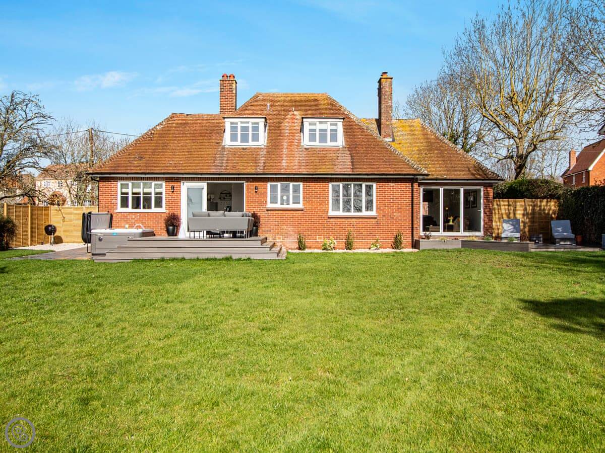 The garden is a good size, enclosed, with a patio and a lawn. There's a hot tub out there. The living room has doors that open onto it. You get a view over fields.